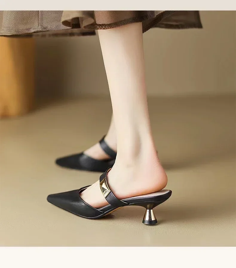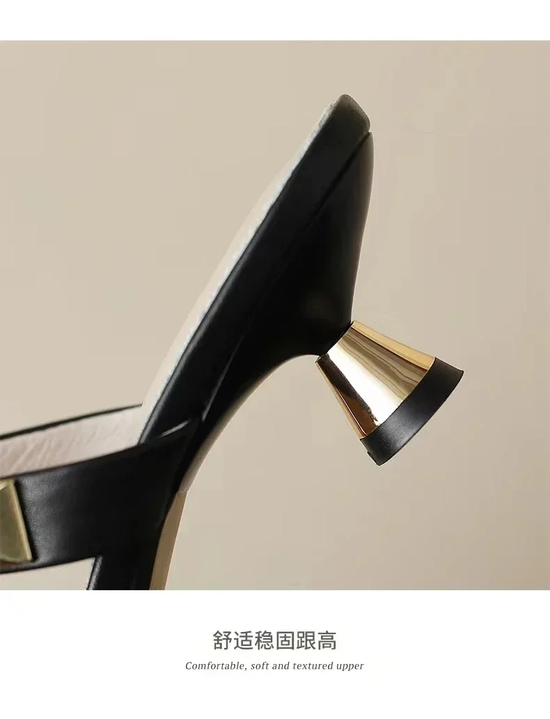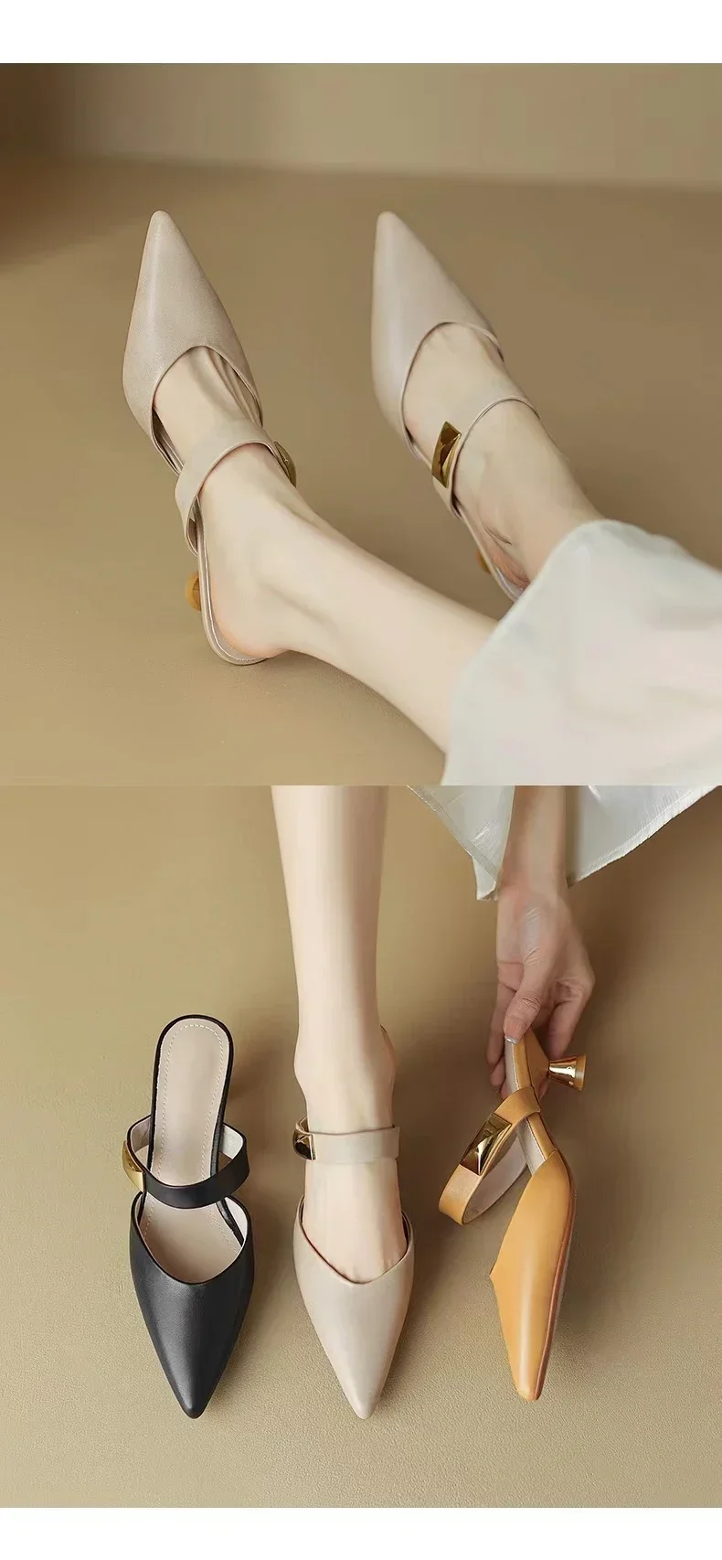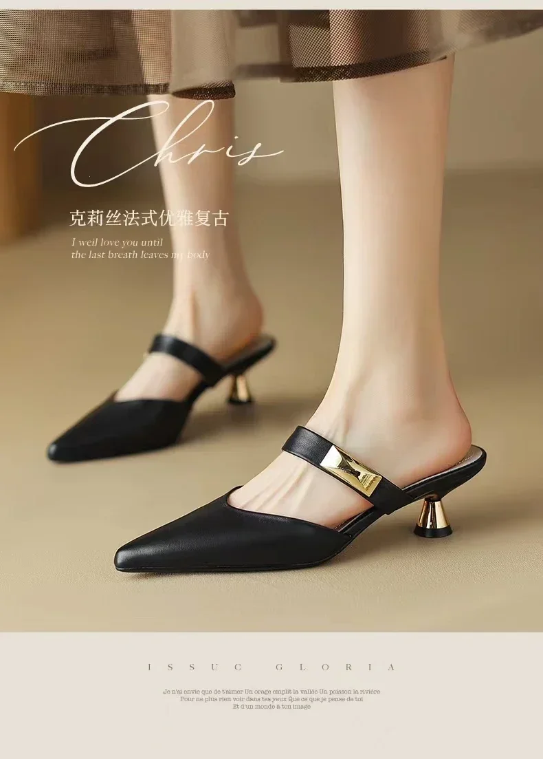 Advbridge Size 35-42 Women Kitten Heels Mules Golden Rivet Pointed Toe Summer Sandals Fashion Beige Ladies Casual Med Heels Shoes