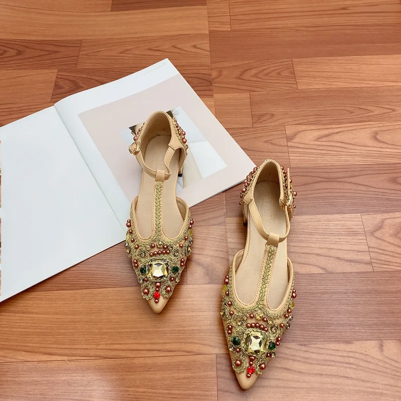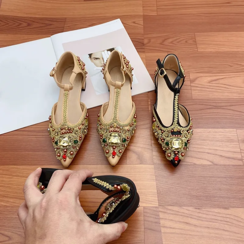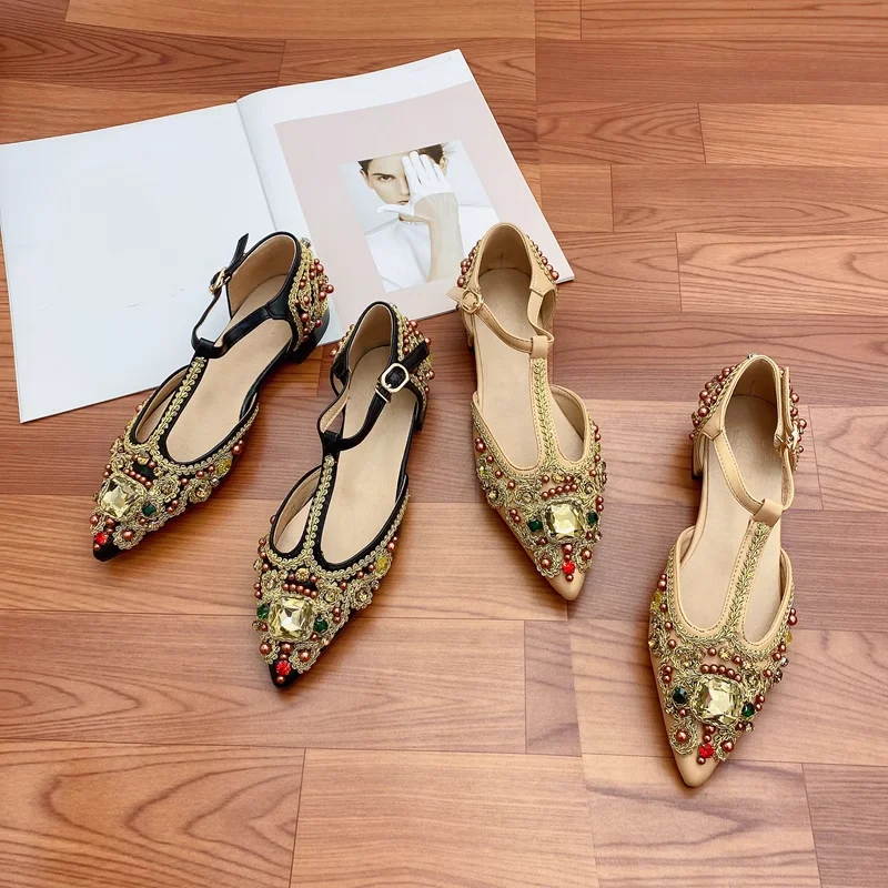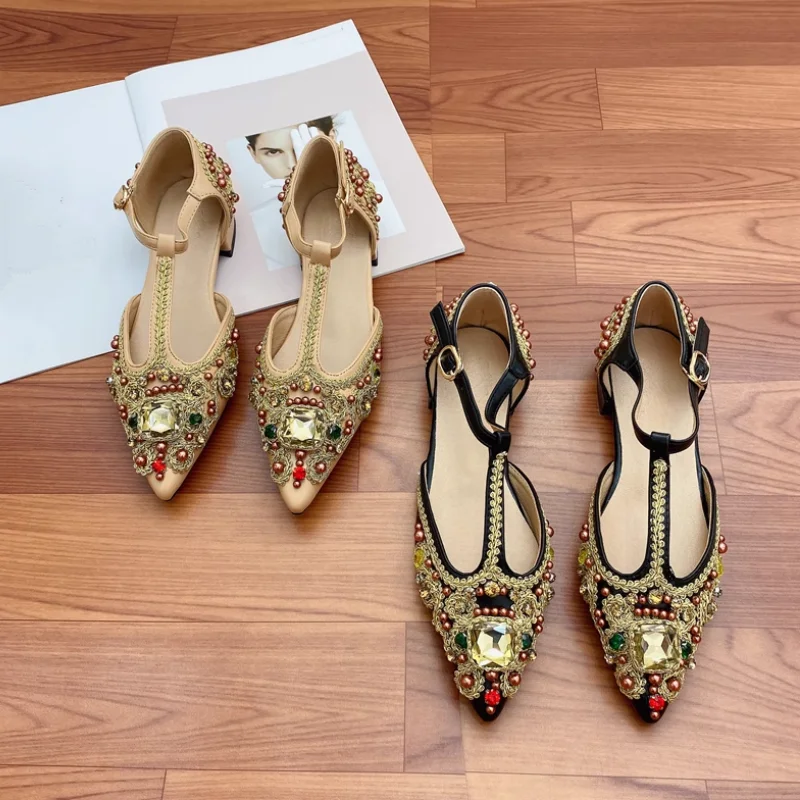 Advbridge Women's Flat Pointed Sandal Low Heel Diamond Women's Beaded Full Diamond Ankle Strap Sandals Single Shoe Women