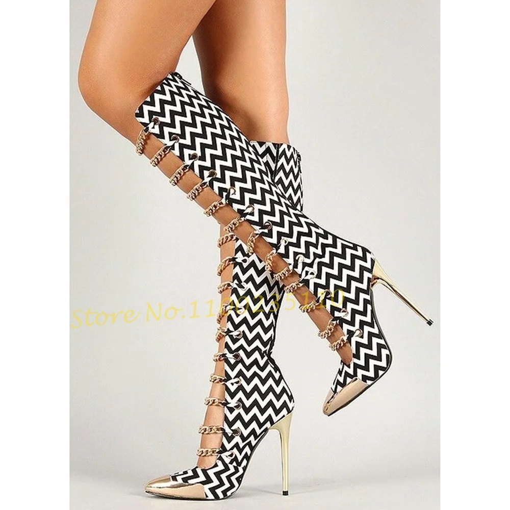 Advbridge Zebra Stripes Chain Gladiator Boots Metal Toe Iron Chain Splicing Sandals Boots White Black Sexy Autumn Fashion Women High Boots