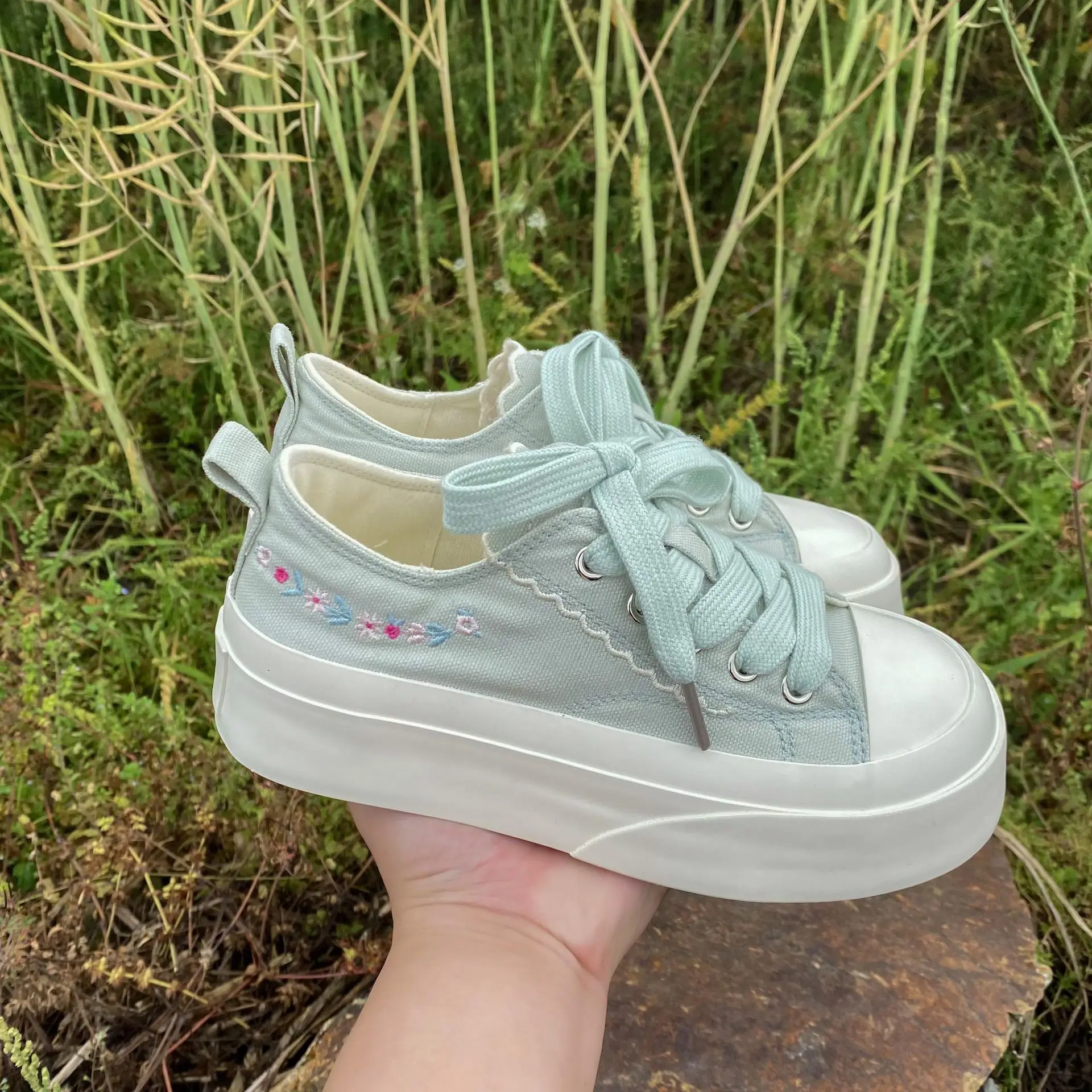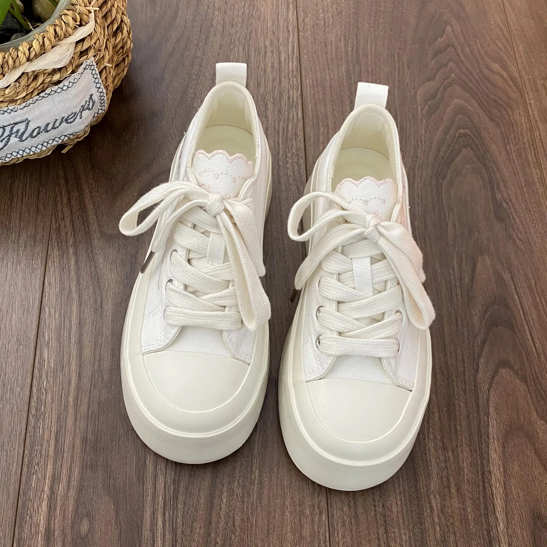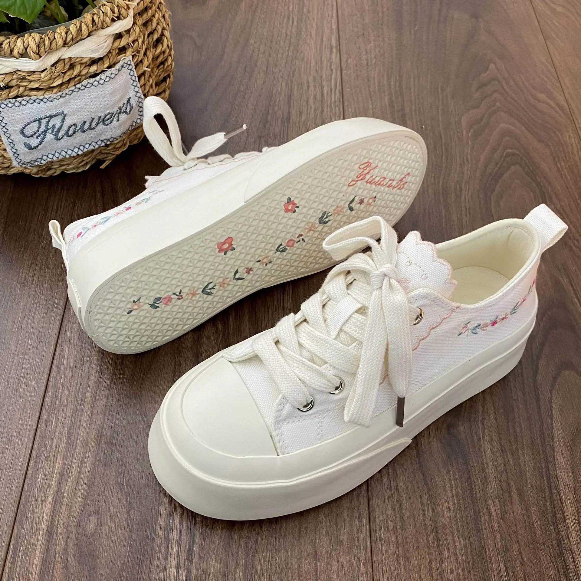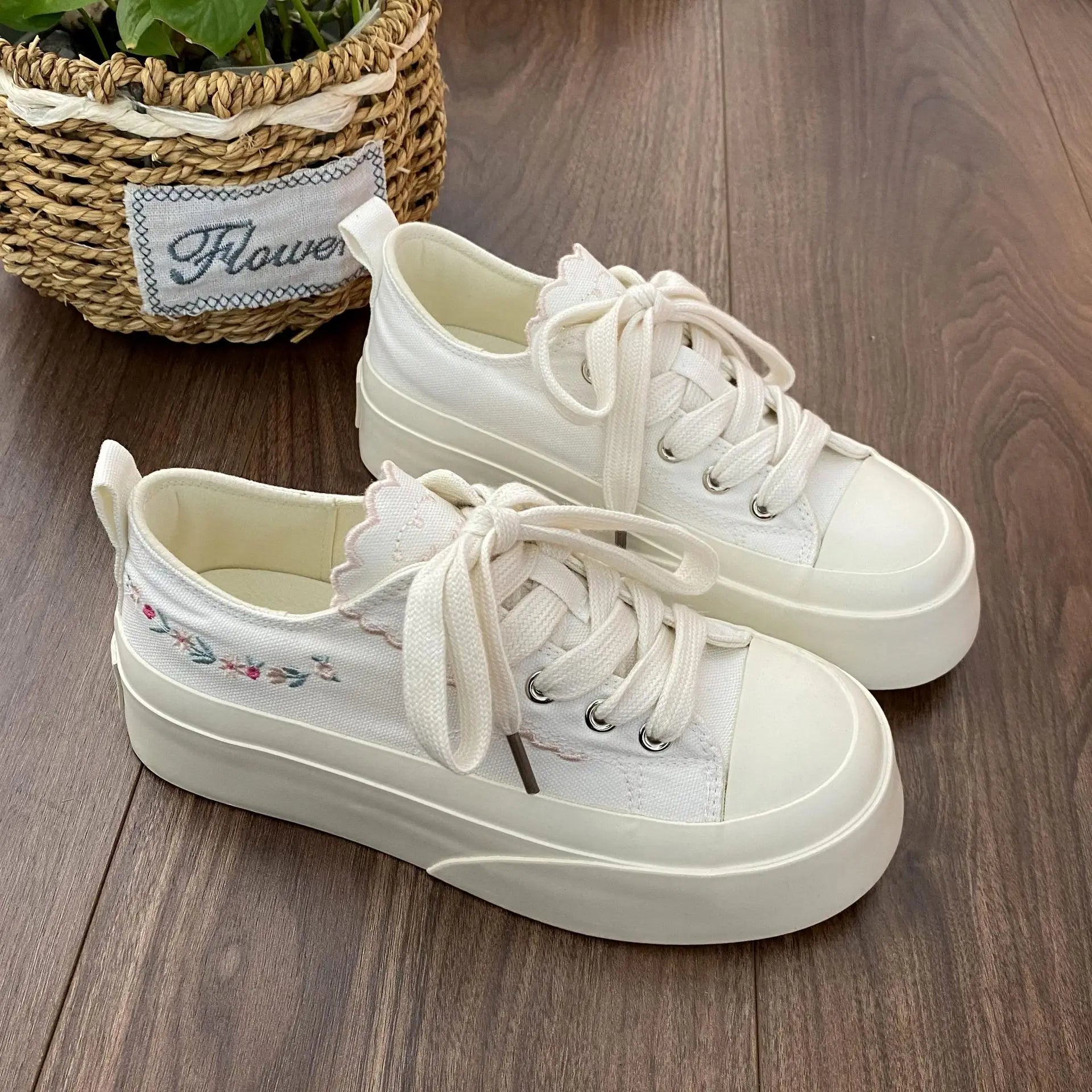 Advbridg Summer Women Low Top Chunky Canvas Sneakers Embroidered Flowers White Shoes Student Casual Skate Shoes Height Increase