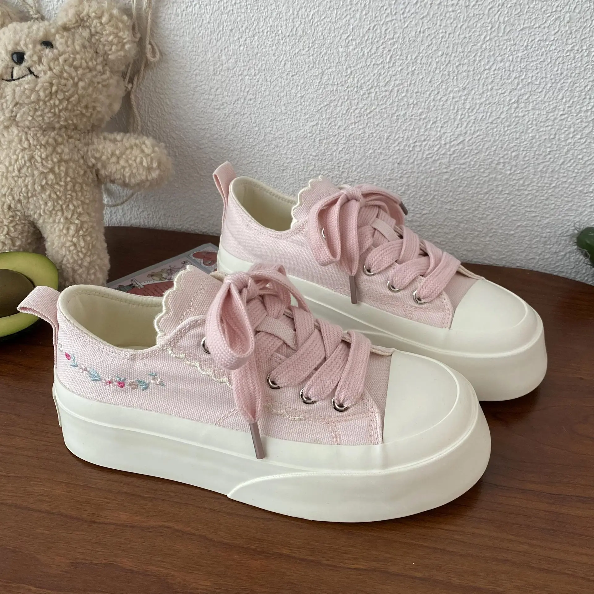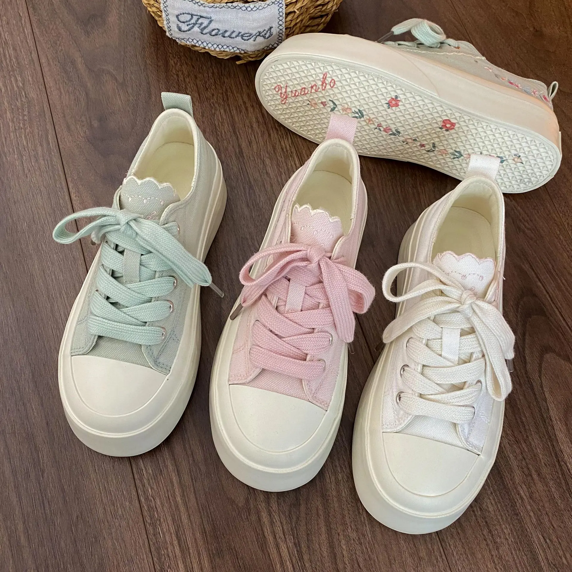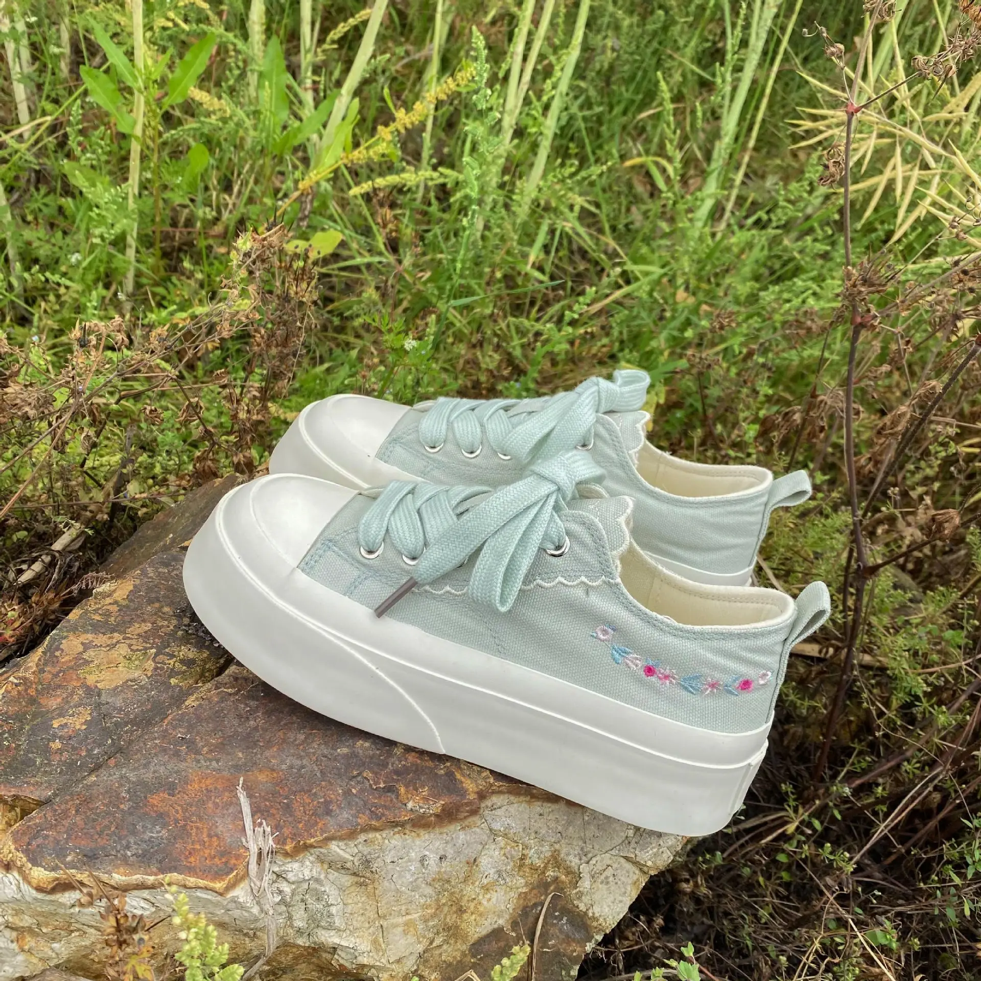 Advbridg Summer Women Low Top Chunky Canvas Sneakers Embroidered Flowers White Shoes Student Casual Skate Shoes Height Increase