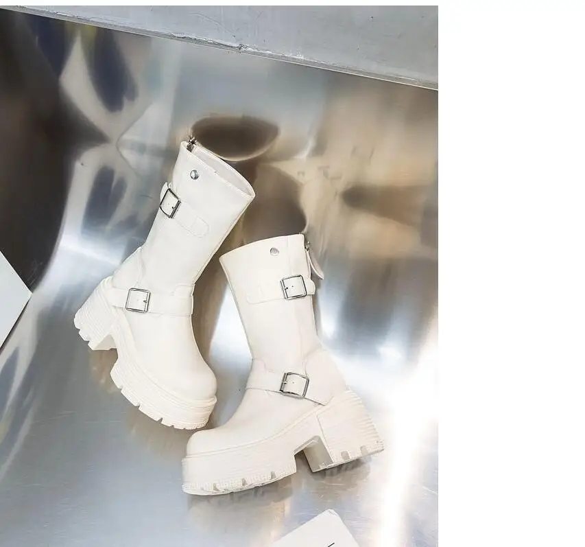 Advbridge 9CM Genuine Leather Women Boots Causal Knee High Boots Shoes Motorcycle Ankle Booties Platform Wedge Thick Sole Buckle Shoes