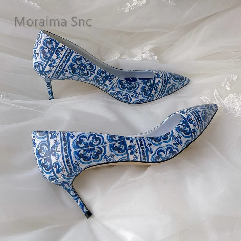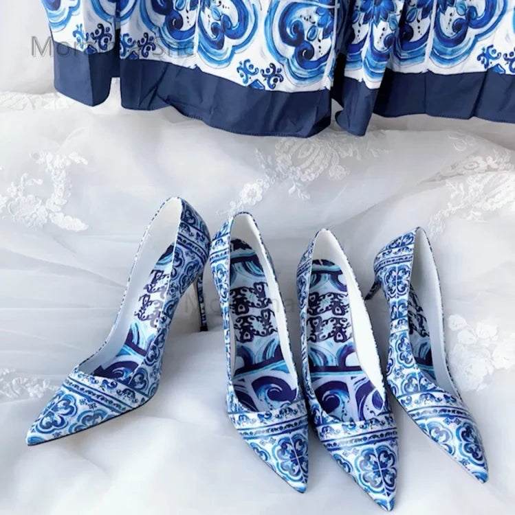 Advbridge Blue and White Porcelain Printed High Heels Women Pupms Pointed Toe Stiletto Single Shoes Banquet Temperament Women's Shoes