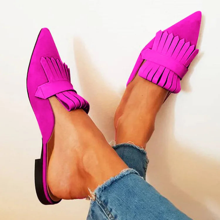 Advbridge Chic Tassel Pointed Toe Low Heels Slipper Woman Purple Green Suede Slip On Woman Fringe Mules Slingbacks Shoes