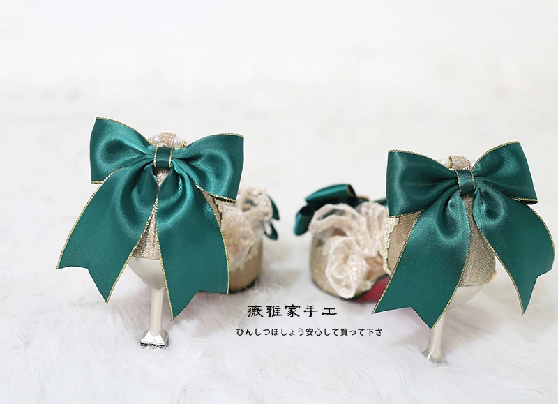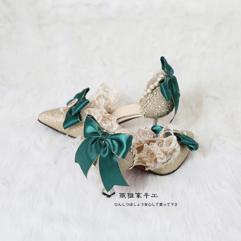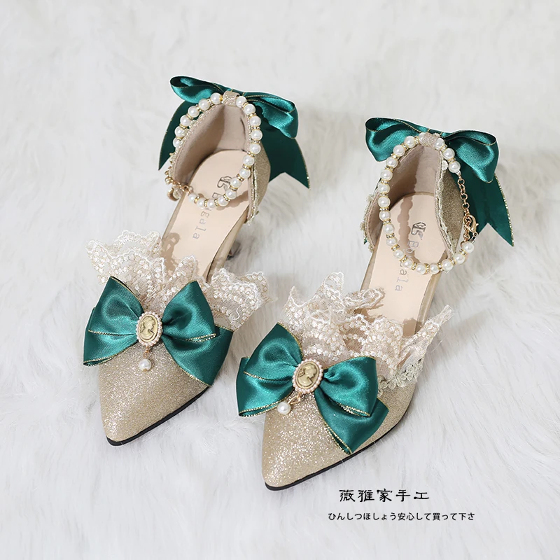 Advbridge Elegant Girls Victoria Princess Green Satin Bowknot Lolita Shoes Painting Woman Lace Pointed Sandals High Heel Cos Lolita Shoes