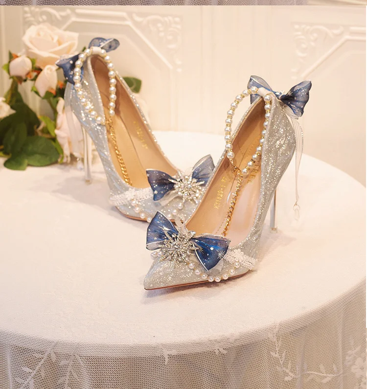 Advbridge Elegant Retro Lolita Court Style Lolita Flower Wedding Gorgeous Satin Bow Pearl Gem Ribbon Bowknot 7.5-10.5cm High Heels Shoes