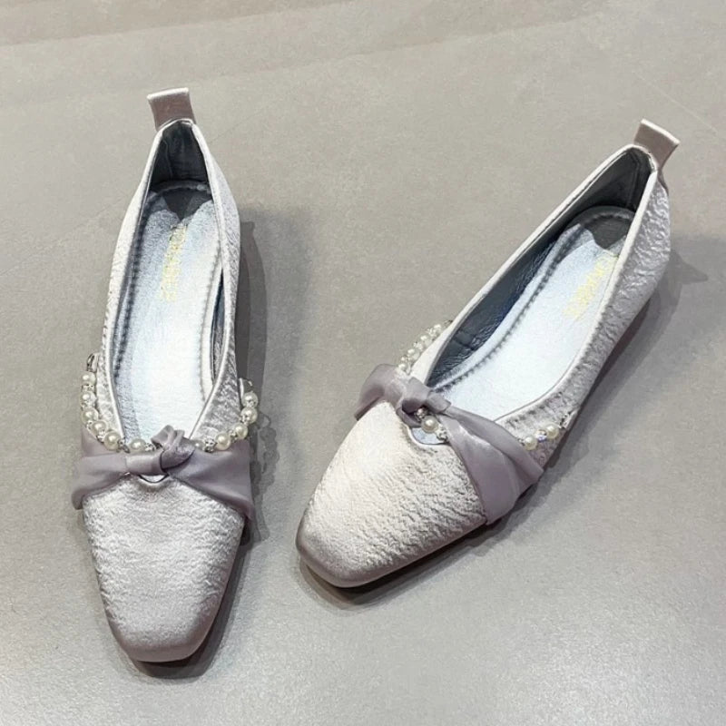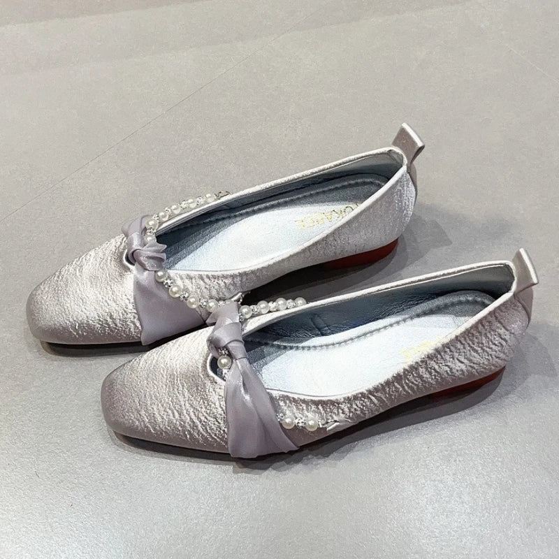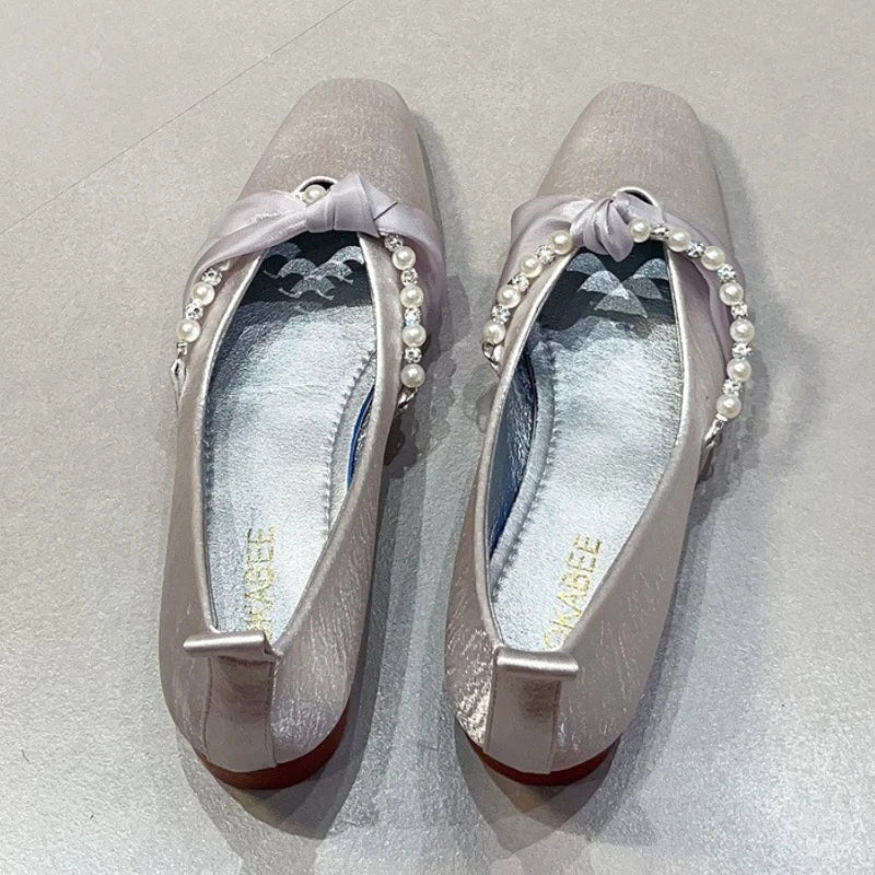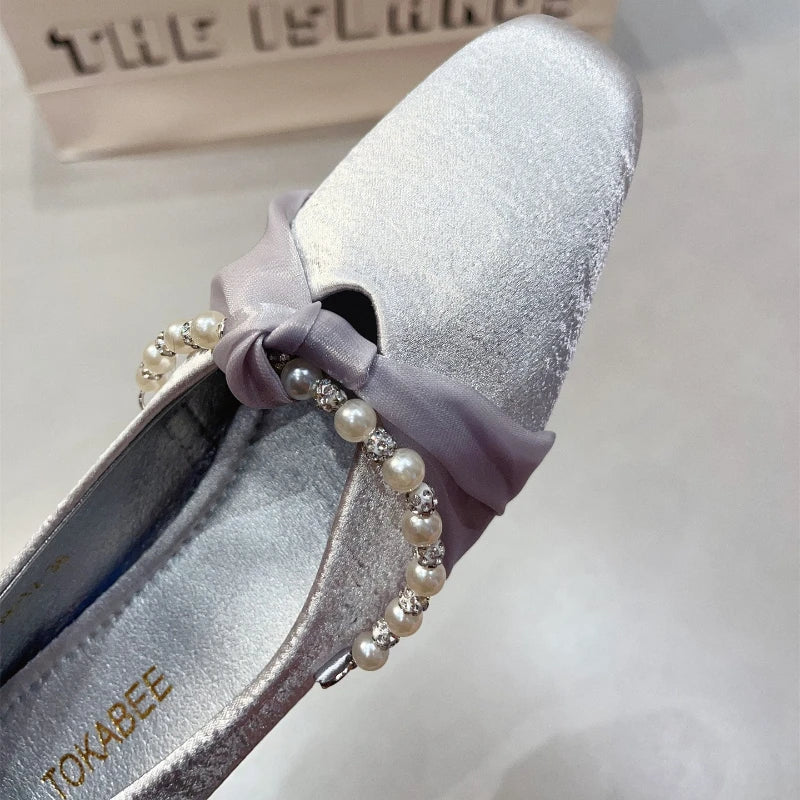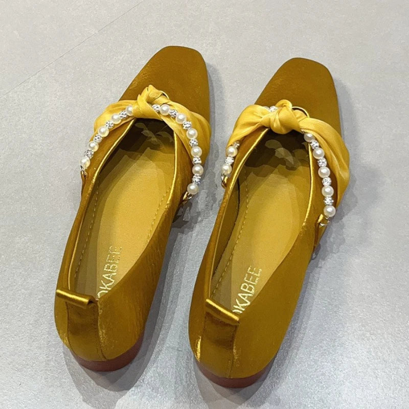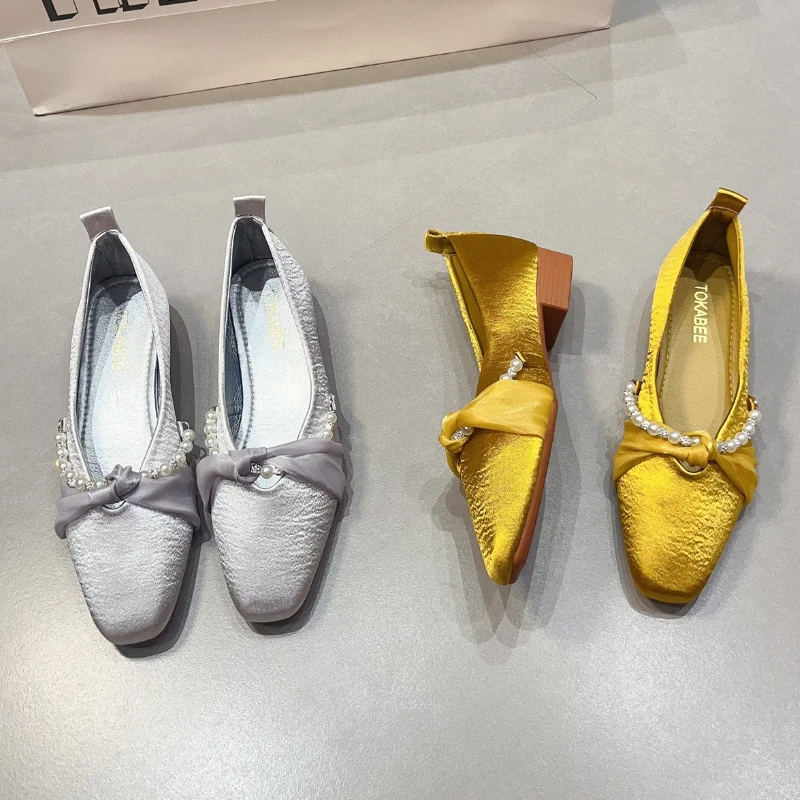 ADVBRIDGE  - Elegant String Bead Silk Ribbon Knot Design Low Heel Mary Jane Shoes Woman French Style Yellow Square Toe Chunky Heel Loafers