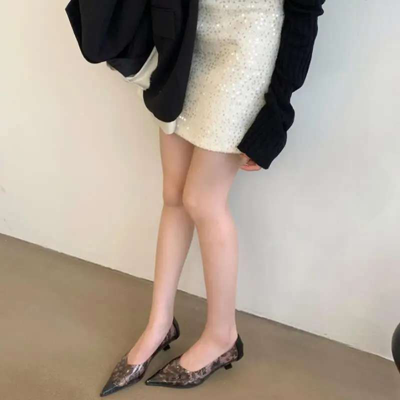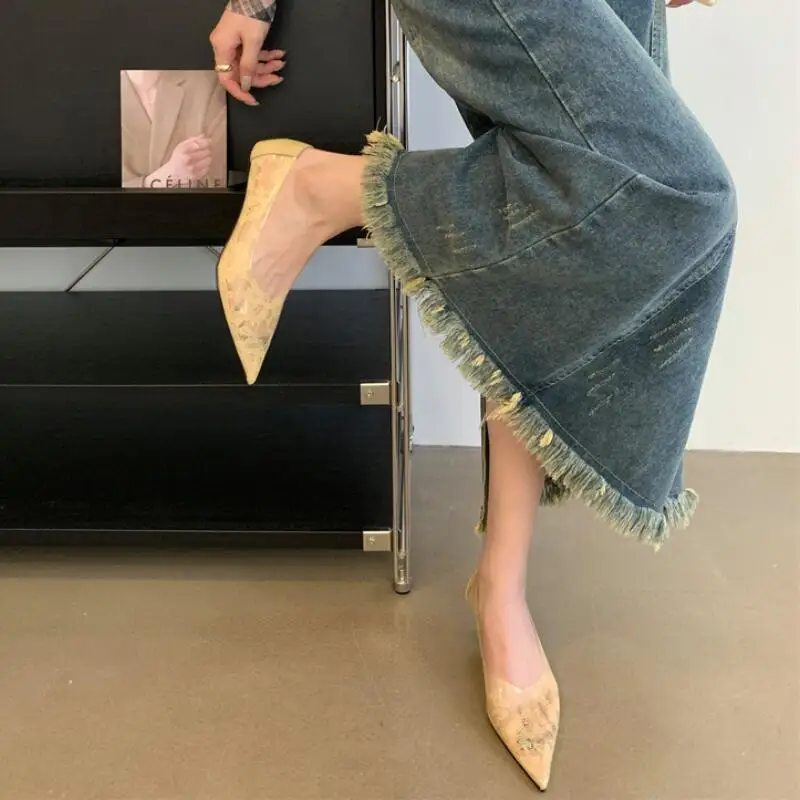 Advbridge - Fashion PVC Transparent Heels Pumps Women Pointed Toe Printing Slip-On Shoes Ladies Shallow Elegant Middle Heel Footwear