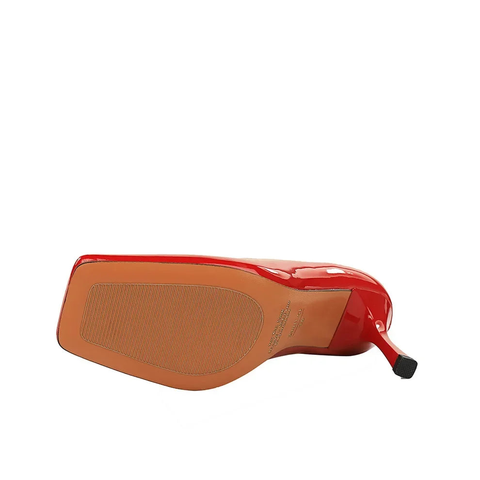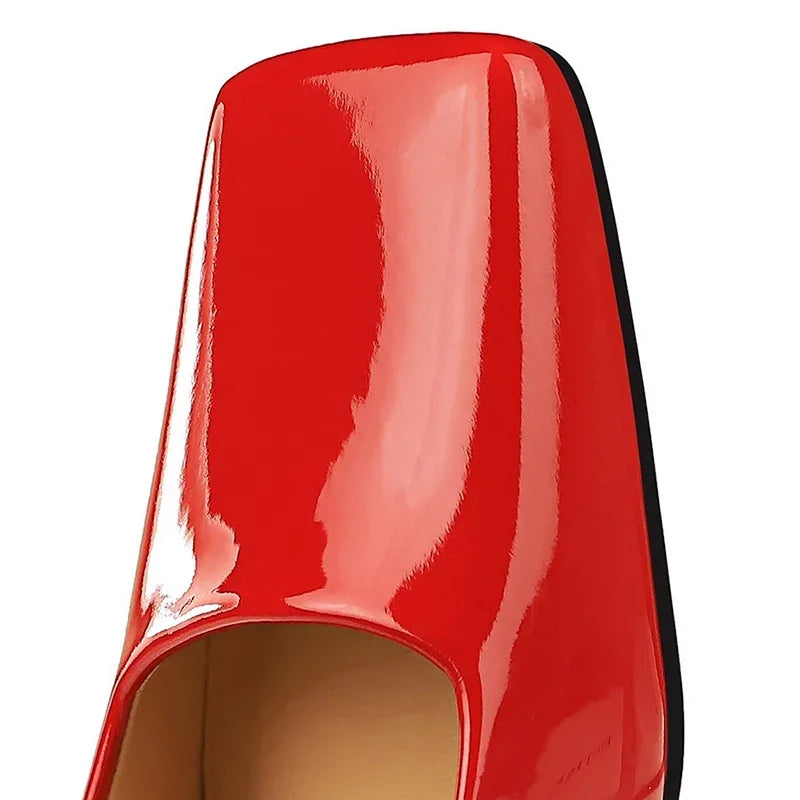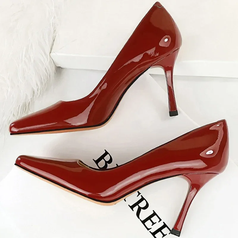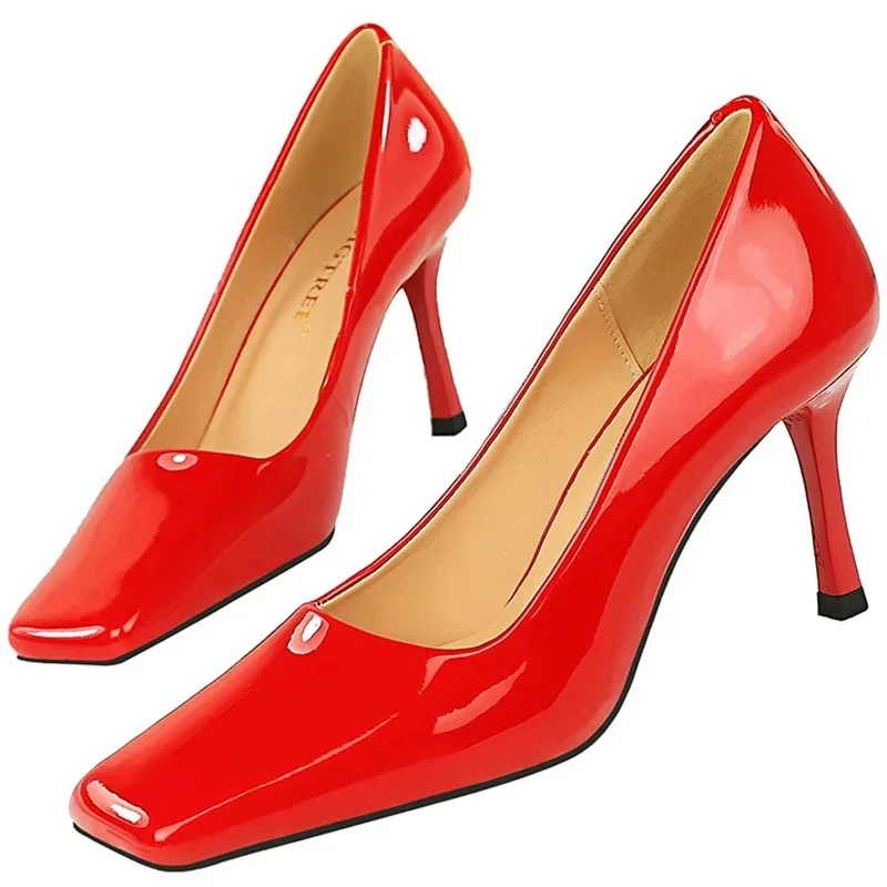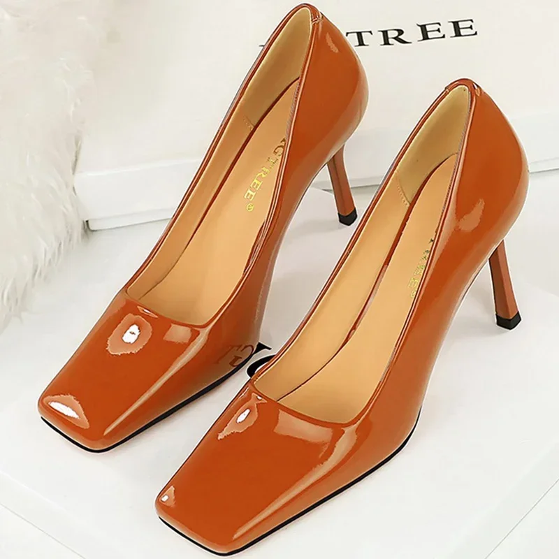 Advbridge Fashion Women 8.5cm High Heels Pumps Brown Glossy Leather Shallow Stiletto Heels Lady Wine Red Nude Office Square Toe Prom Shoes
