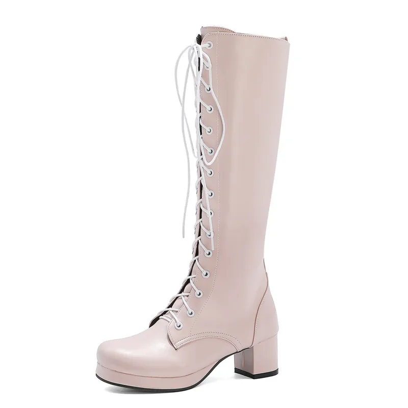 Advbridge Fashion Women's High Knee Boots Winter Shoes Woman Lovely Sweet Lace Up Purple Pink White Lolita Shoes Girls Boots Large Size 48