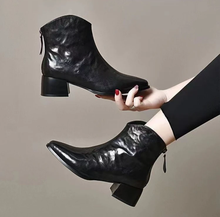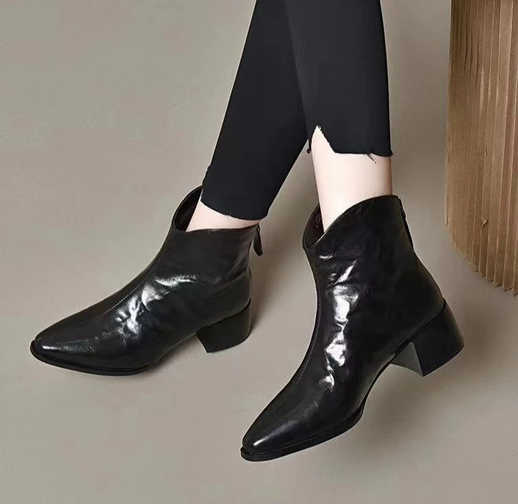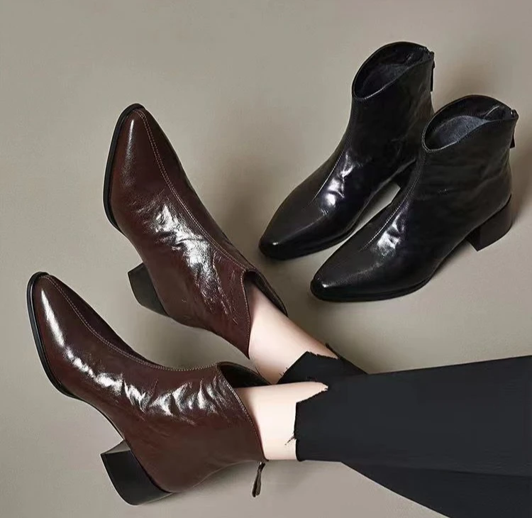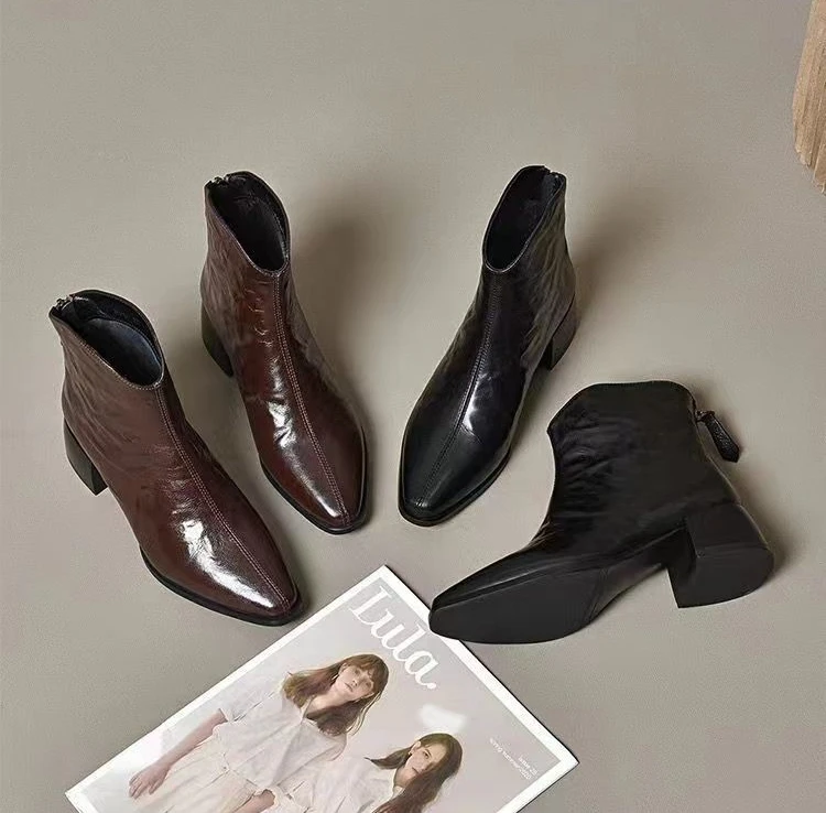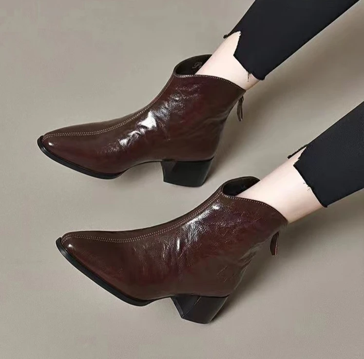 Advbridge Female Short Shoes Pointed Toe Brown Fur Leather Booties Elegant with Medium Heels Women's Ankle Boots Sale Y2k Autumn Chic Boot