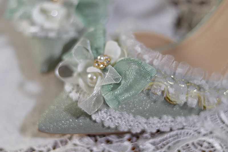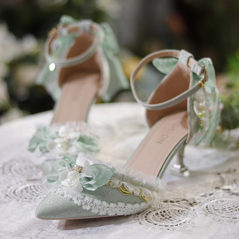 Advbridge French Idyllic Style Lolita Girls Shoes Sweet Cute Pointed Sandals Ribbon Bowknot Lace Ruffle Pearls Flower Gems 7cm High Heeled