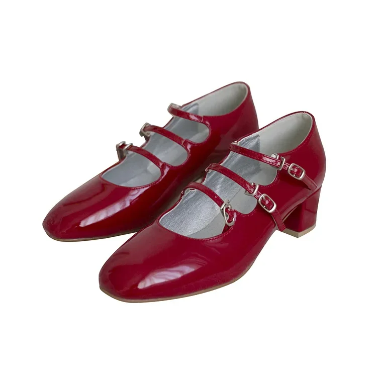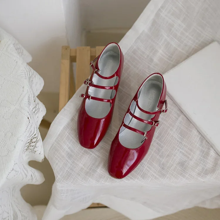 Advbridge French Marie Red Shoes Wedding Shoes Shallow V-Shape Buckle Vintage Thick Heel Genuine Leather Flats Women's Shoes Summer