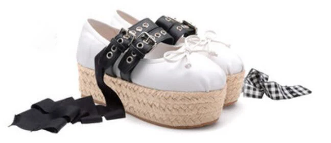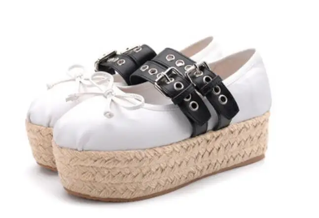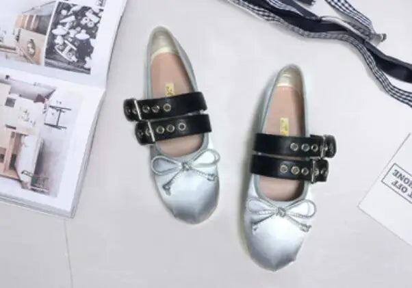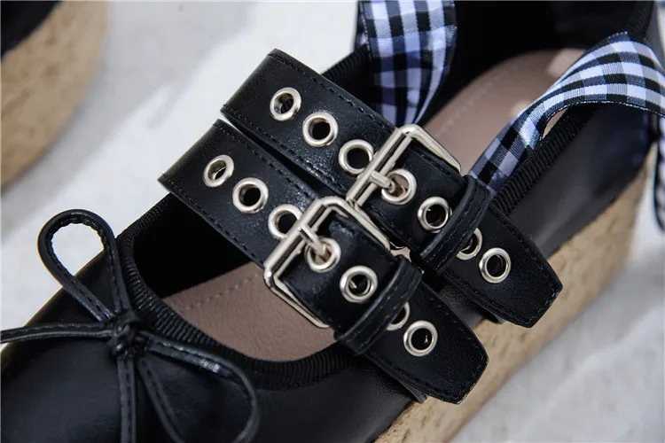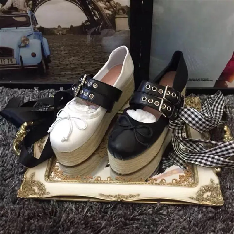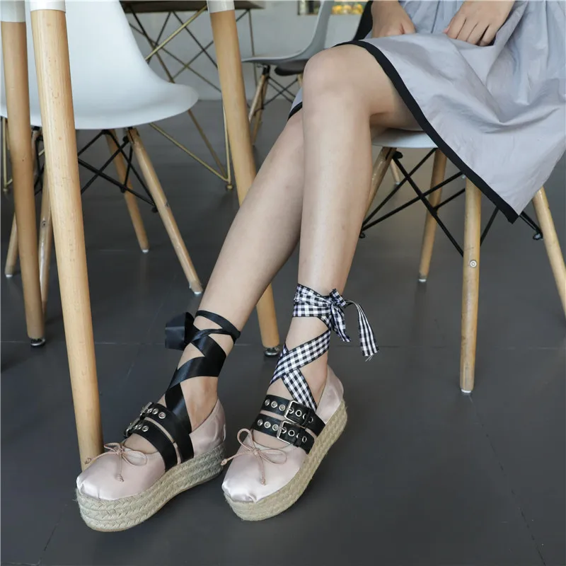 Advbridge Girl's Bowtie Rope Braided Platform Silk Ballet Flats Shoes Woman Double Buckle Graid Riband Bandage Round Toe Fishman Shoes