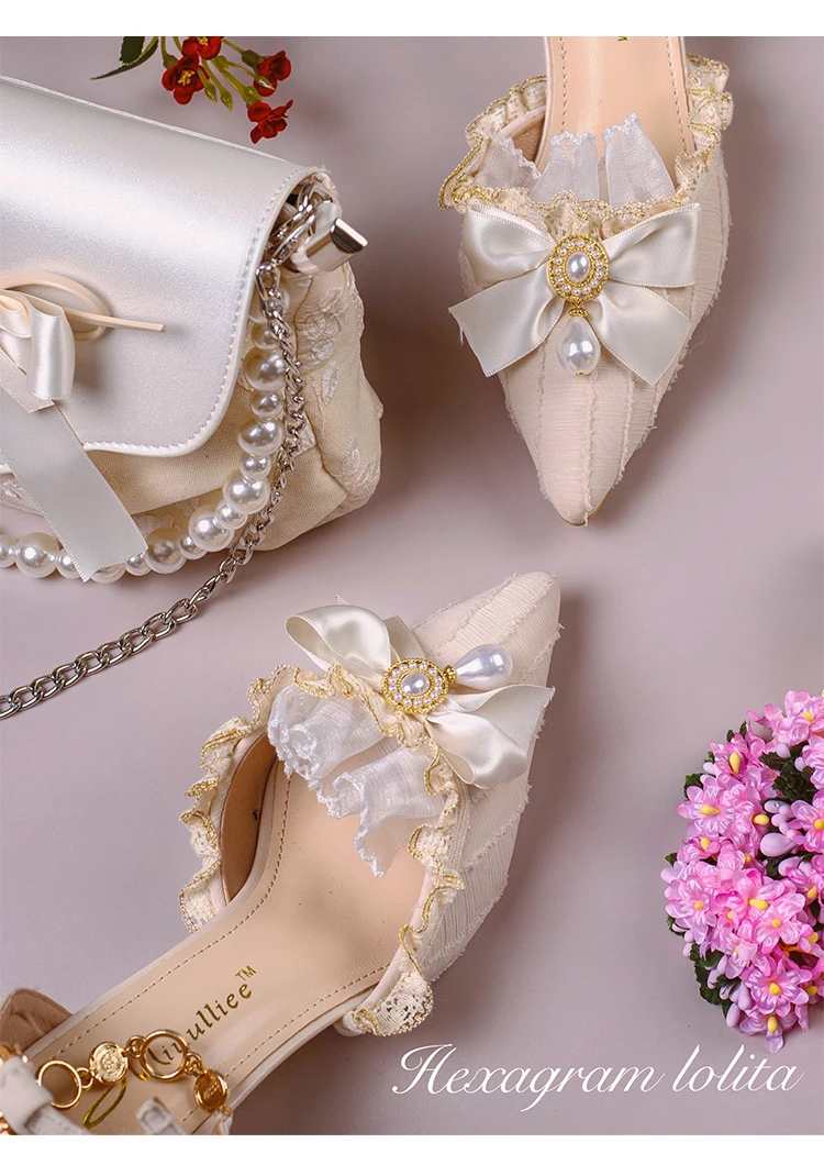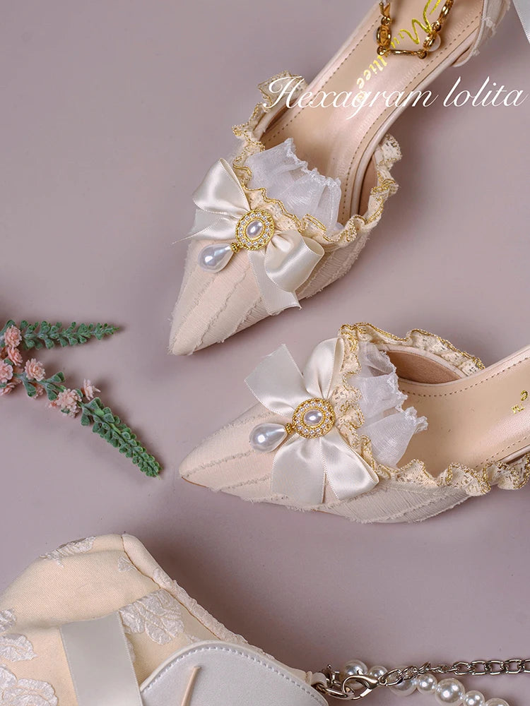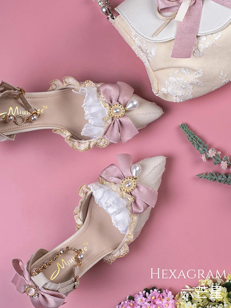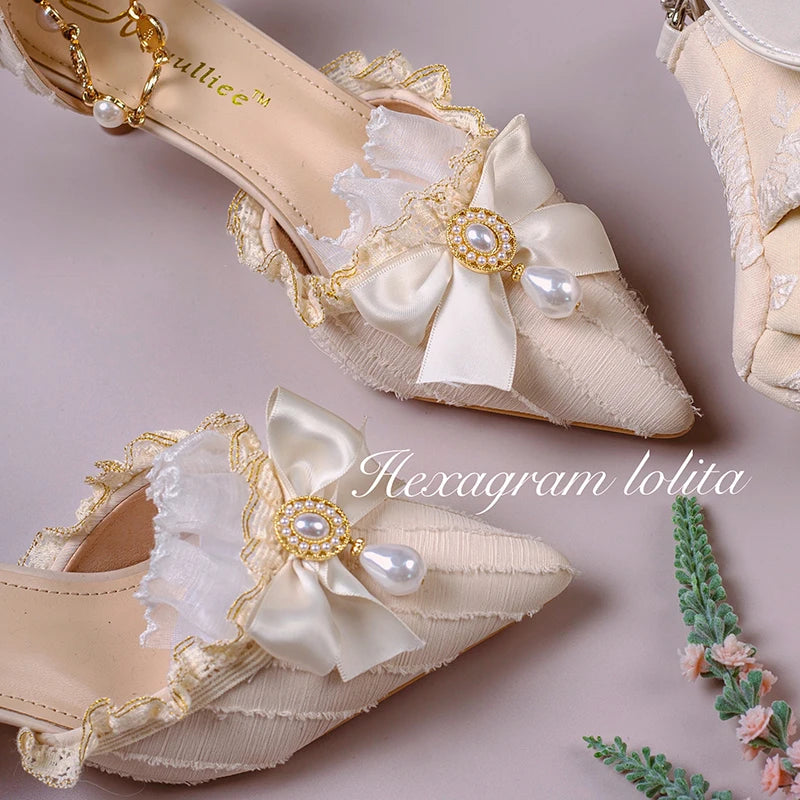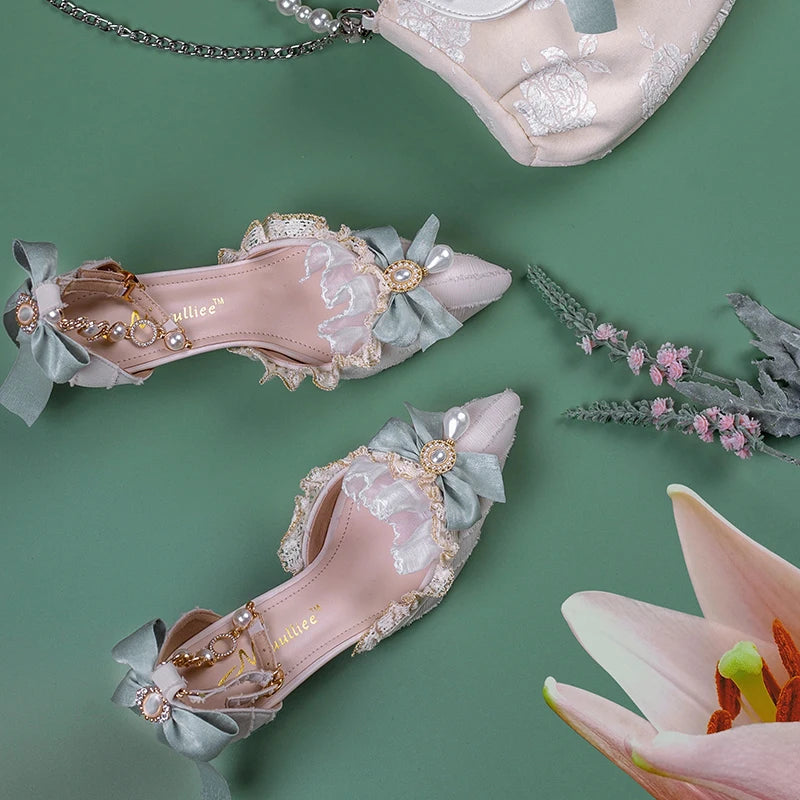 Advbridge Gorgeous Elegant Retro Court Style Cosplay Lolita Victorian Girl Lace Ruffled Pearl Gem Bow Pointed 7cm High Heeled Shoes