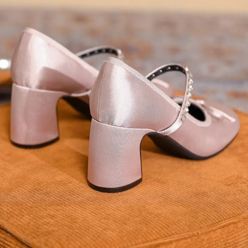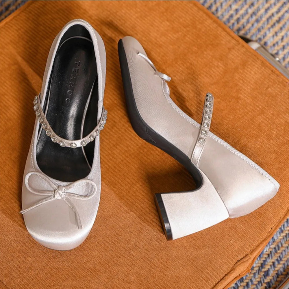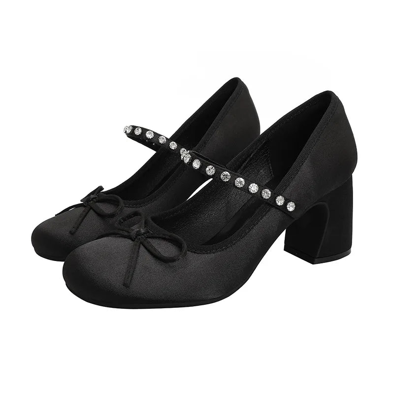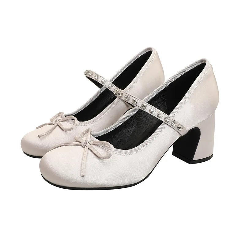 ADVBRIDGE - High Heels Women's Spring/Autumn New Butterfly Knot Water Diamond Strap Womens Shoes Round Head Mary Jane Single Shoes Women