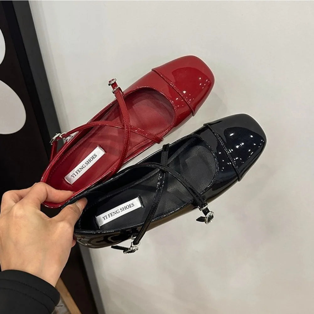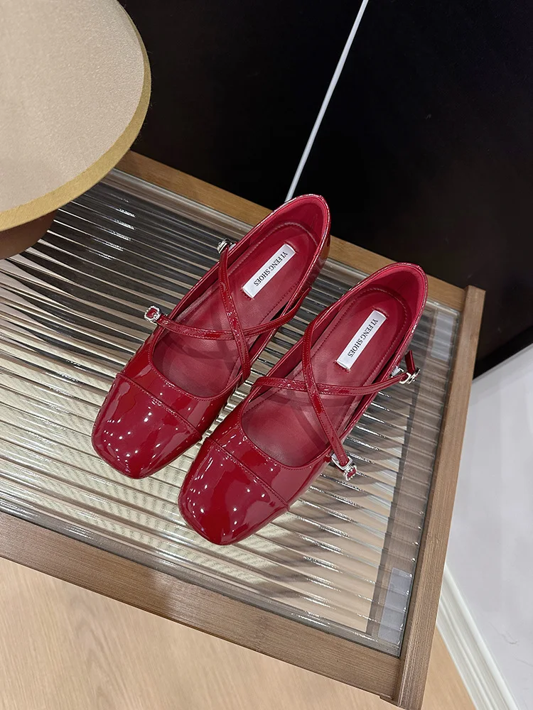 ADVBRIDGE - Lacquer Leather Square Toe Red Mary Jane Shoes for Women's 2025 Spring Height Increasing Ballet Cross Buckle Strap Pumps Women