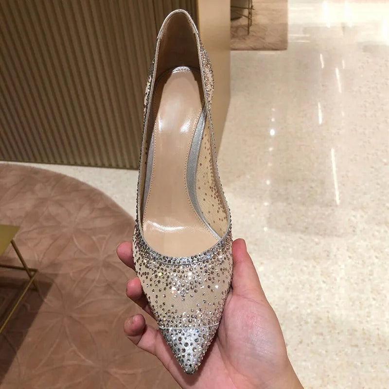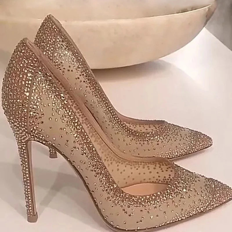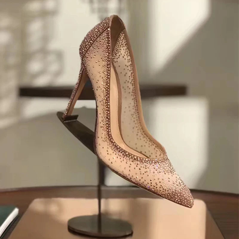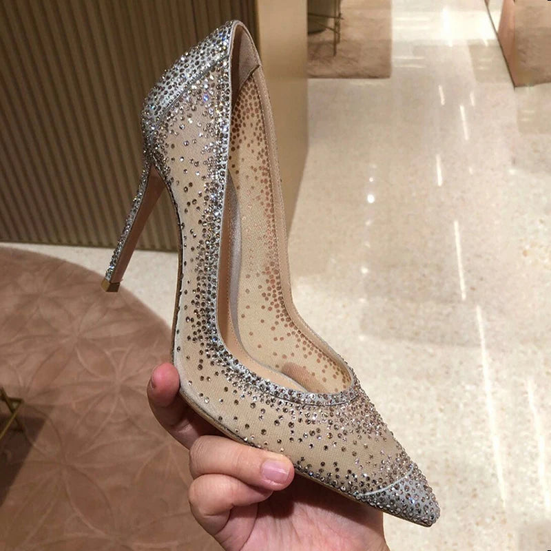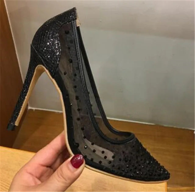 Advbridge Ladies Glitter Rhinestone Mesh Bling heels Pumps Summer Pointed toe Nude Black Mesh Crystal Sequined High Heels Wedding Shoes