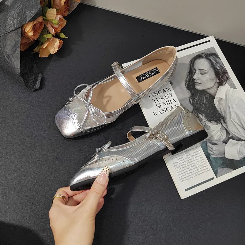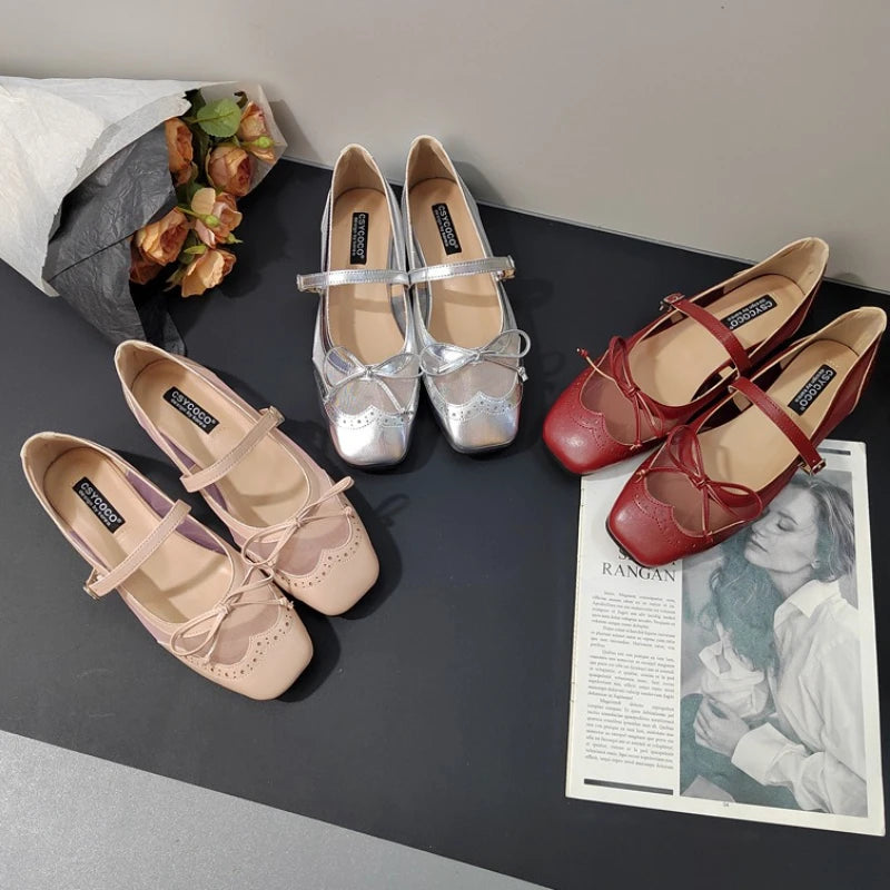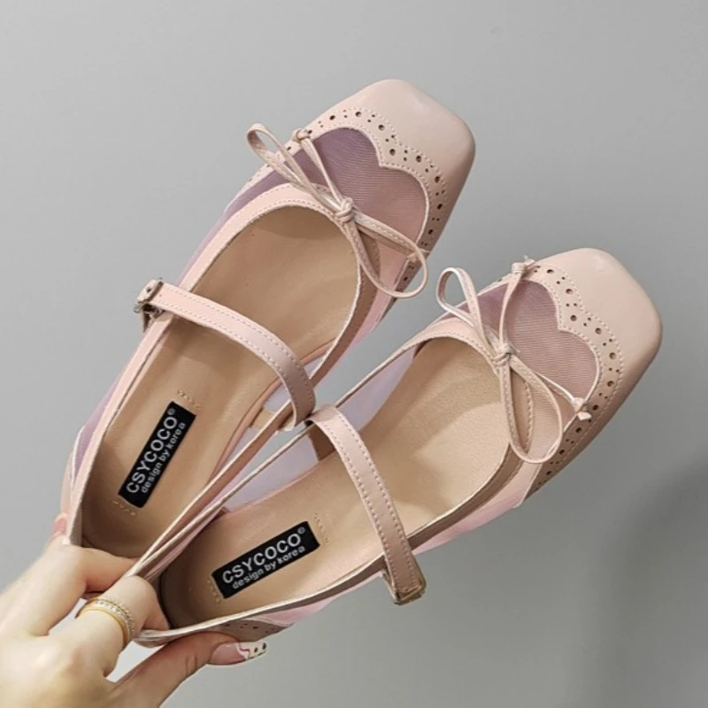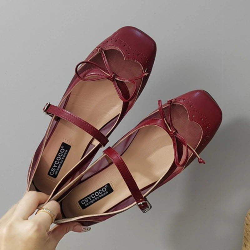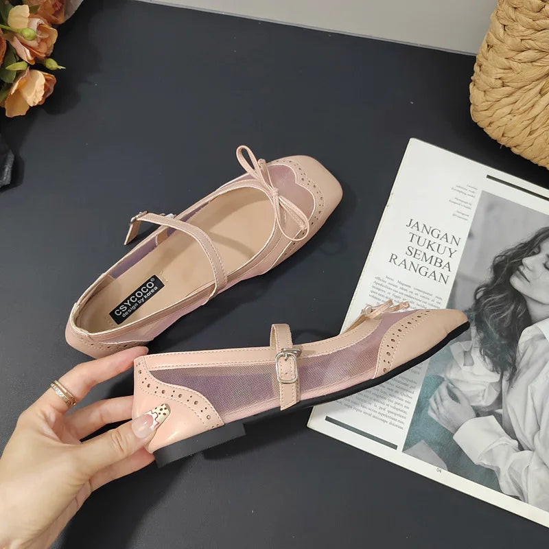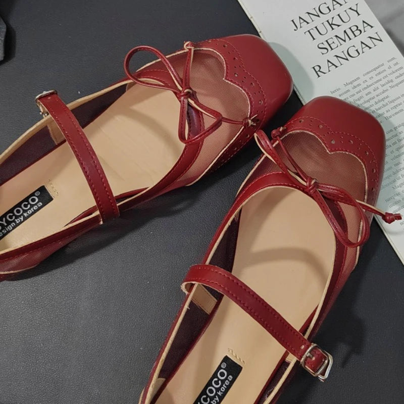 ADVBRIDGE  - Leather Mesh Patchwork Designer Mary Jane Shoes Woman Elegant Red Bow Square Toe Ballet Flats Comfortable Breathable Flat Shoes
