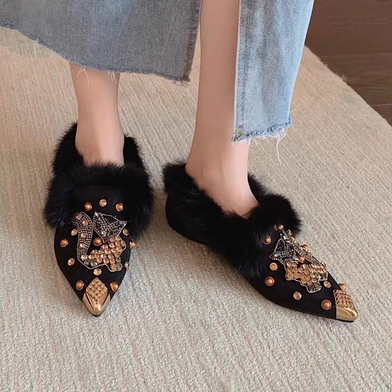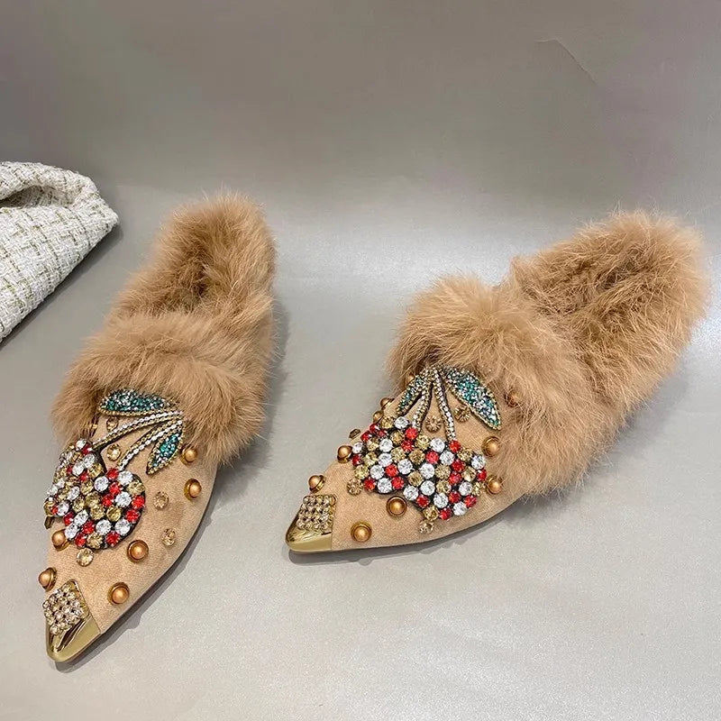 Advbridge New Rabbit Fur Pearl Multi Cystal Cherry Fox Flats Loafers Crystal Studs pointy toe Winter Fur Causal Shoes Woman Footwear