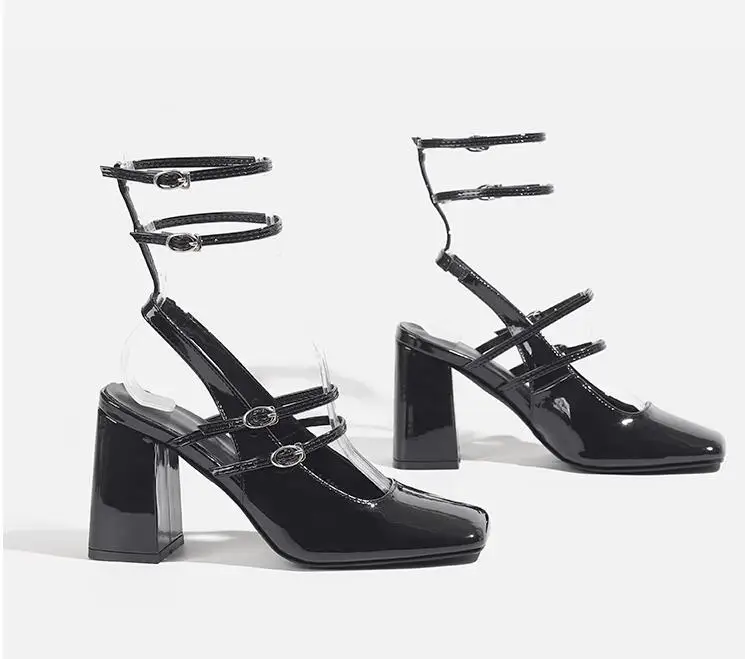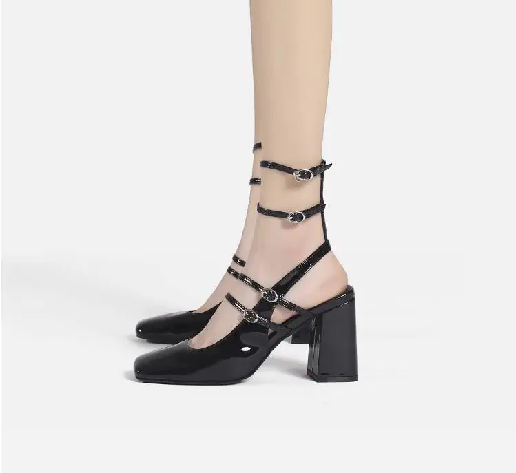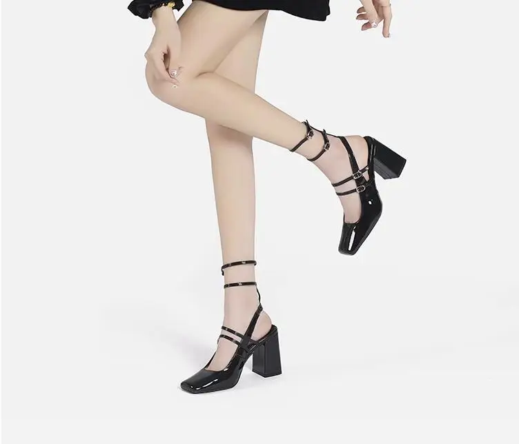 Advbridge New Retro French Square Toe Women High Heel Pumps Sexy Strappy Buckle Black Sandals Chunky High Heels Party Shoes