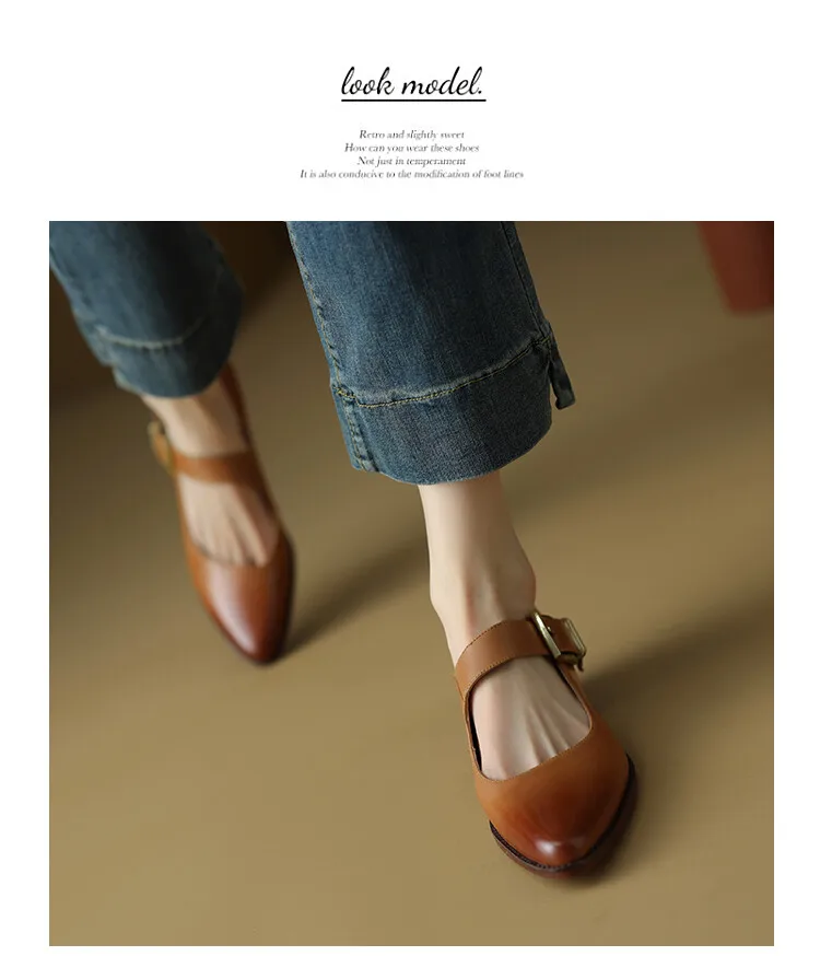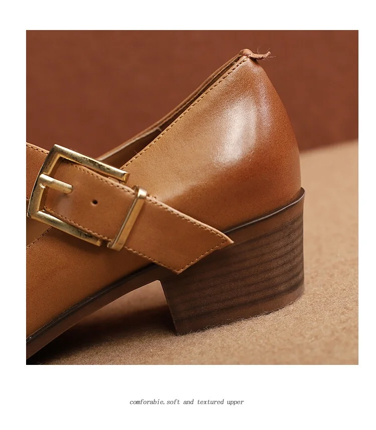 Advbridge NEW Spring/Fall Women Pumps Genuine Leather Shoes for Women Pointed Toe Chunky Shoes Mid-Heel Mary Janes Retro Belt Buckle Shoes
