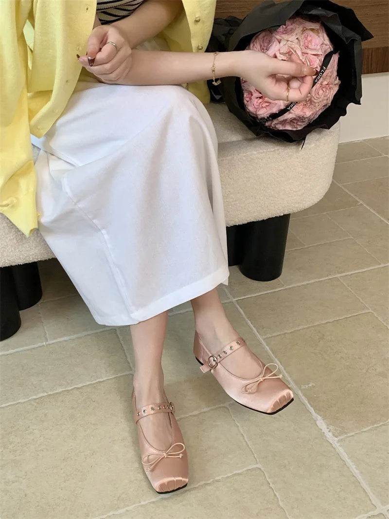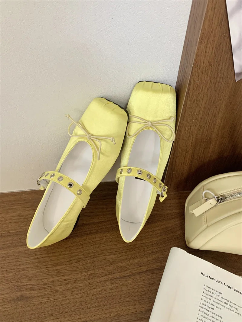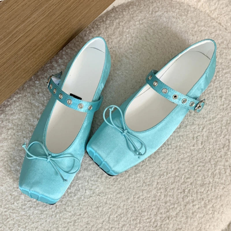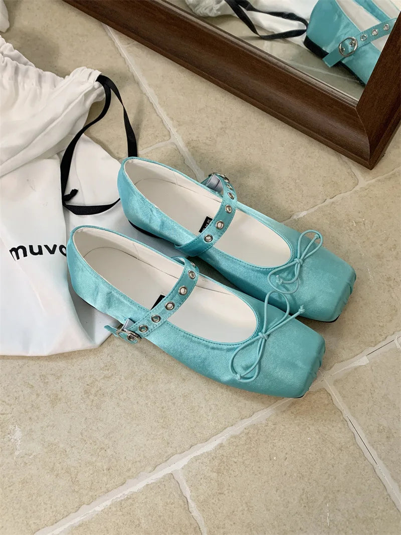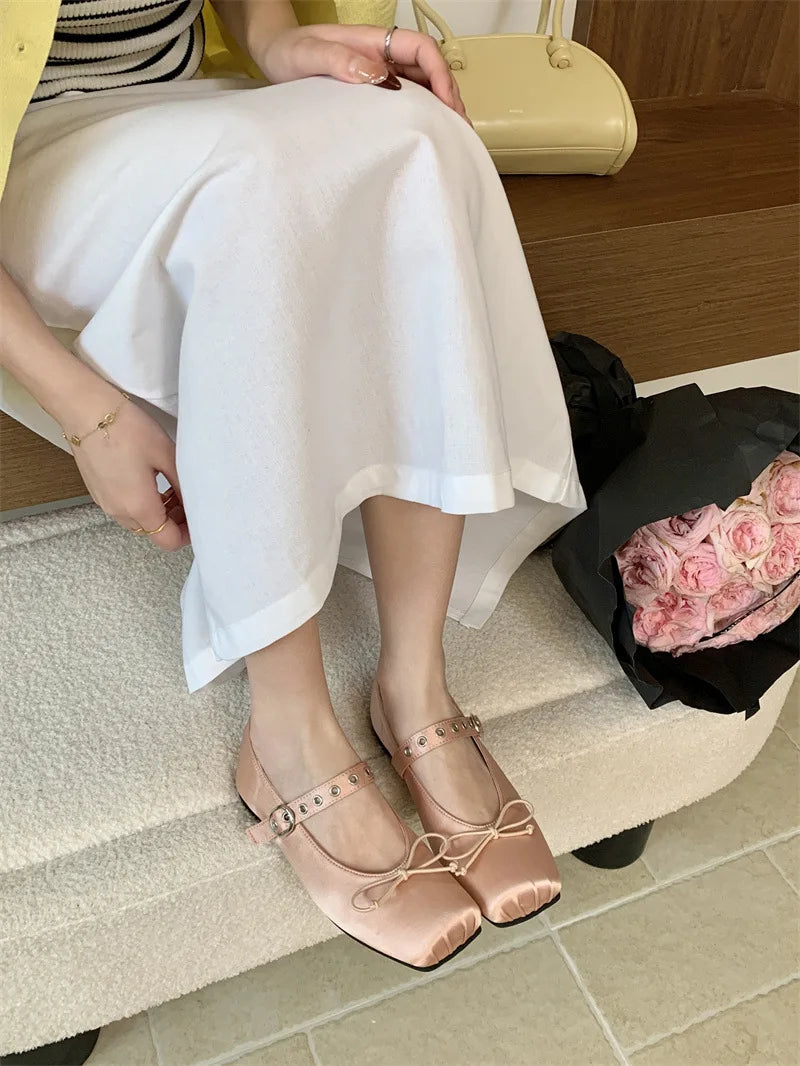 ADVBRIDGE - Satin Square Toe Mary Jane Shoe Women Shallow Buckle Bowknot Footwear Ladies Fashion Light Comfort Soft Sole Ballet Flats Women