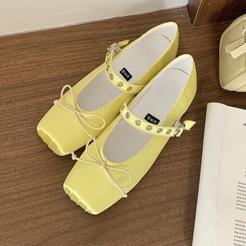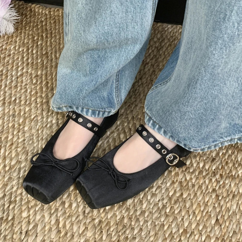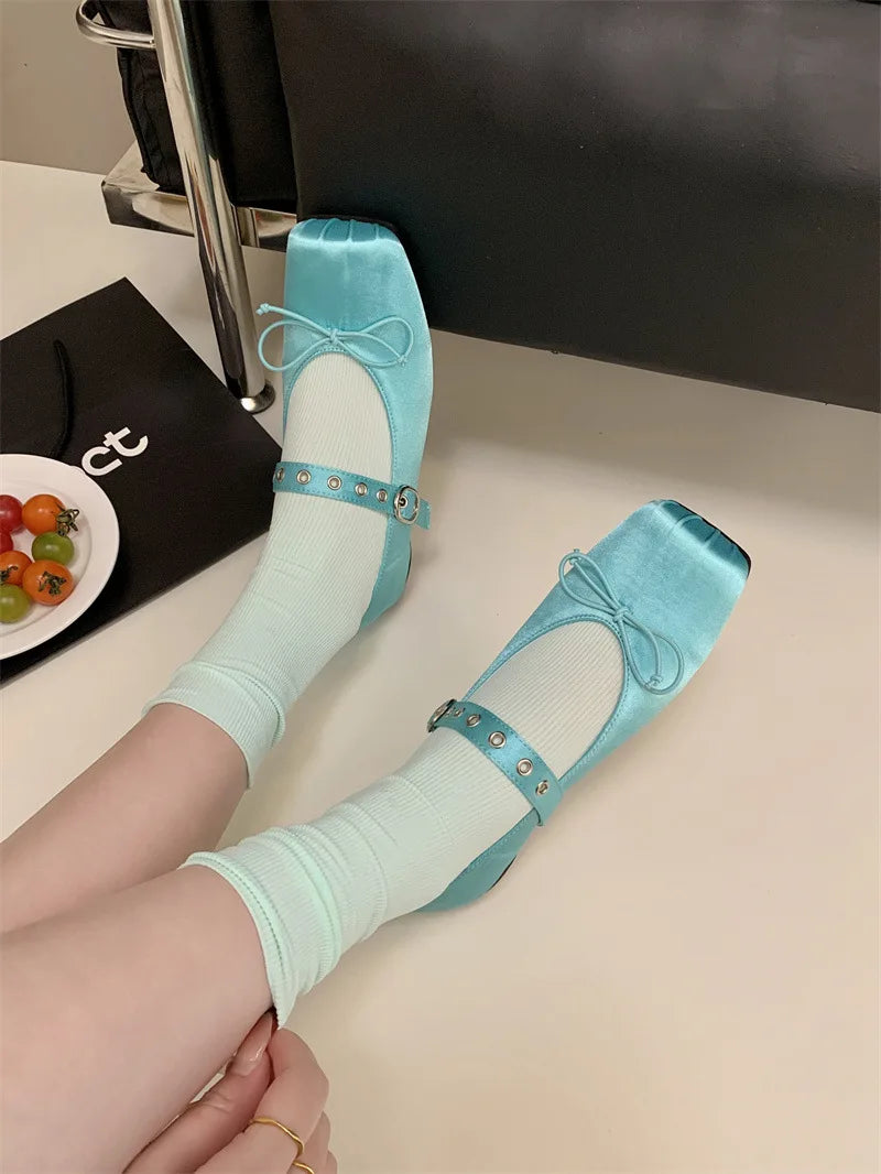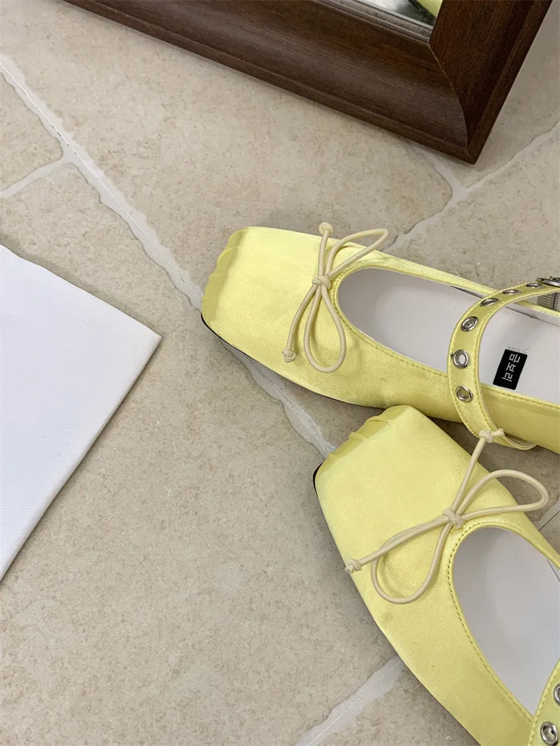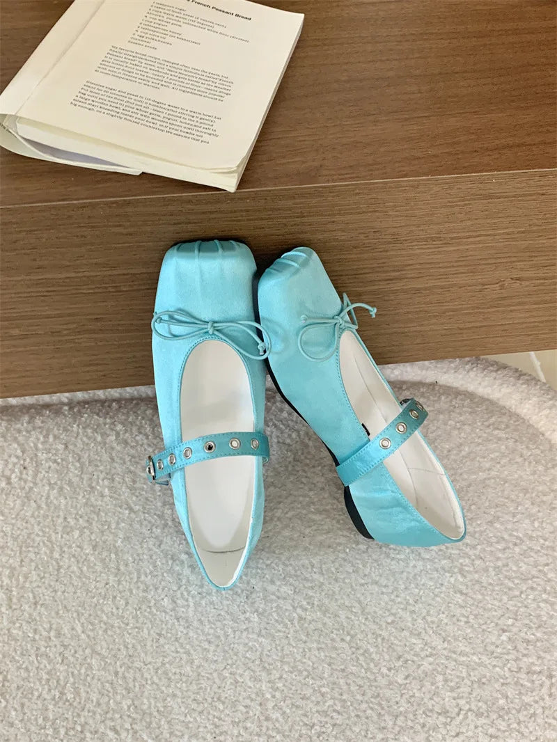 ADVBRIDGE - Satin Square Toe Mary Jane Shoe Women Shallow Buckle Bowknot Footwear Ladies Fashion Light Comfort Soft Sole Ballet Flats Women