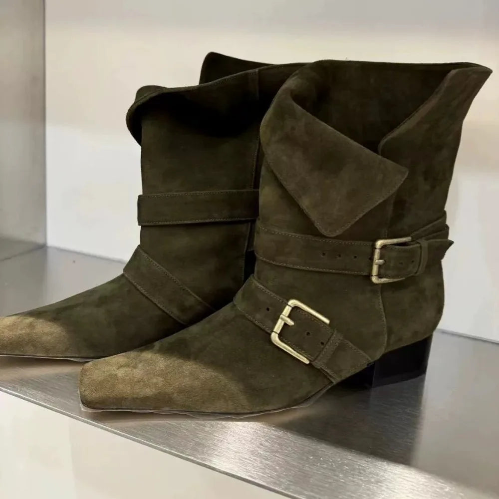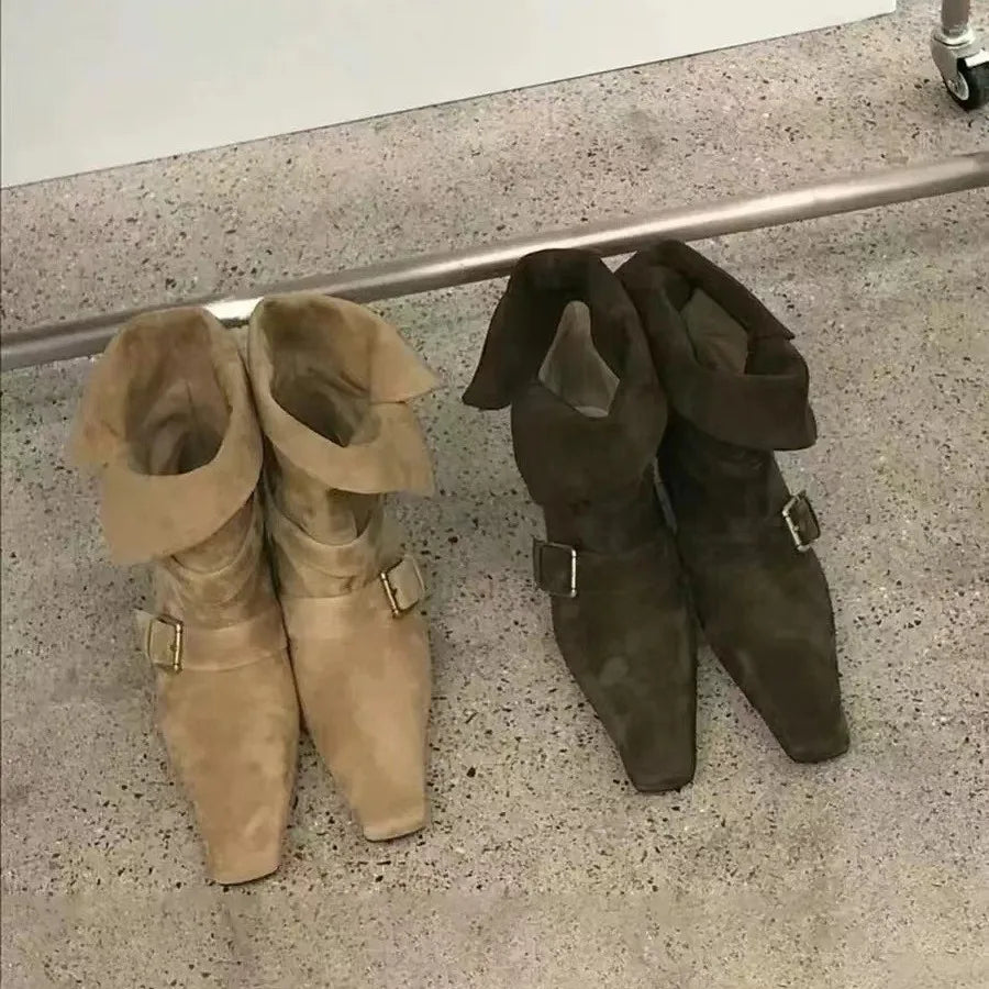 ADVBRIDGE -  Short Boots Women Autumn/winter Genuine Leather Suede Square Toe Womens Shoes Two in One Foldable Thick Heel Midsole Boots Woman