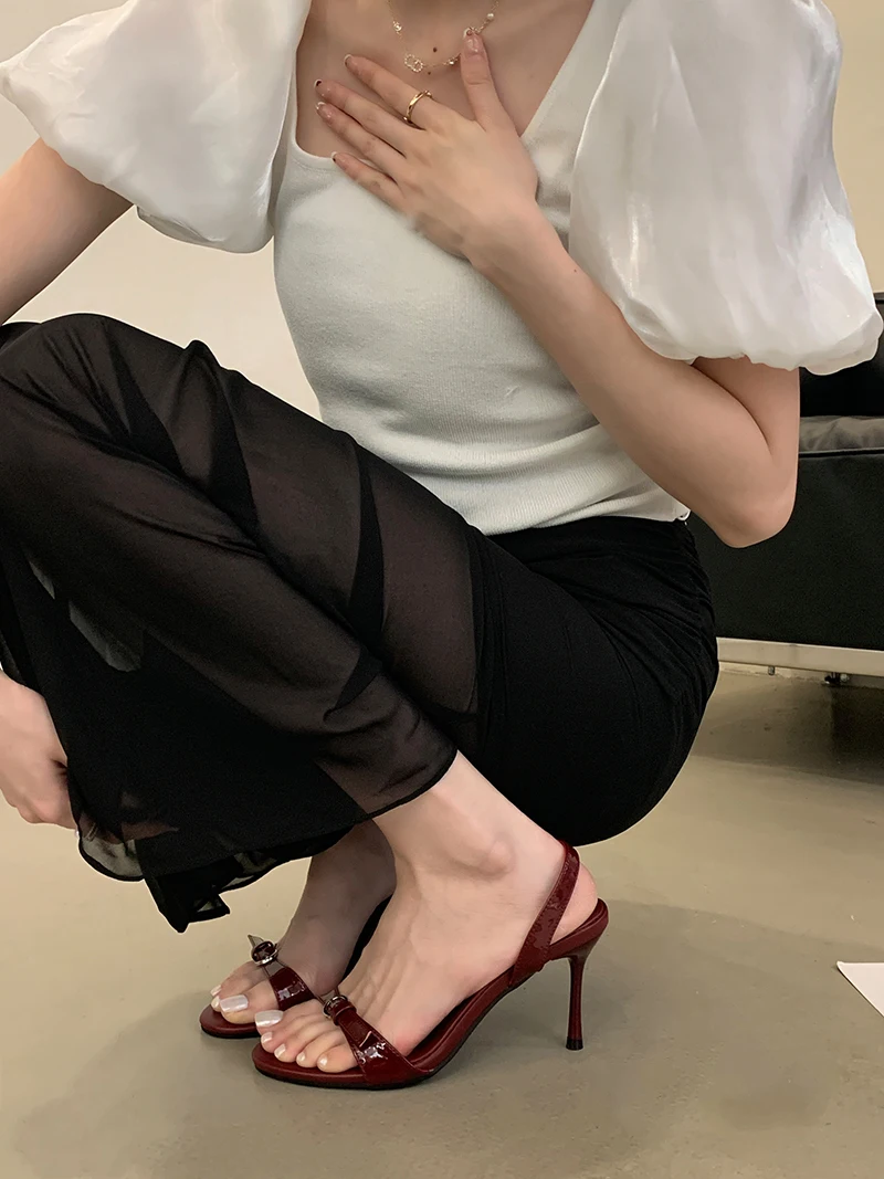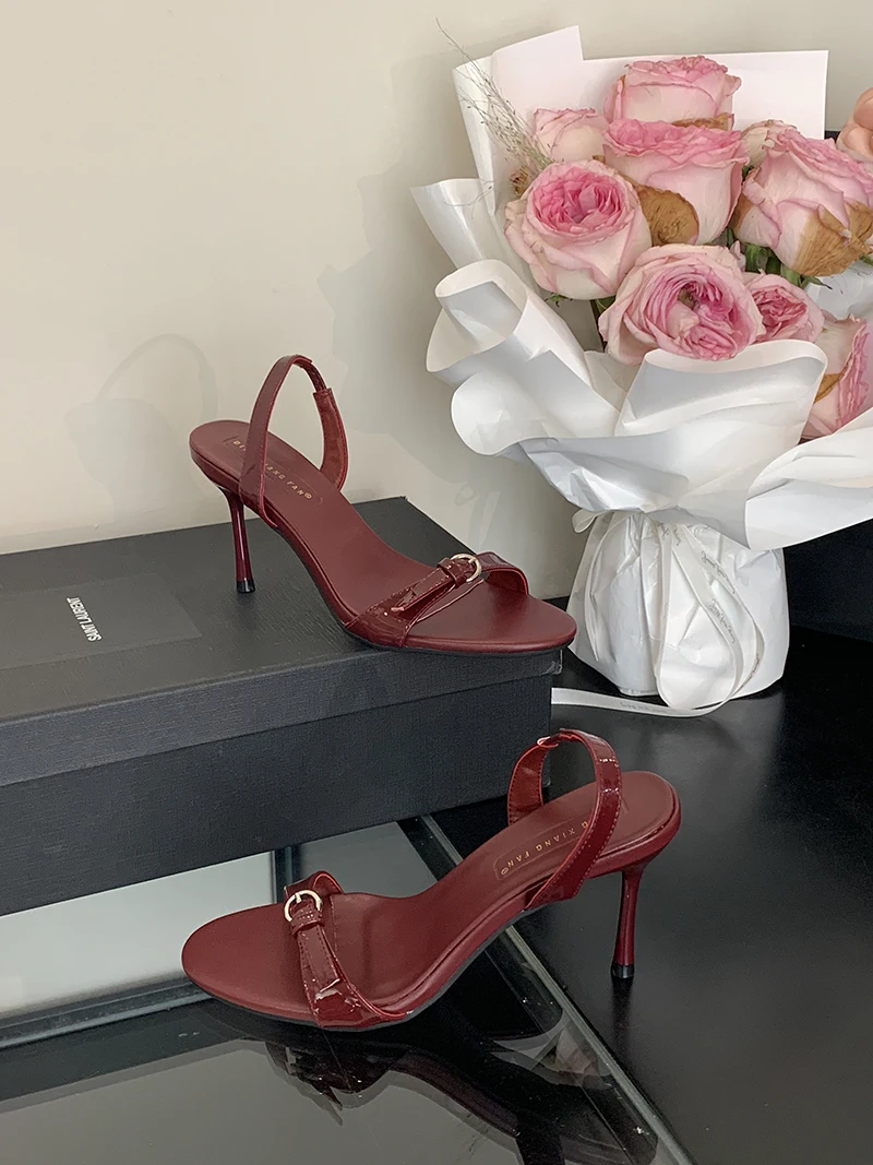 ADVBRIDGE - Silver Heels Sandals Ladies Summer Shoes 8cm Stiletto Heeled Sandals Sexy Belt Buckle Burgundy Office Shoes Female