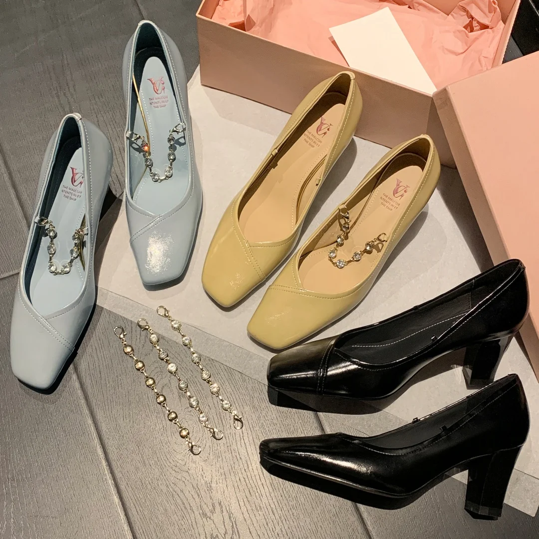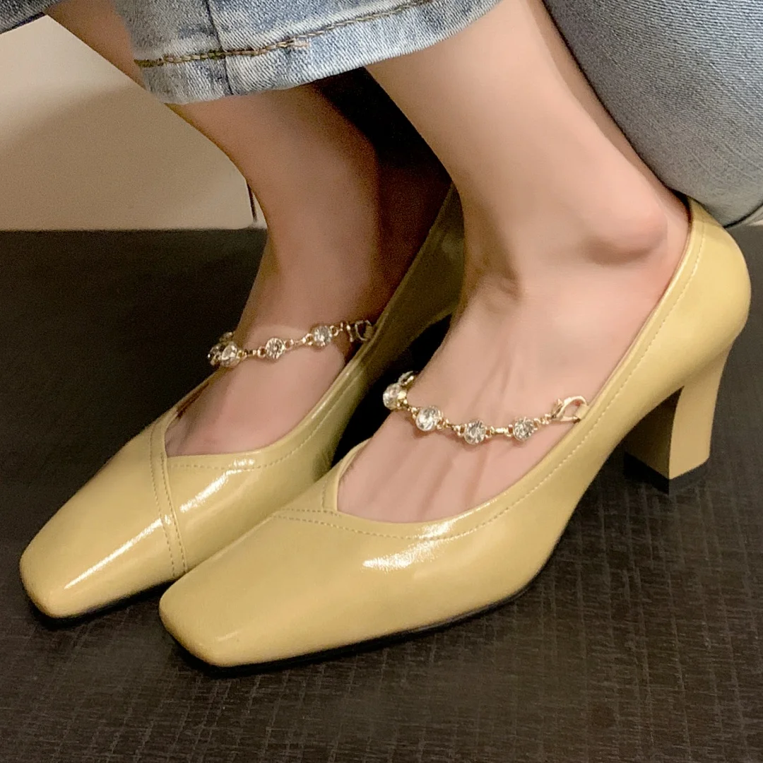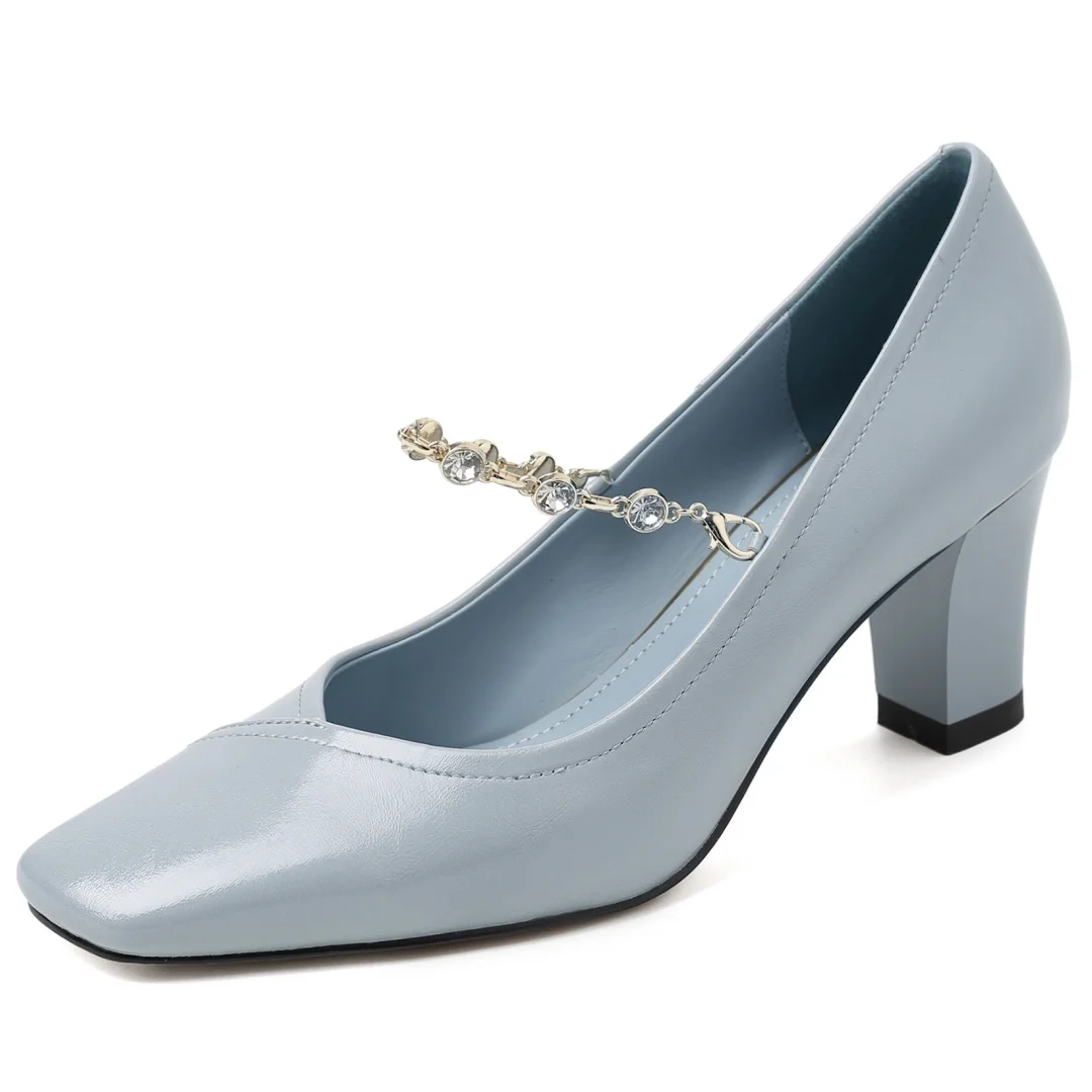 ADVBRIDGE - Spring new women's genuine leather crystal chain decoration slip-on Mary Jane pumps 7cm thick high heel elegant ladies shoe