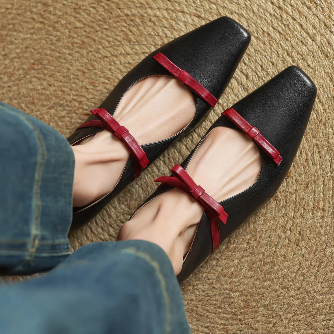 ADVBRIDGE - Women's cow leather double bowtie slip-on flats loafers square toe high quality female sweet daily moccasins shoes for woman hot