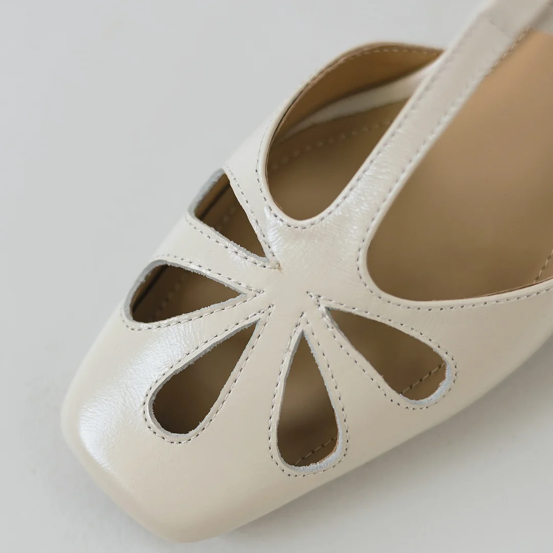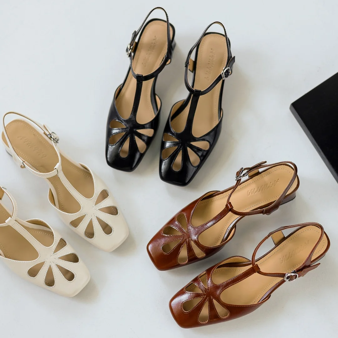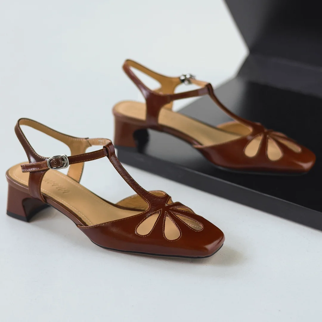 ADVBRIDGE - Women's cow leather hollow-out t-strap sandals 4cm thick med heel square toe elegant ladies summer pumps heeled shoes for woman