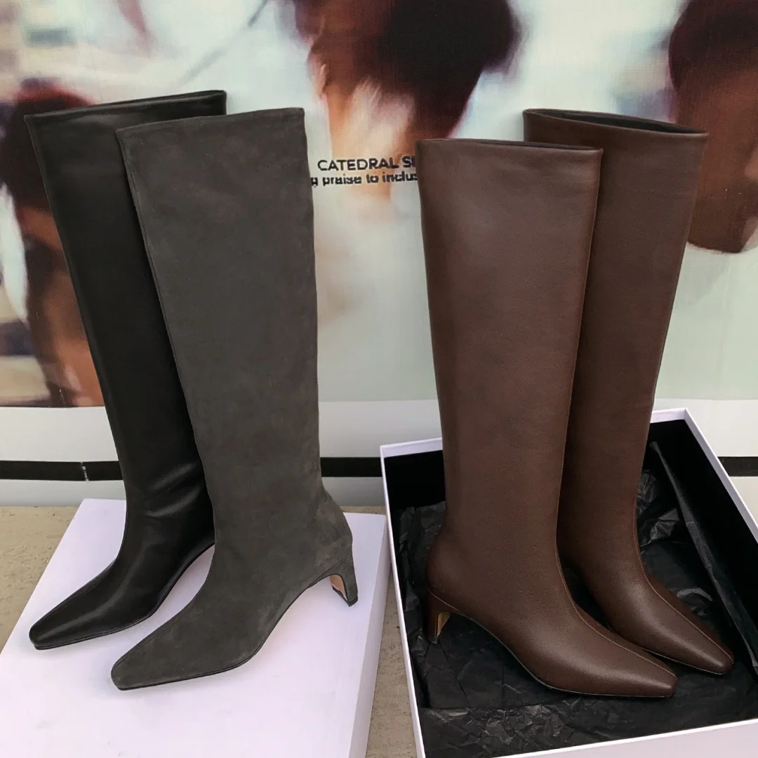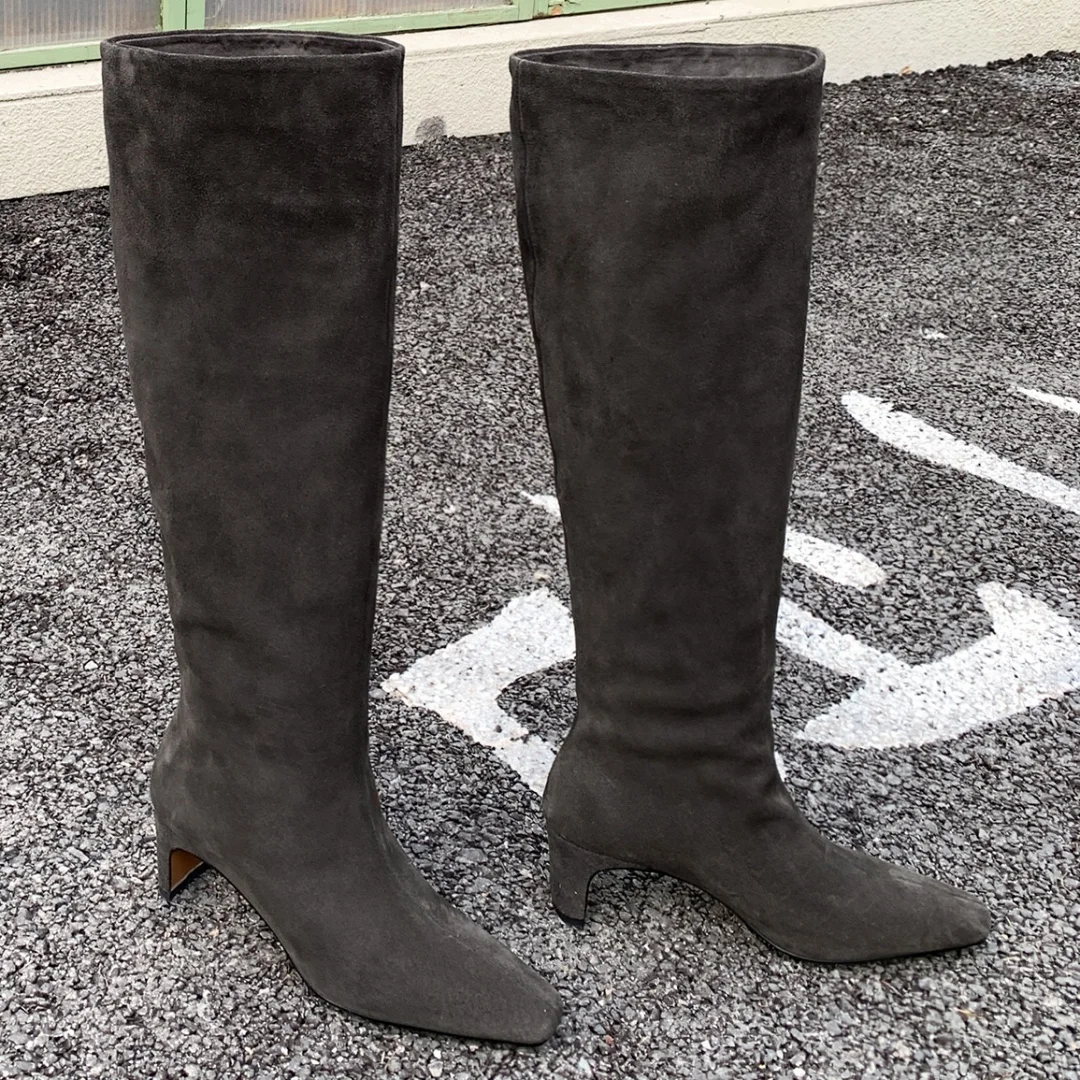 ADVBRIDGE - women's natural suede leather 4.5cm thin med heel square toe slip-on knee high boots elegant ladies long boots shoes