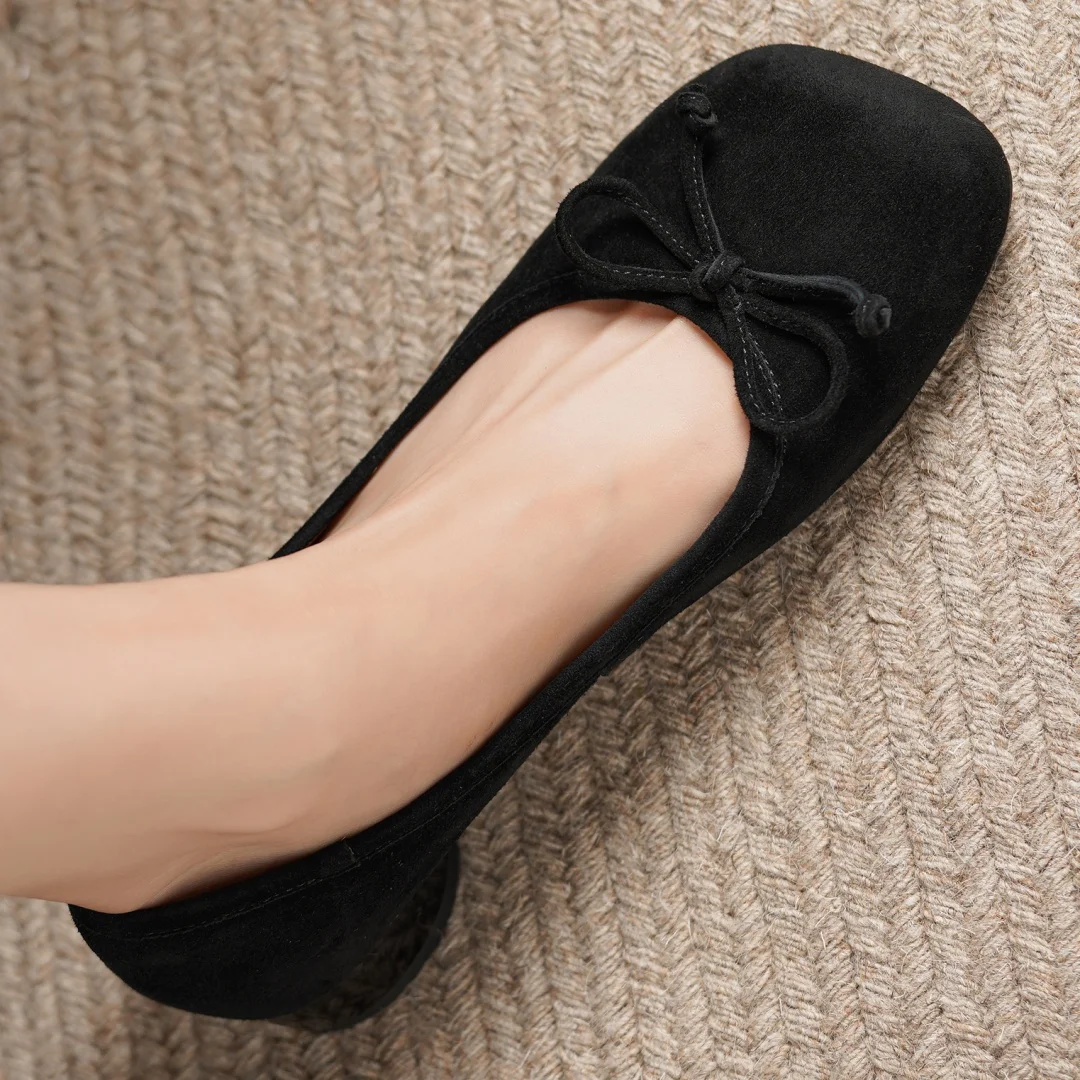 ADVBRIDGE - Women's natural suede leather square toe slip-on flats 3cm round low heel sweet bowtie casual female four season shoes for woman