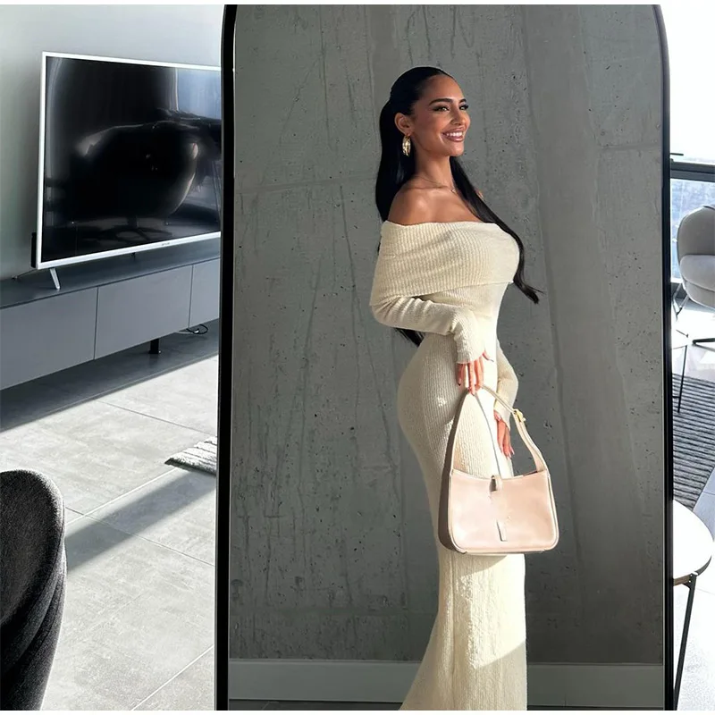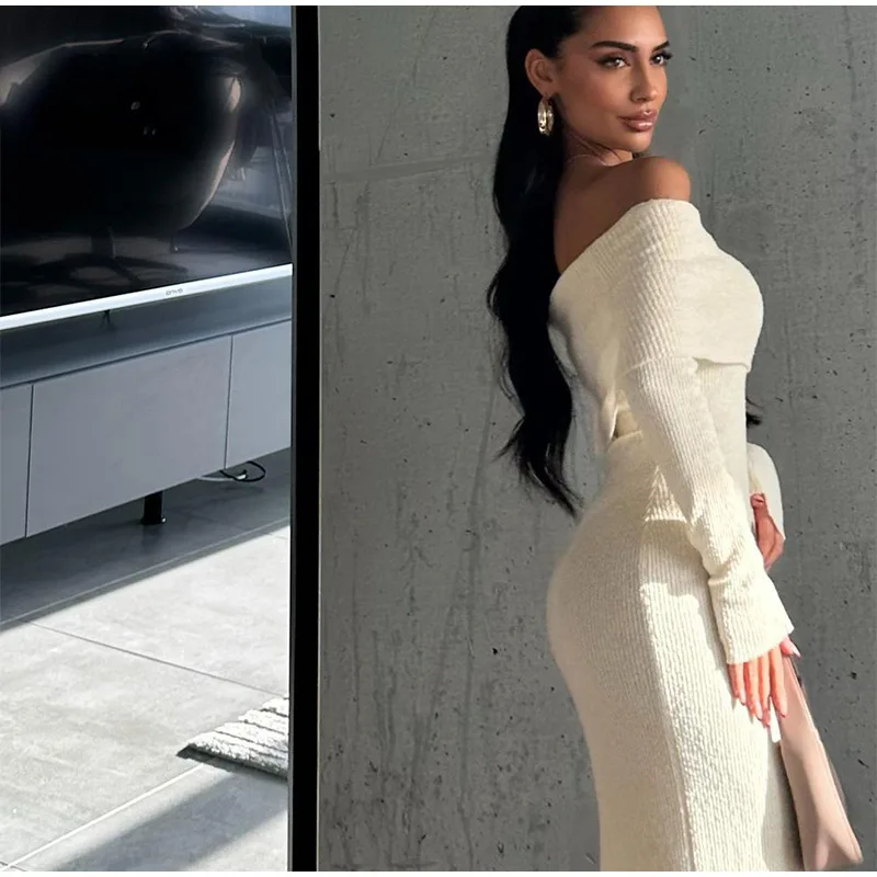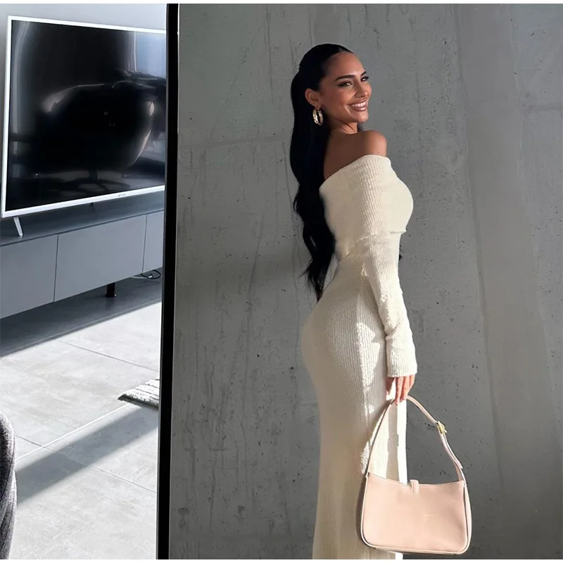 Advbridge 2024 Fashion Off Shoulder Maxi Knitted Dress Women's Elegant White Long Sleeved Skinny Robe Female Chic Autumn New Party Dresses