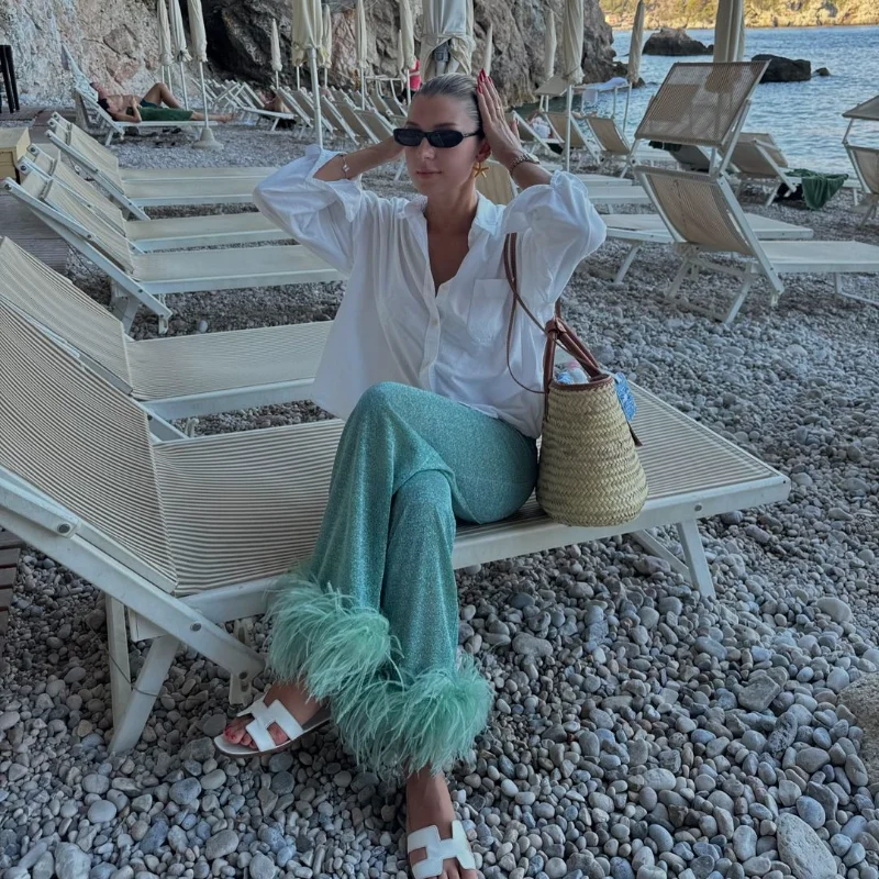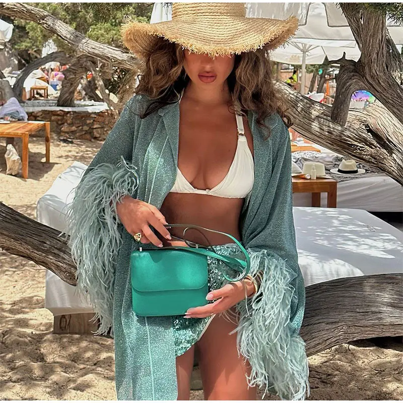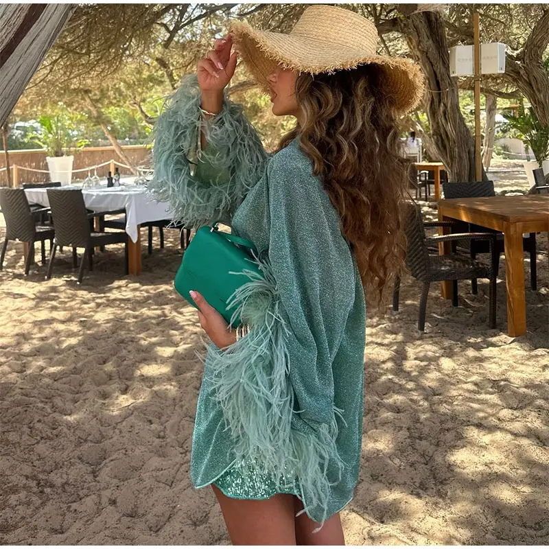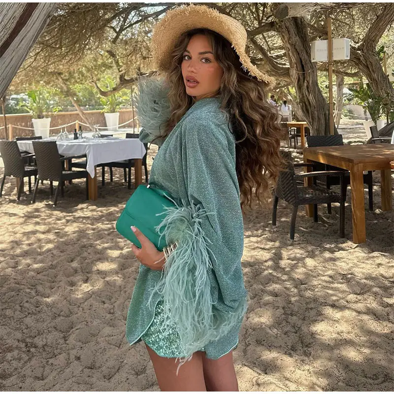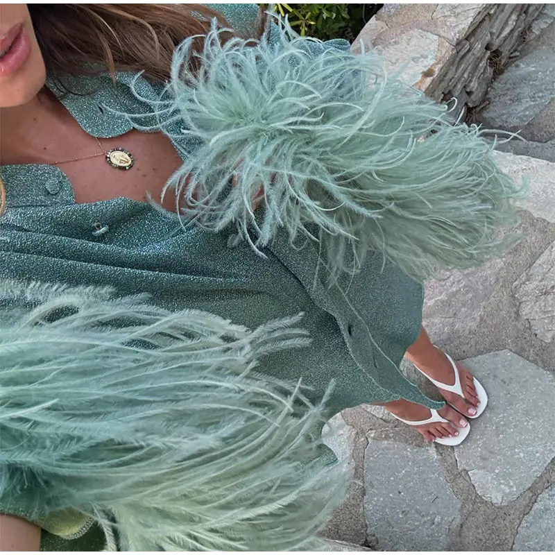 Advbridge 2024 New Chic Shiny Spliced Feather Cuffs Loose Shirt Women Fashion Stand Collar Single-breasted Blouses Female Vacation Tops