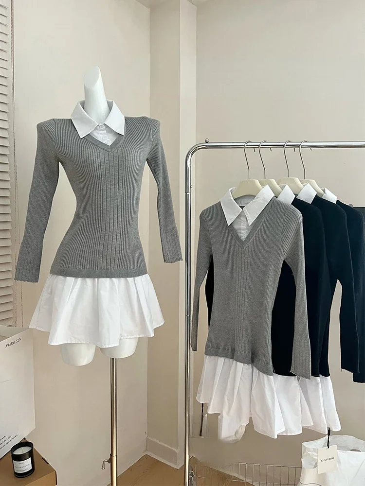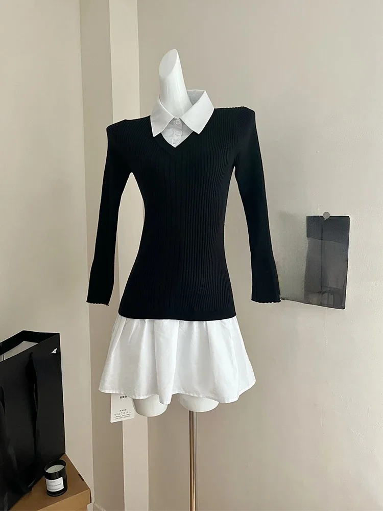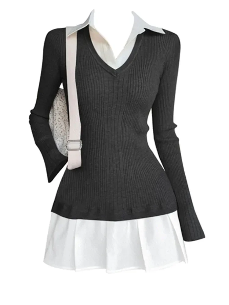 Advbridge 2024 Summer Preppy Style Fake Two Pieces Mini Knitted Shirts Dress Women Gyaru 2000s Aesthetic Vintage Long Sleeve One-Piece