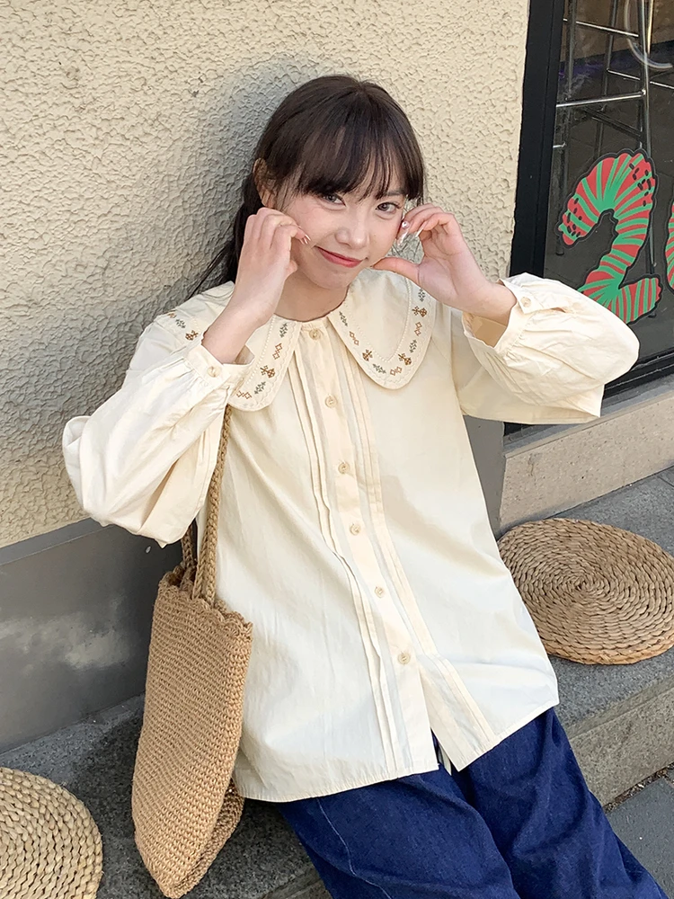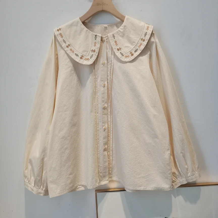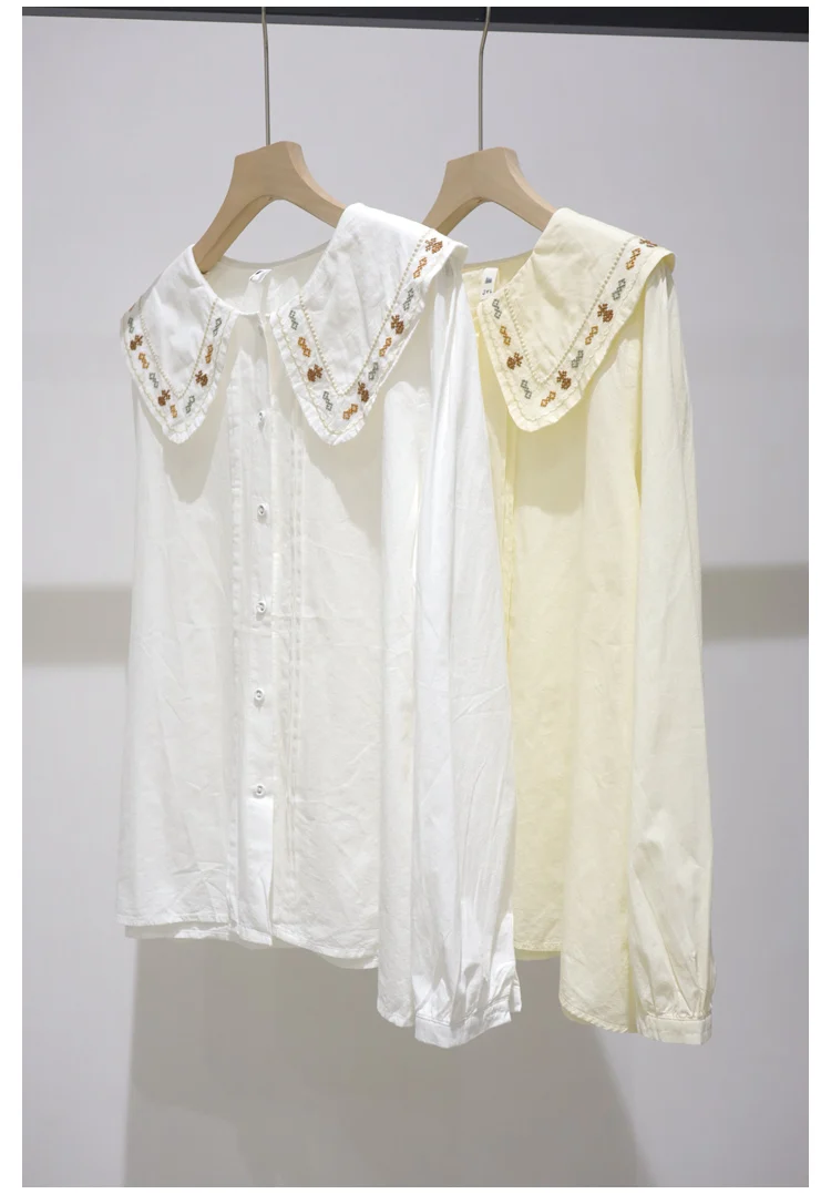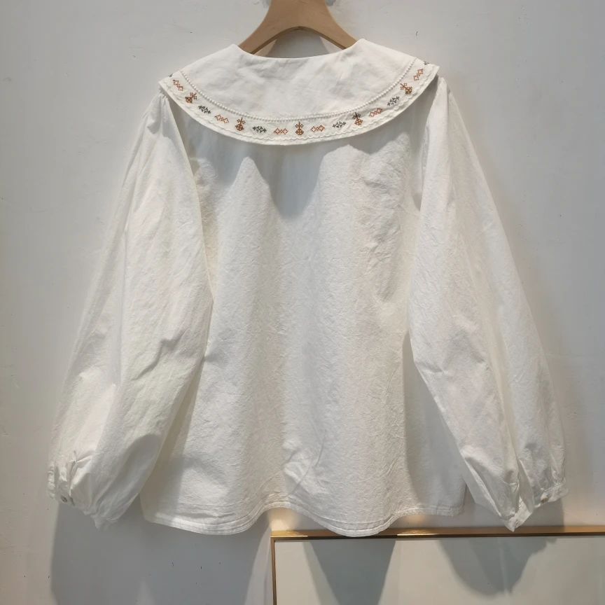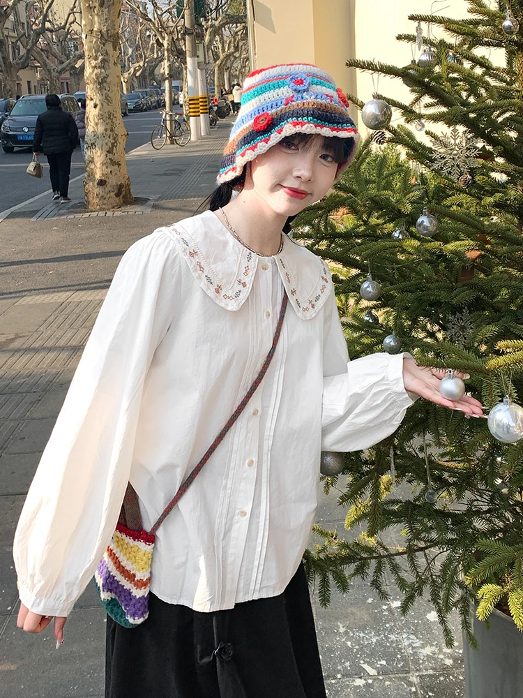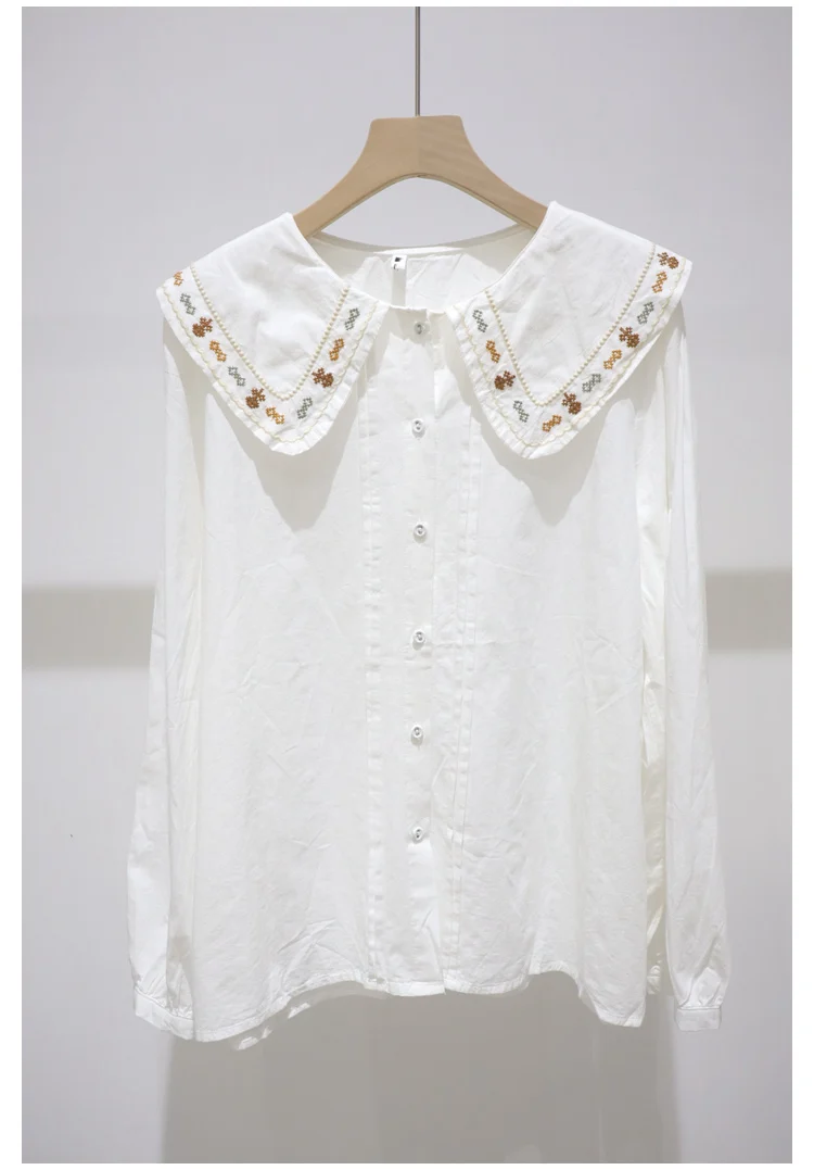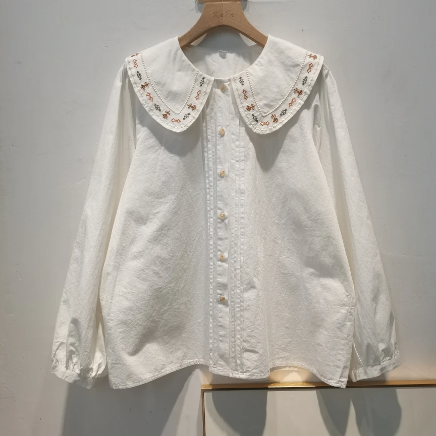 Advbridge 2025 Spring Summer New Long Sleeve Women's Cotton Shirt Loose Sweet Big Collar Flower Embroidered Basic White Casual Preppy Top