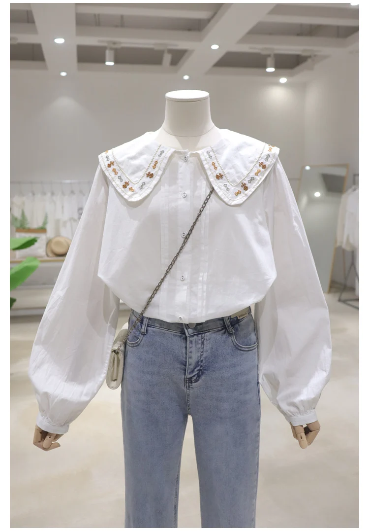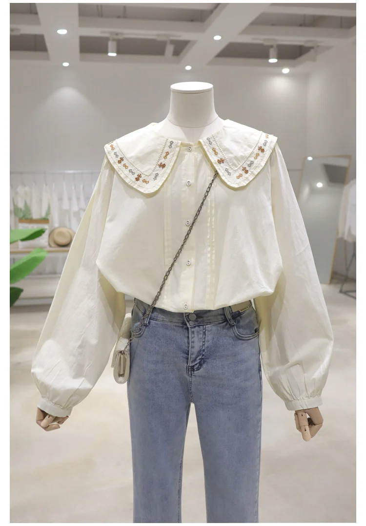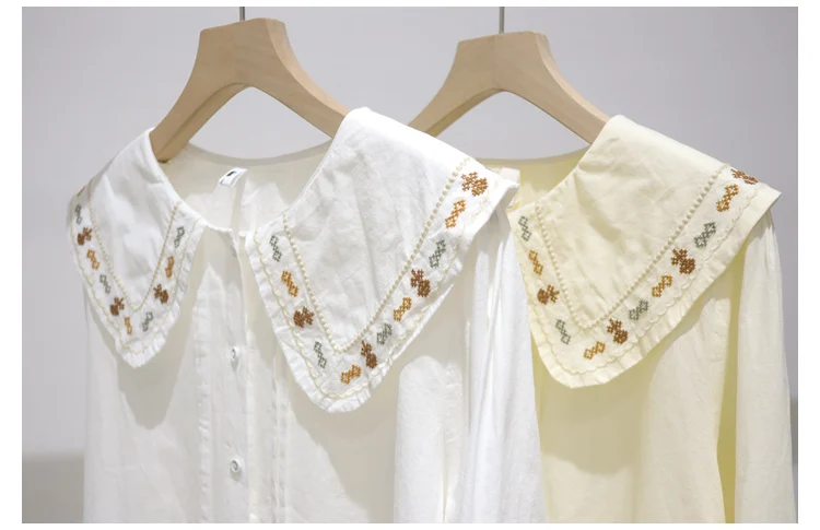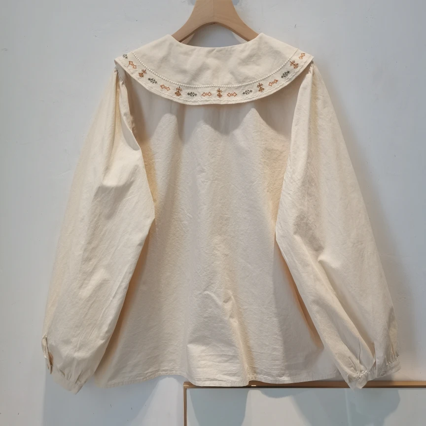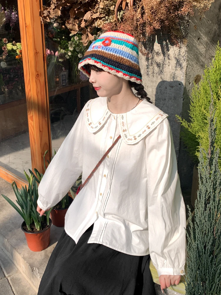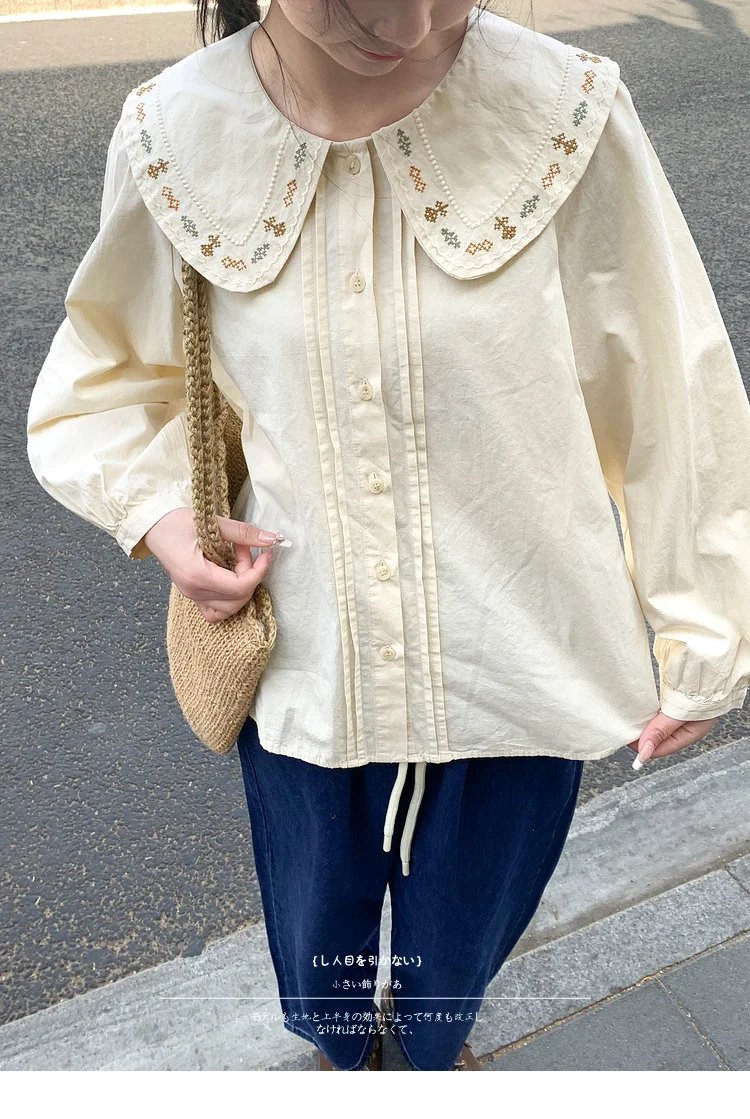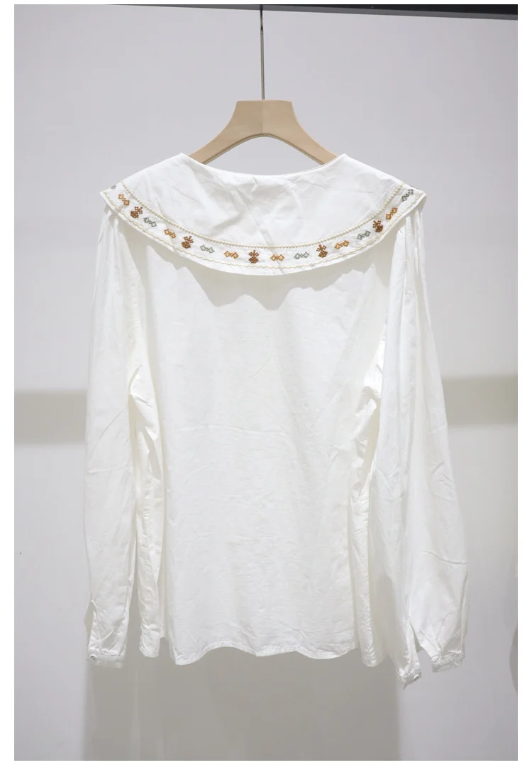 Advbridge 2025 Spring Summer New Long Sleeve Women's Cotton Shirt Loose Sweet Big Collar Flower Embroidered Basic White Casual Preppy Top