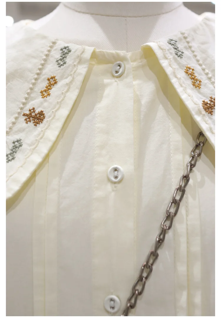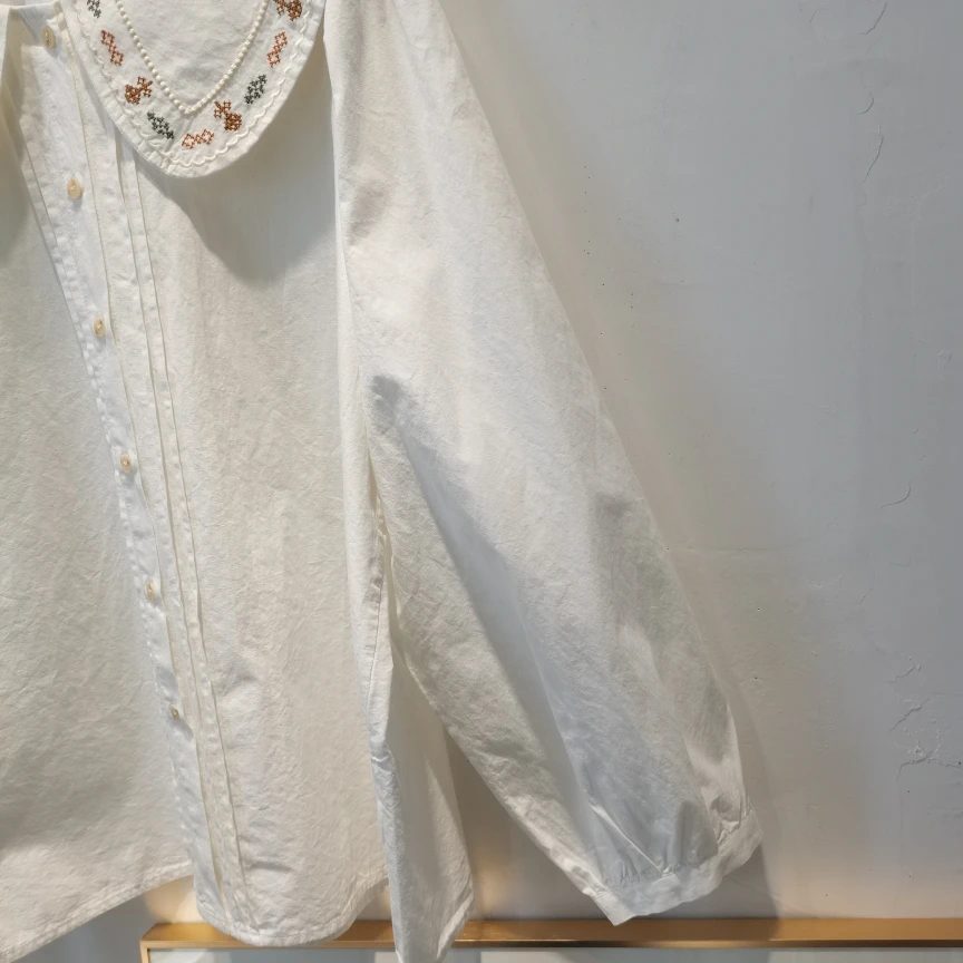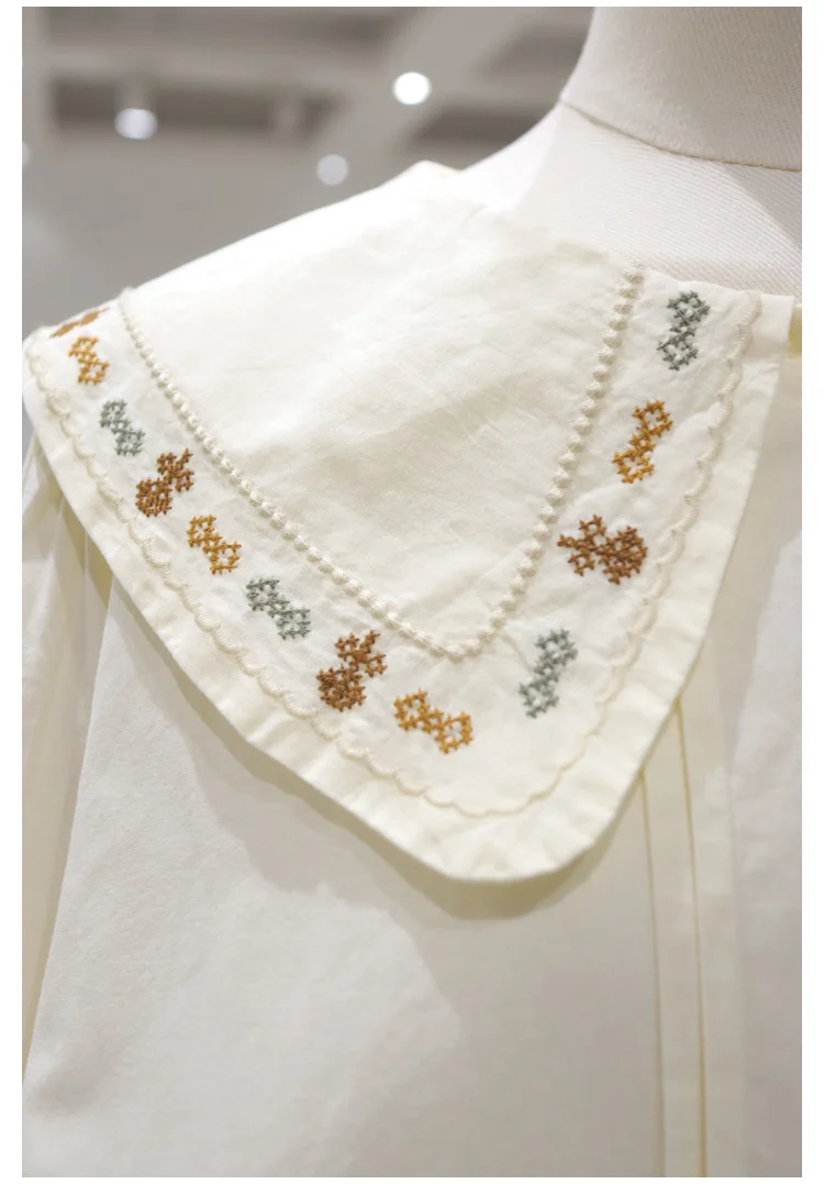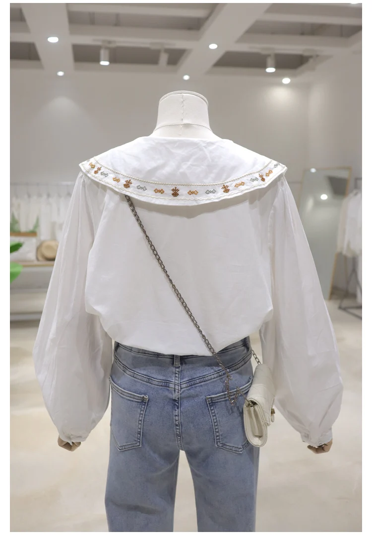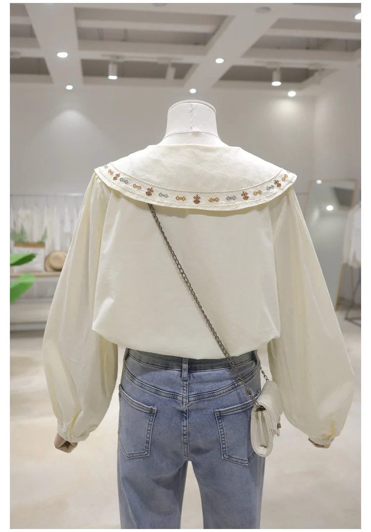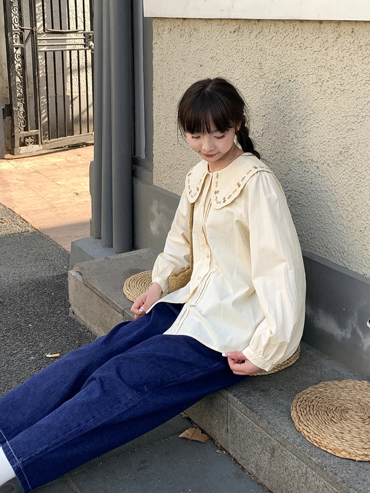 Advbridge 2025 Spring Summer New Long Sleeve Women's Cotton Shirt Loose Sweet Big Collar Flower Embroidered Basic White Casual Preppy Top