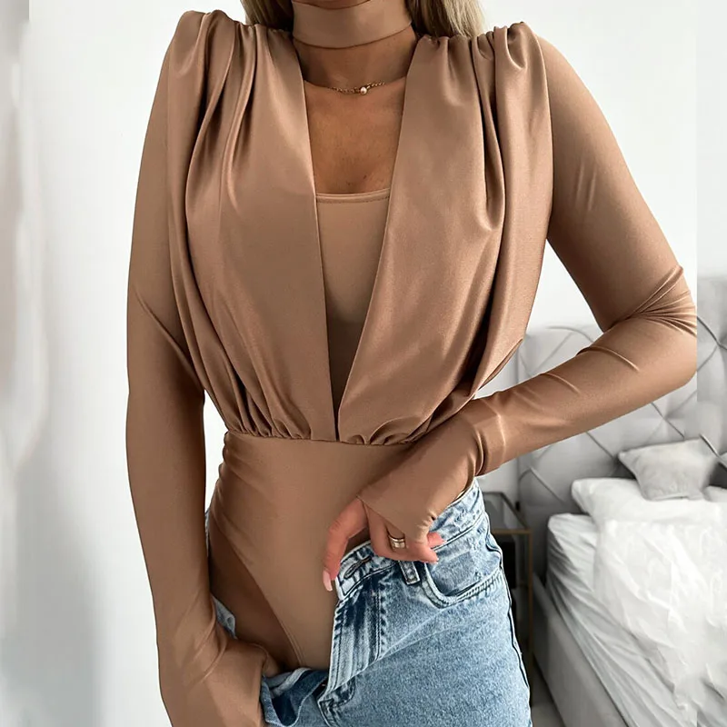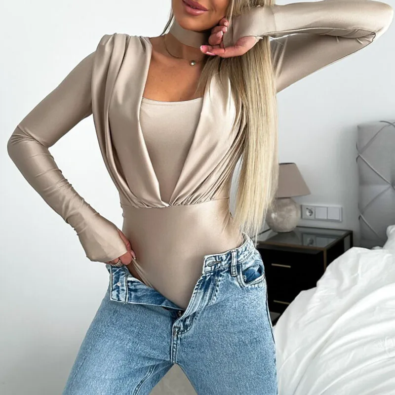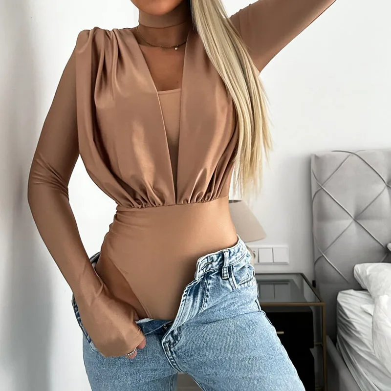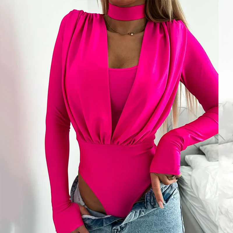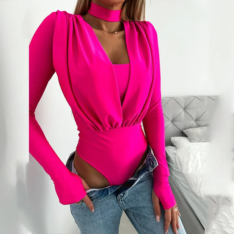 Advbridge 2yk Clothes Lady Sexy Slim Waist Rompers One Piece Sexy V-neck Solid Basic Jumpsuit Women Folds Long Sleeve Tops Women Bodysuit