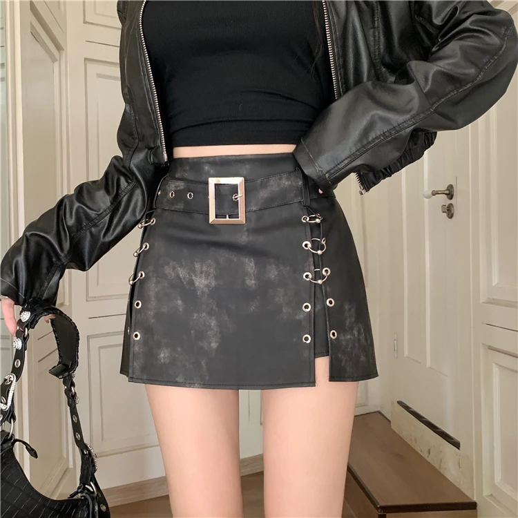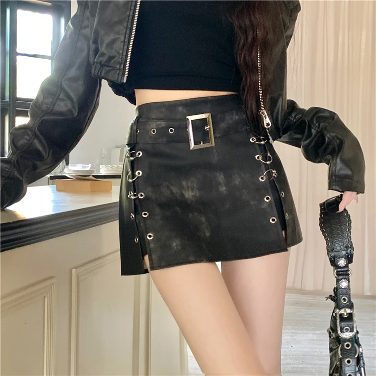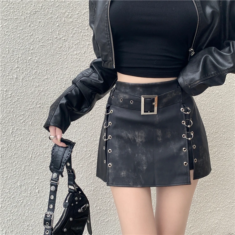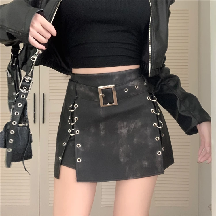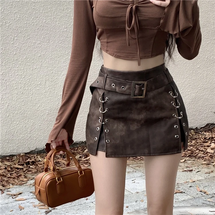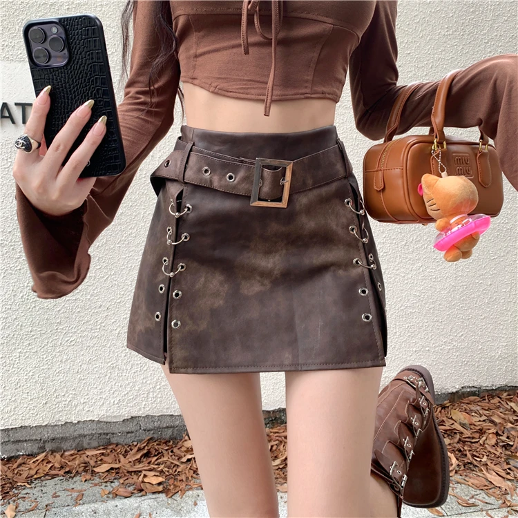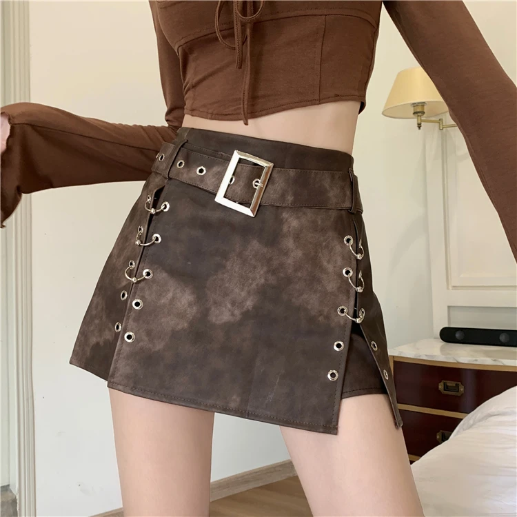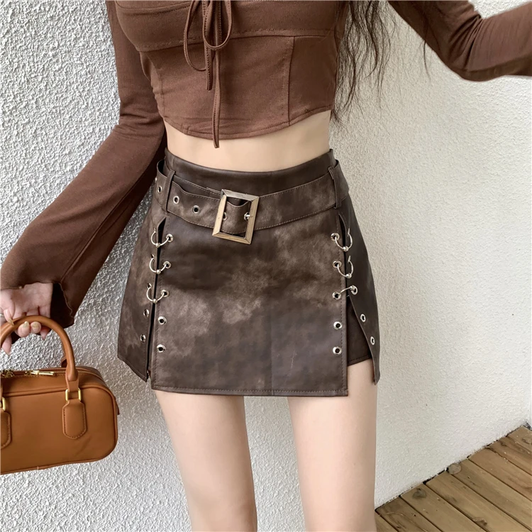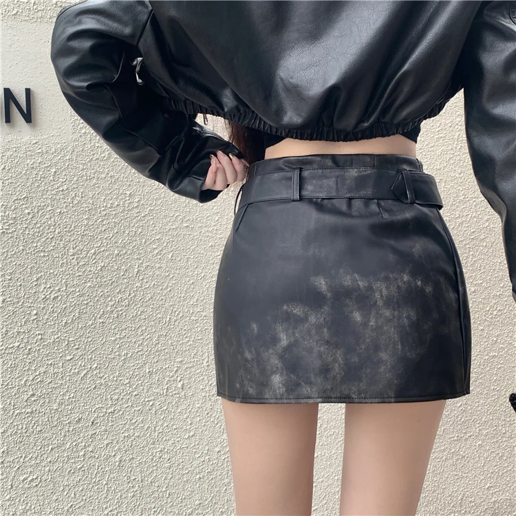 Advbridge - American Retro Hot Girl Skirt Women's Autumn Wrap Hip Leather Skirt Ink Painted Belt A-line Mini Skirt Fashion Female Clothes
