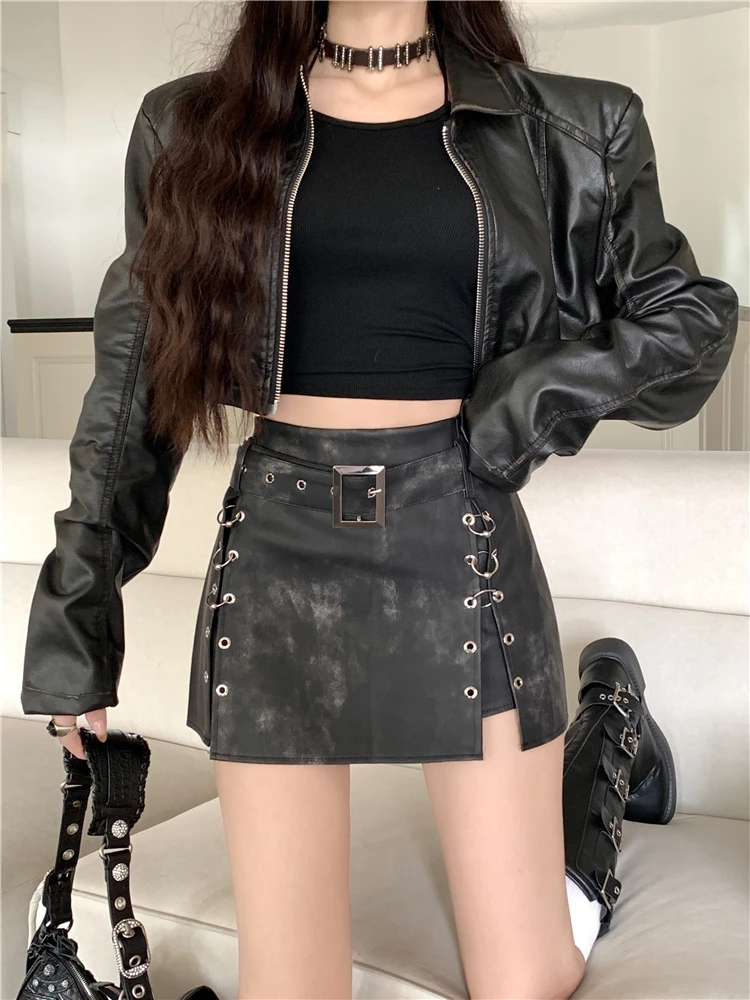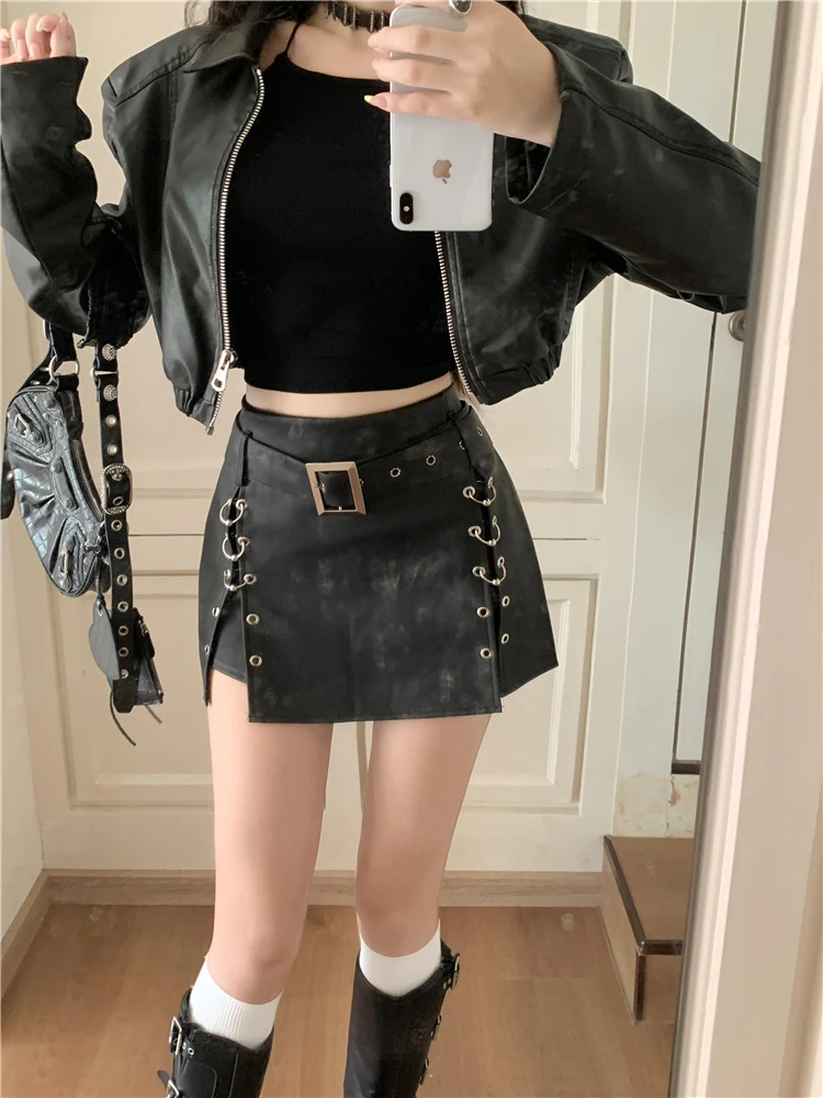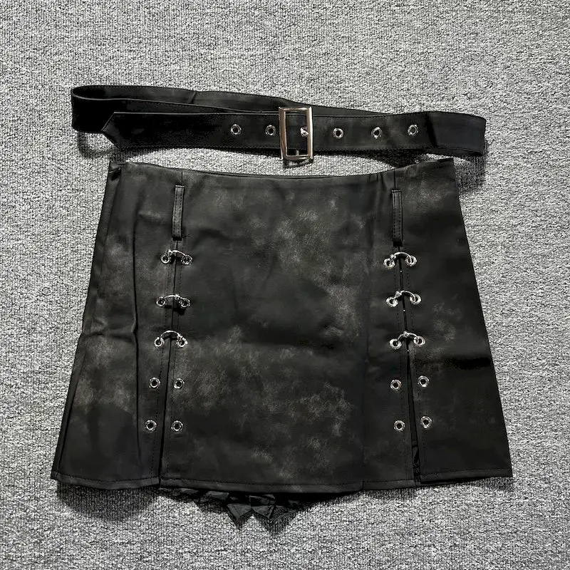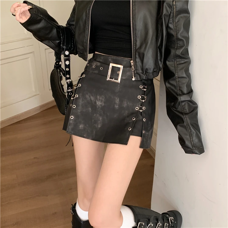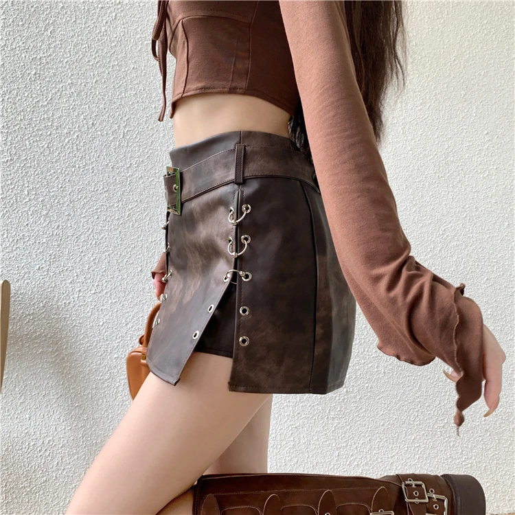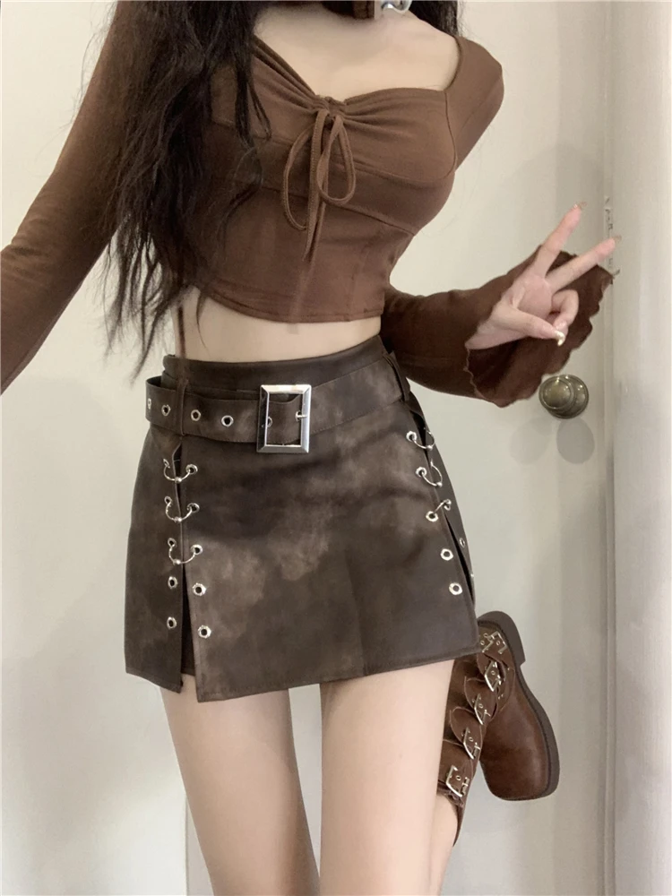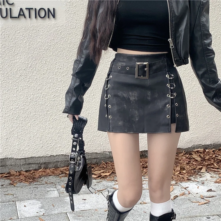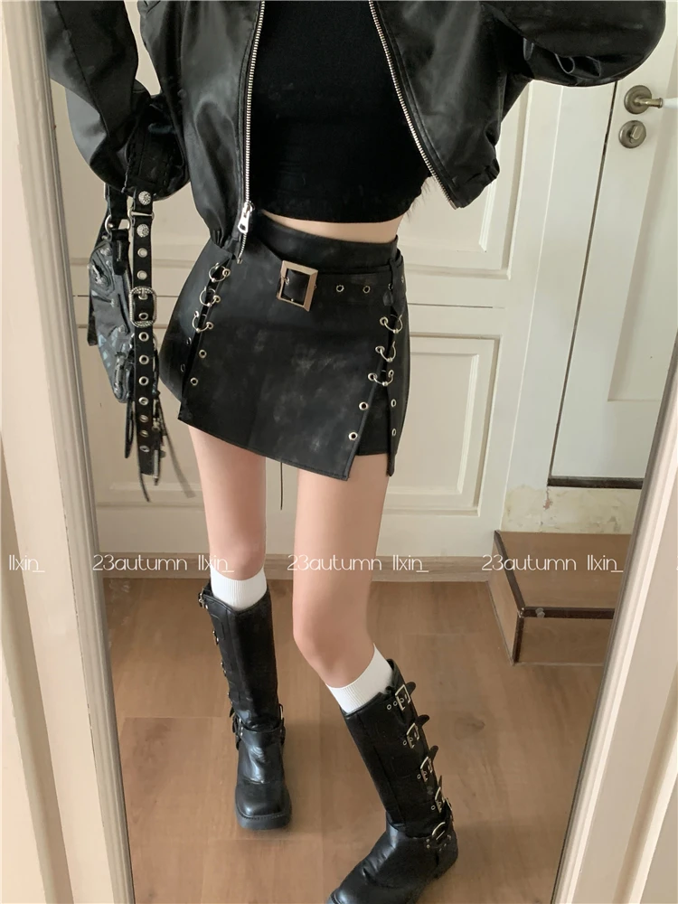Advbridge - American Retro Hot Girl Skirt Women's Autumn Wrap Hip Leather Skirt Ink Painted Belt A-line Mini Skirt Fashion Female Clothes