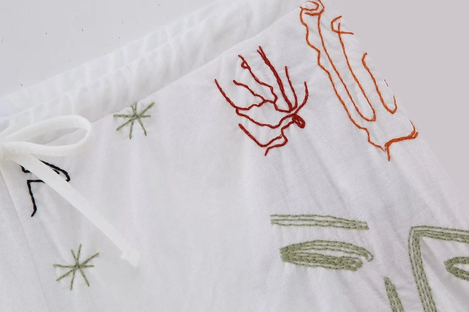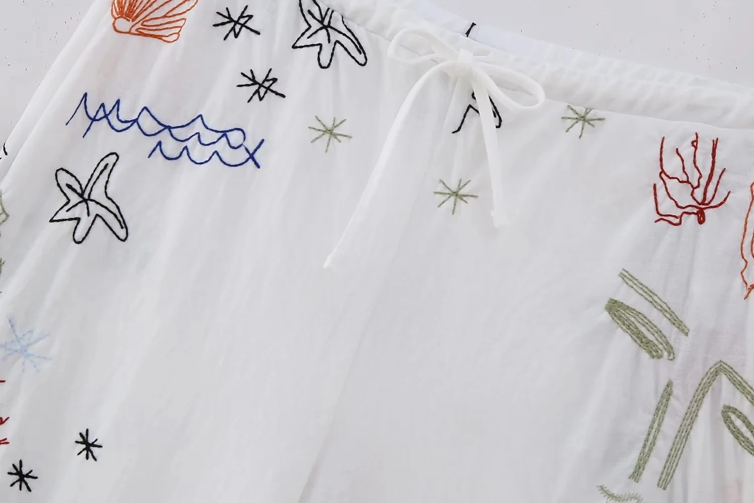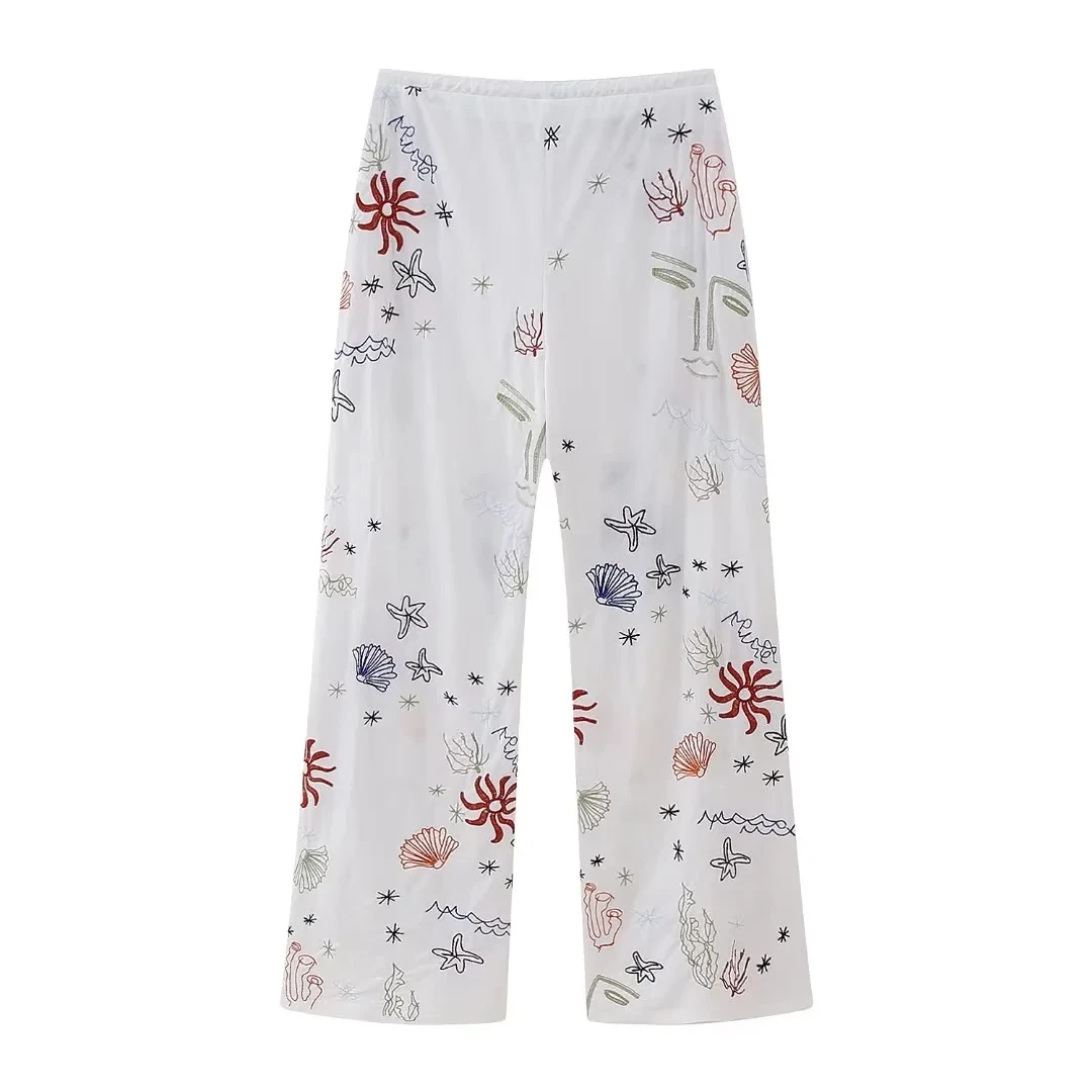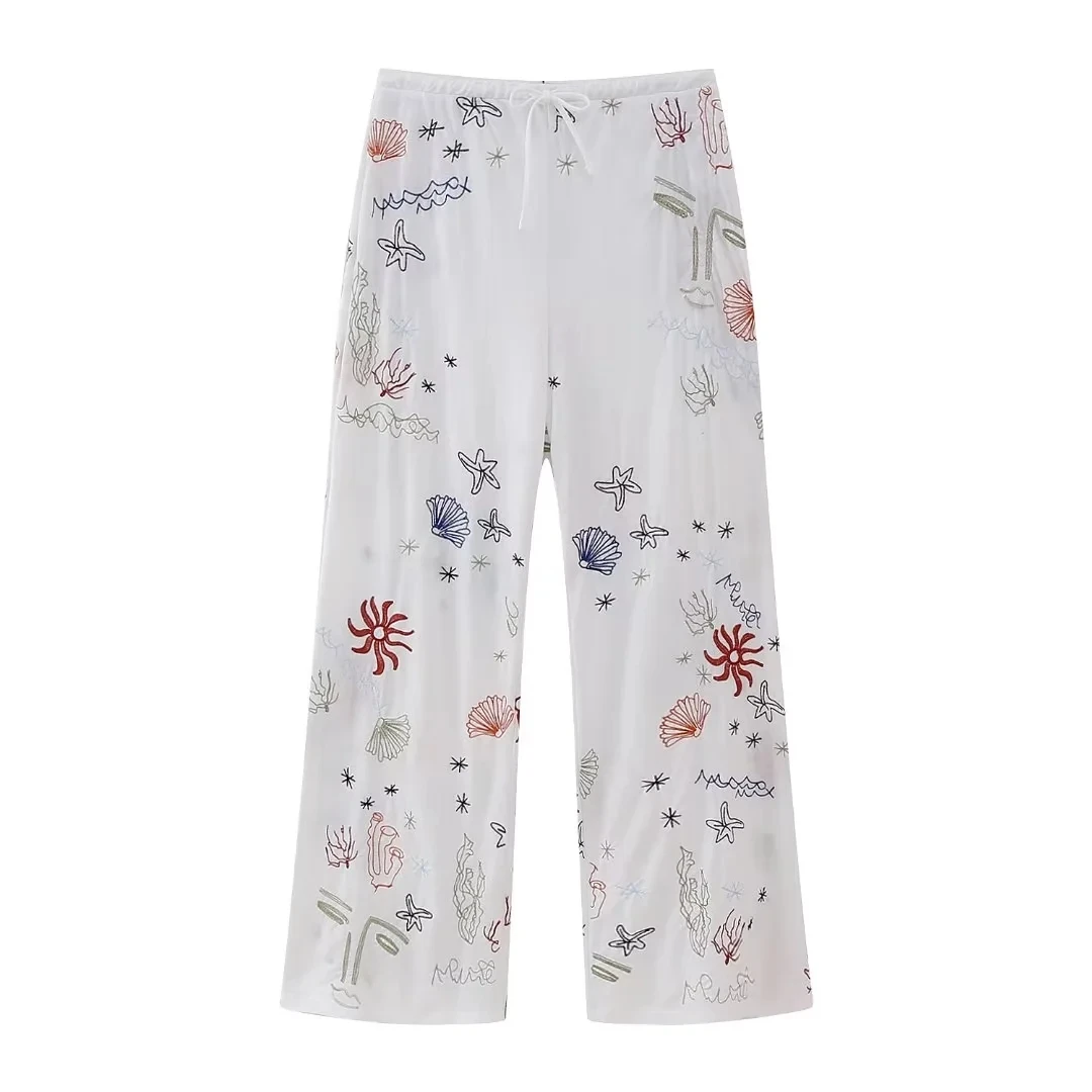 Advbridge Autumn Embroidery Women Cotton Long Pants Drawstring Casual Wide Leg White Trousers 2024 Boho Marine Organism Pants