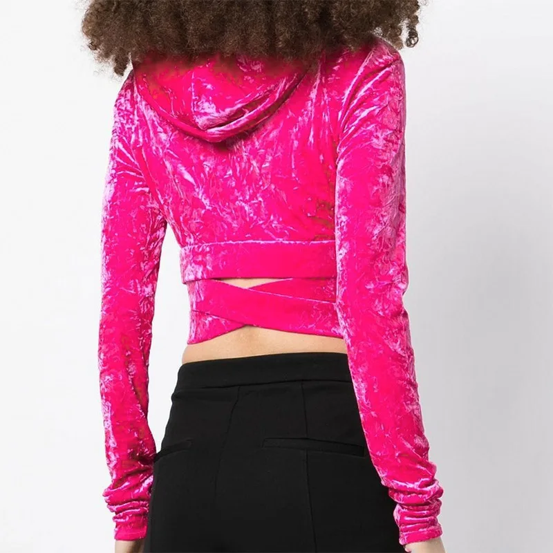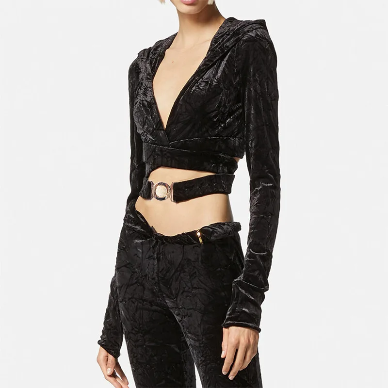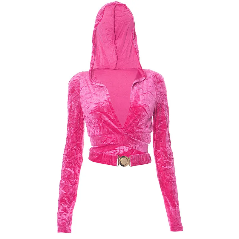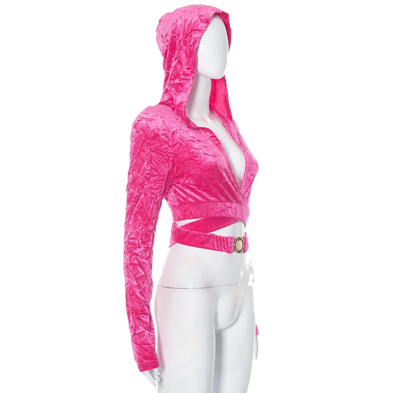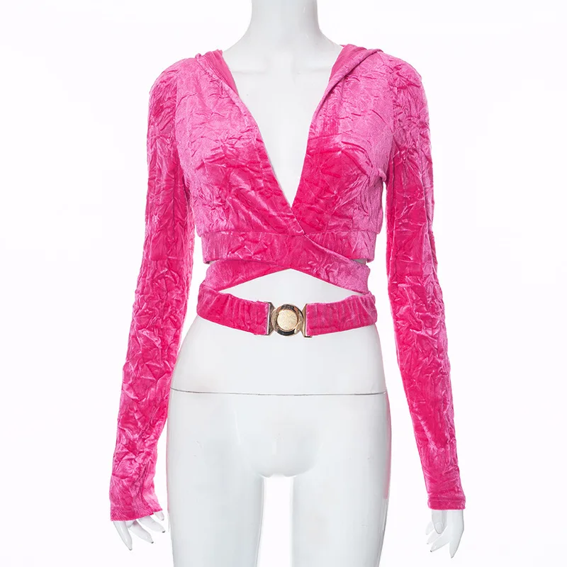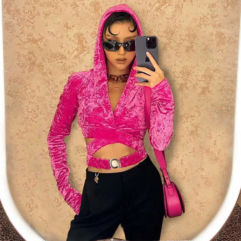 Advbridge Autumn Velvet Hooded Crop Tops Women Sexy Deep V Neck Full Sleeve Cross Buckle Slim T-Shirts Fashion Casual Sweatshirts