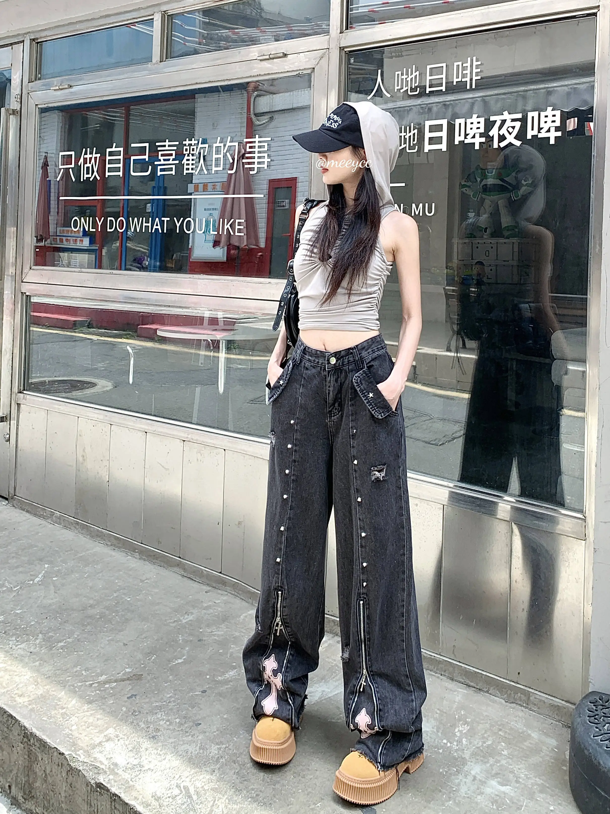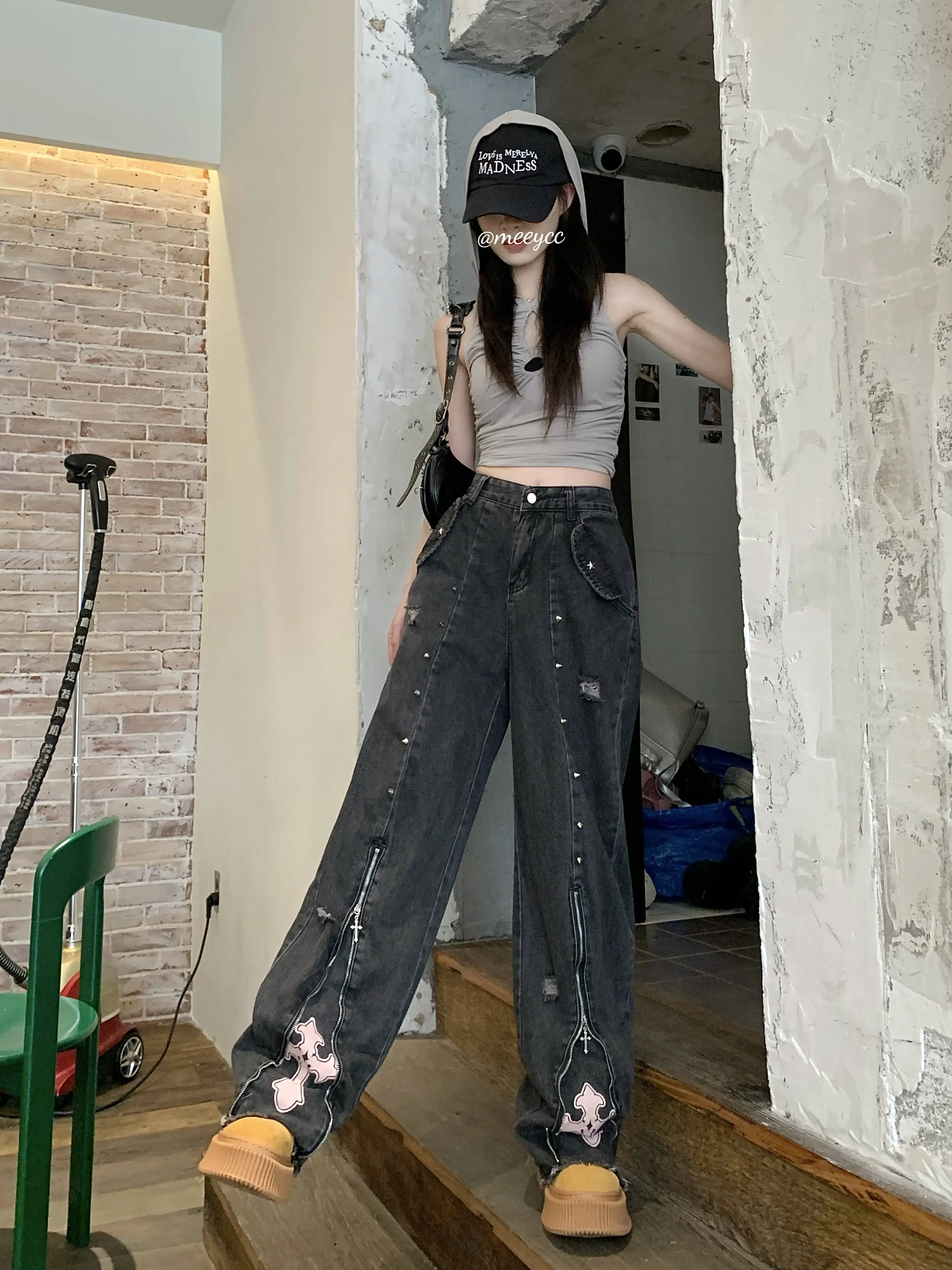 Advbridge Black High Waist Women Jeans Vintage Straight Casual Baggy Punk Hip Hop Y2K Street American Wide Leg Female Trouser Denim Pants