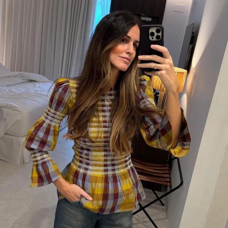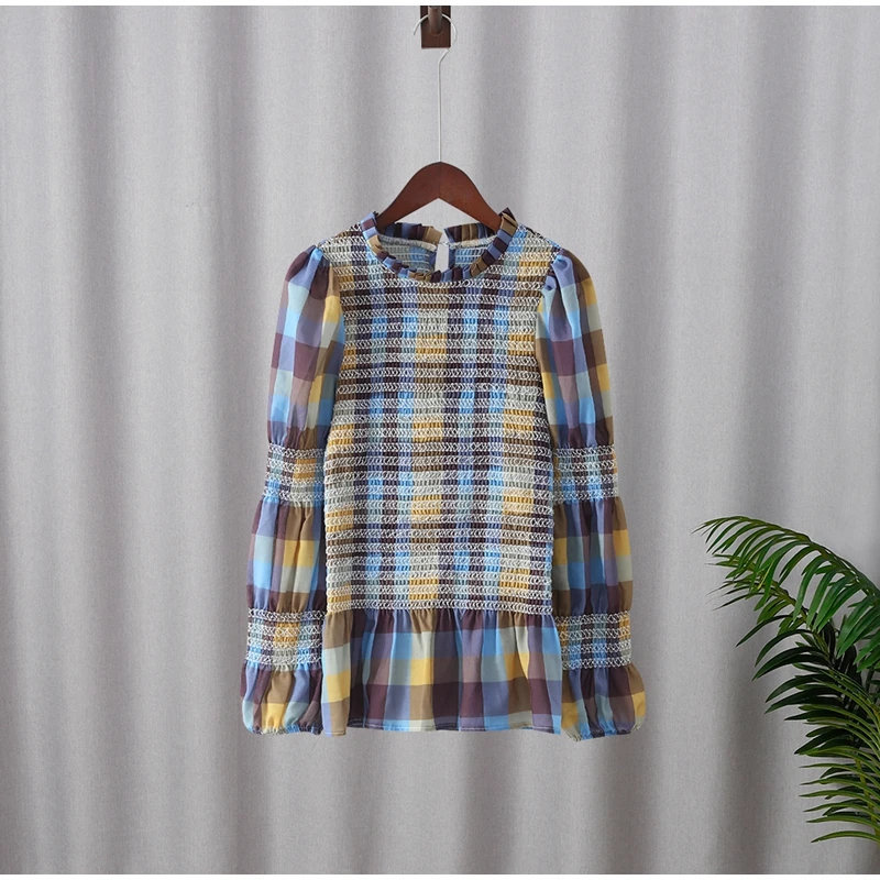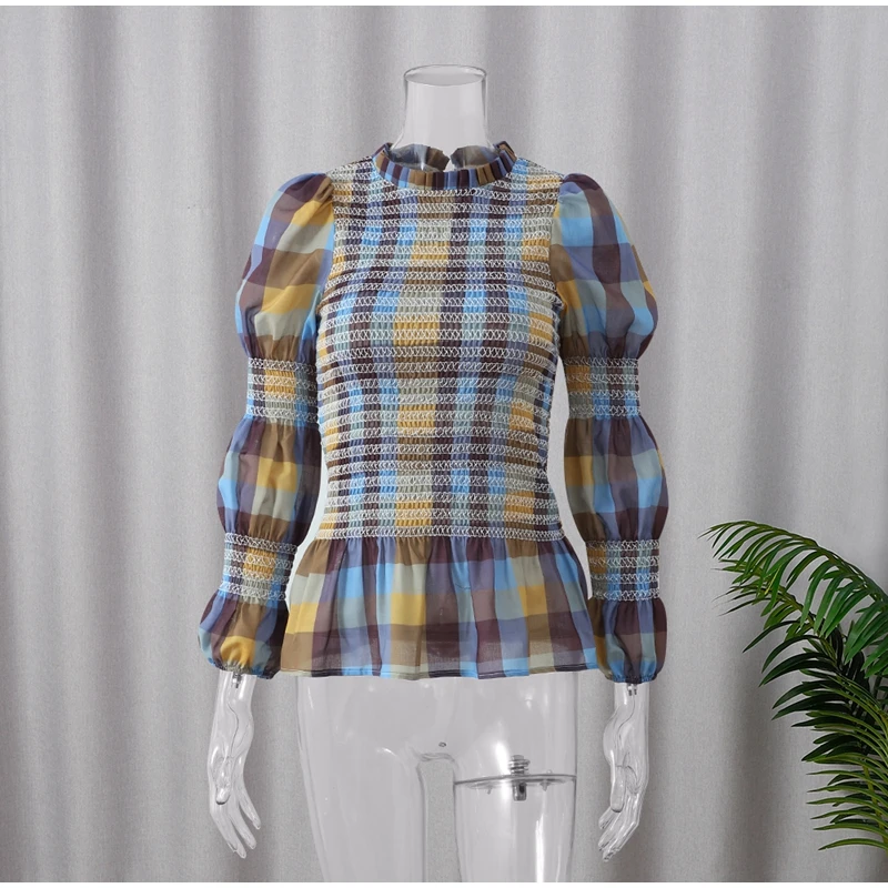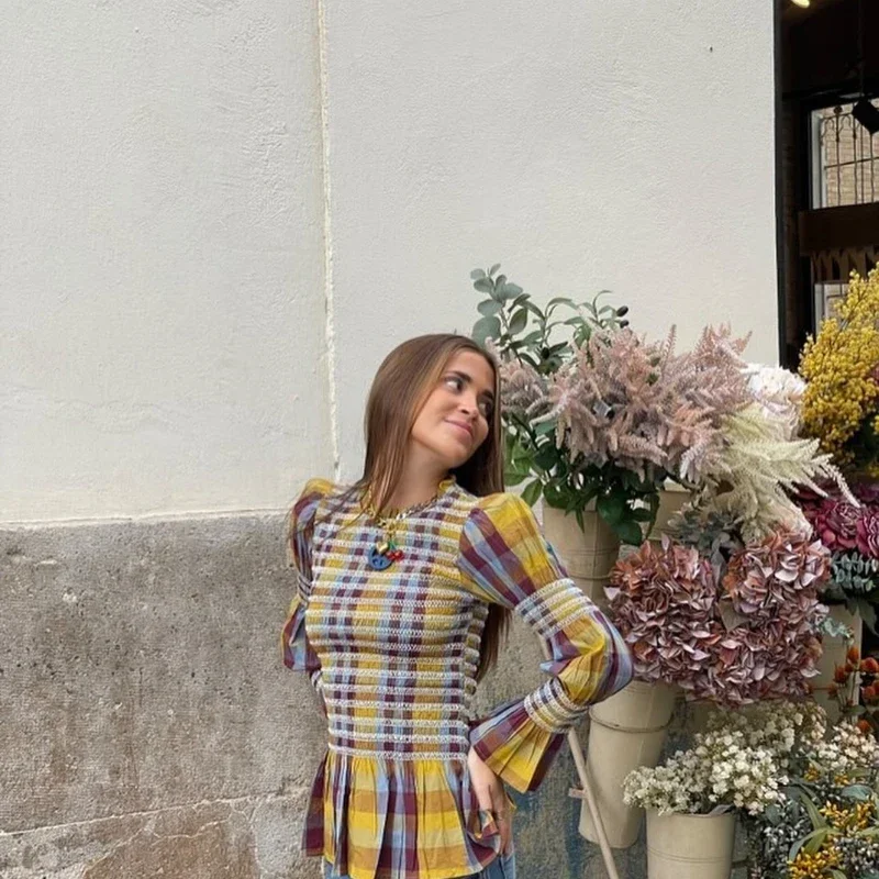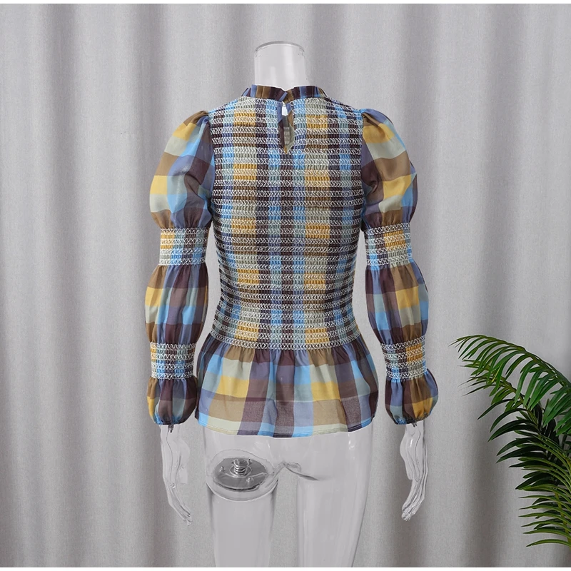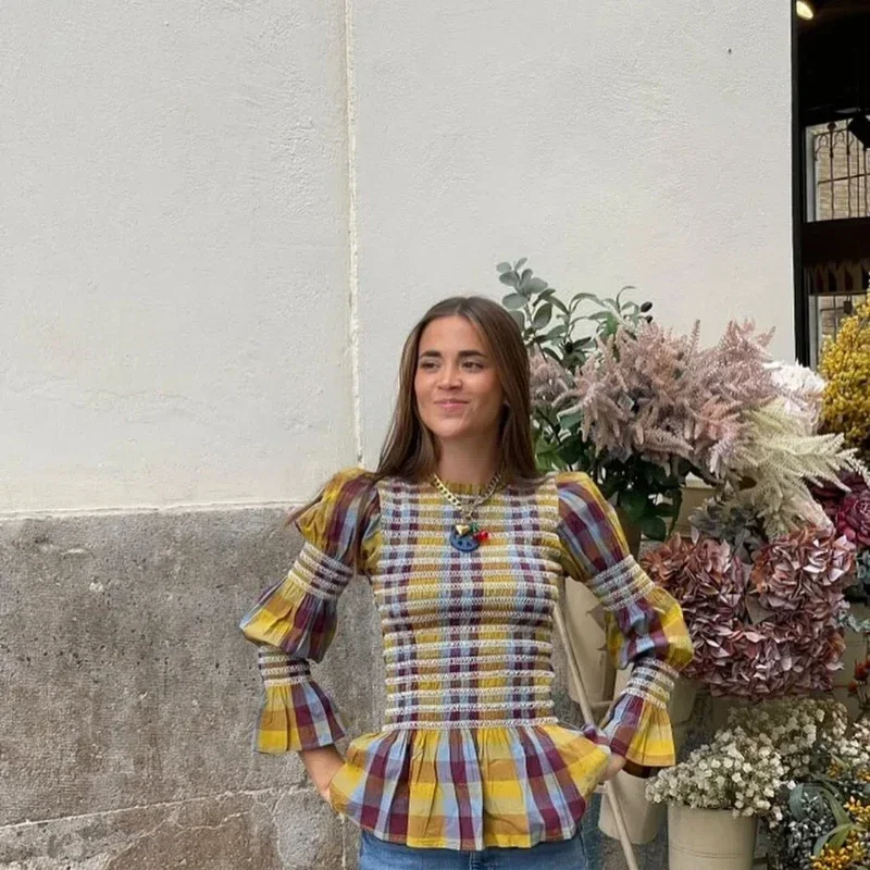 Advbridge Casual Plaid Print Ruffle Hem Blouse For Women Fashion Puff Sleeve O-neck Loose Shirt 2025 Spring Female Loose High Street Tops