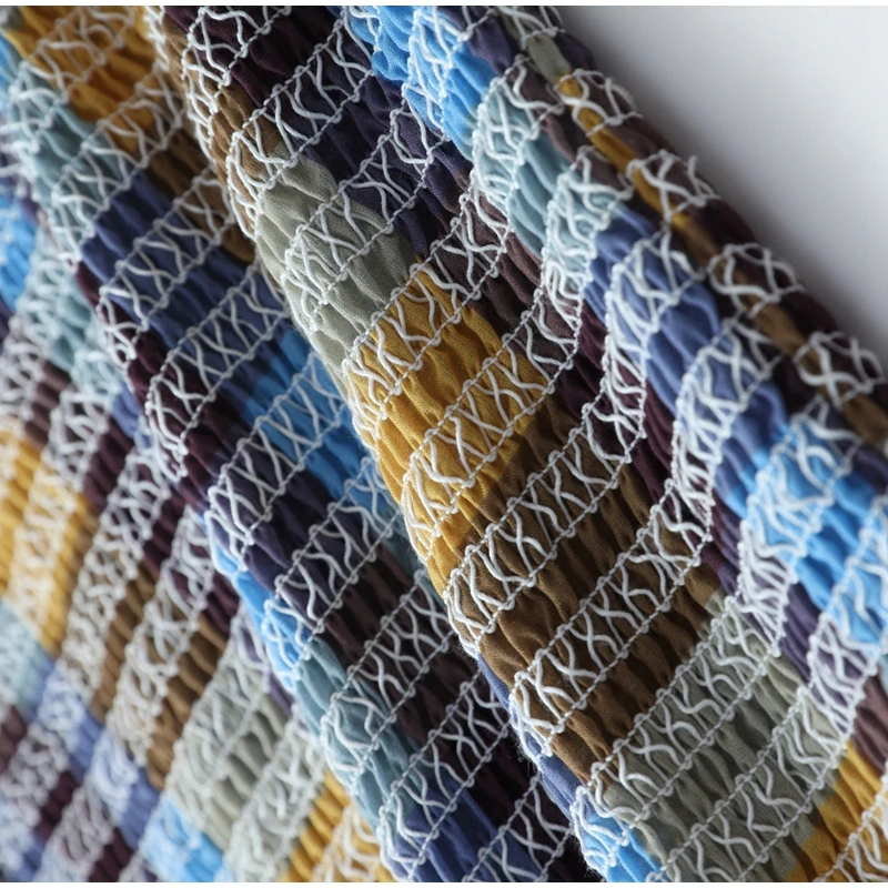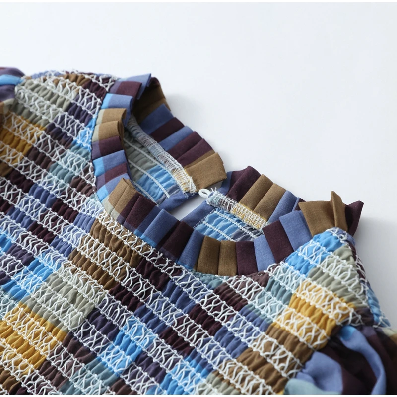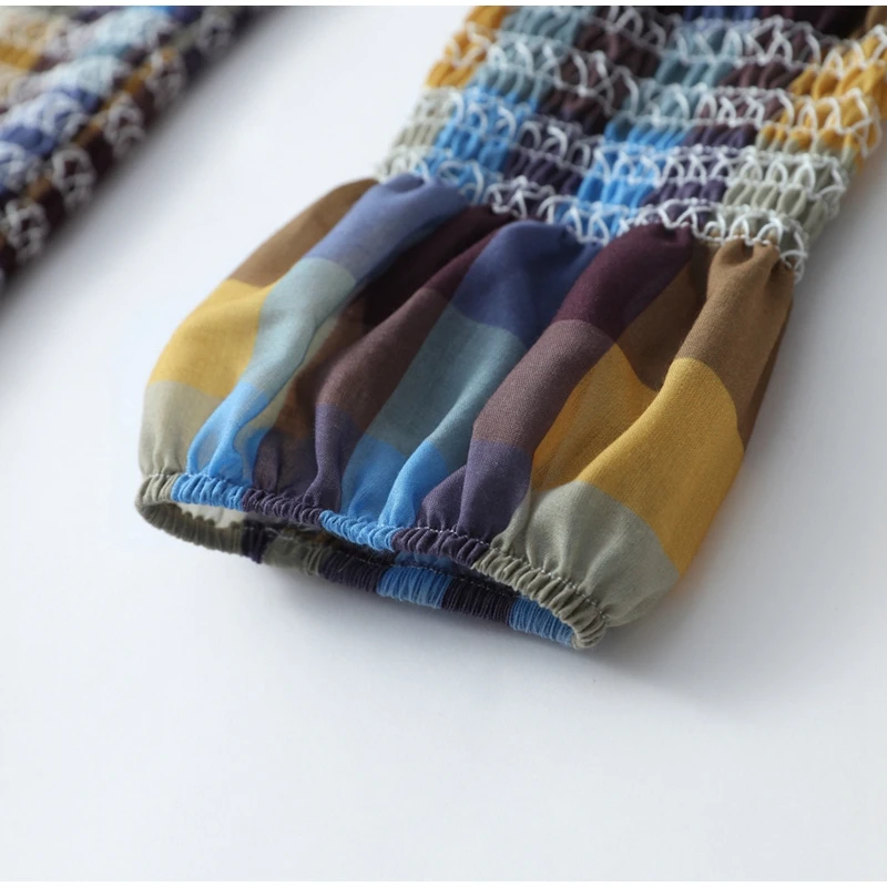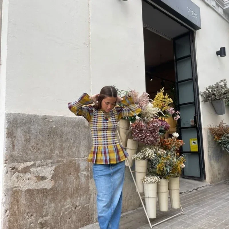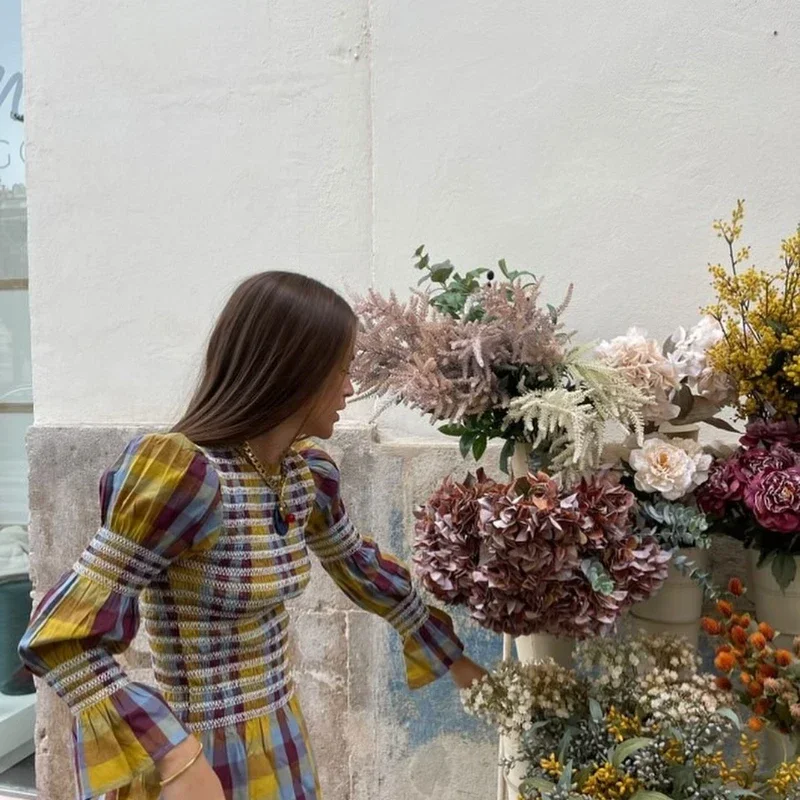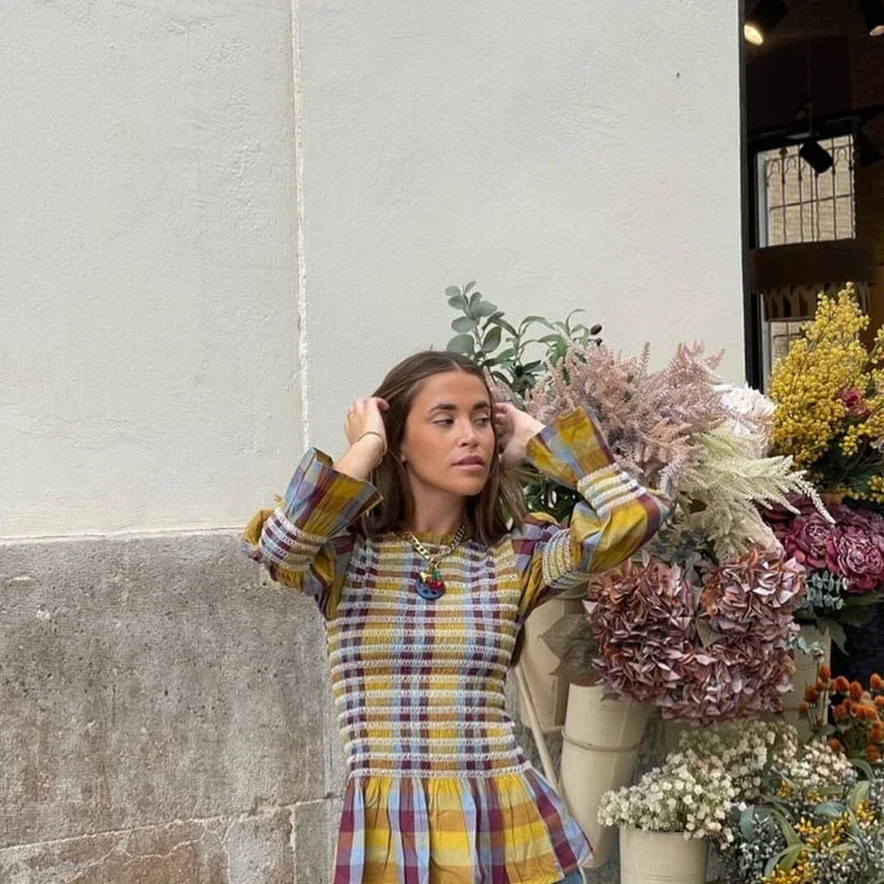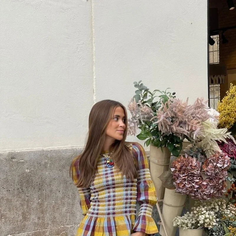 Advbridge Casual Plaid Print Ruffle Hem Blouse For Women Fashion Puff Sleeve O-neck Loose Shirt 2025 Spring Female Loose High Street Tops
