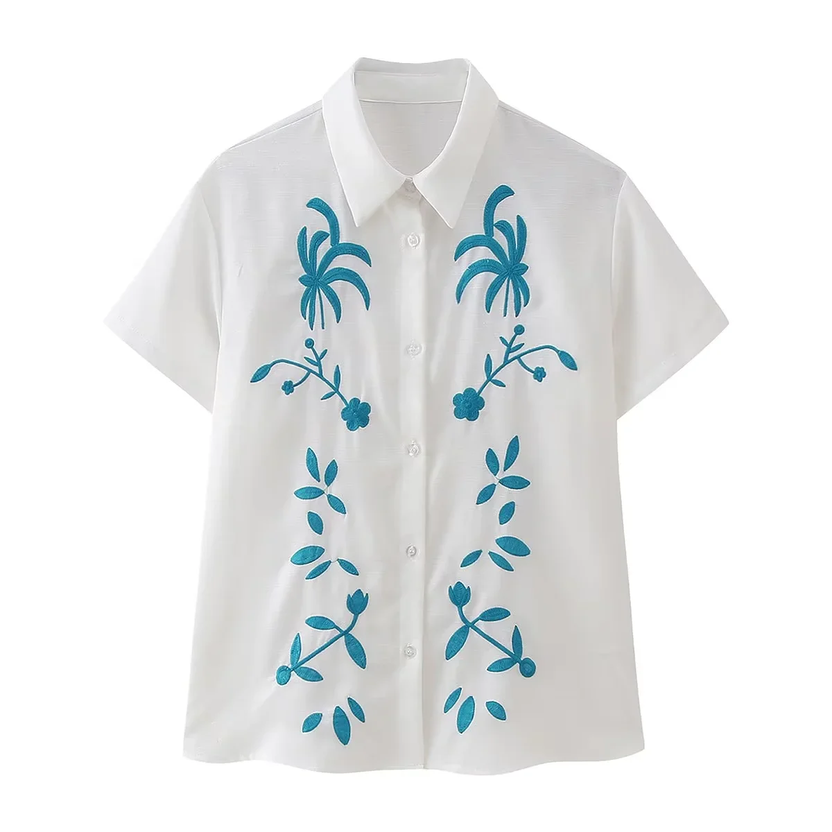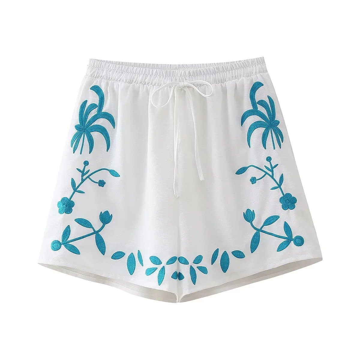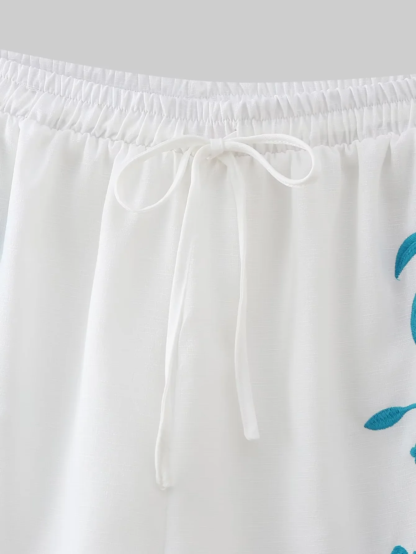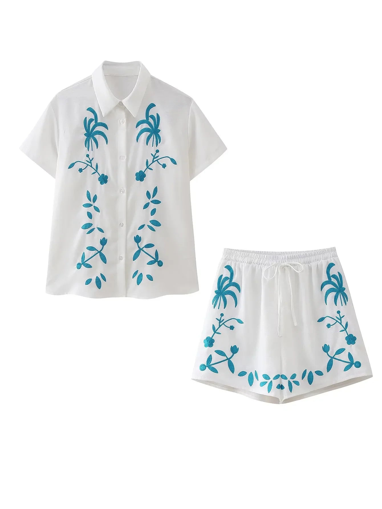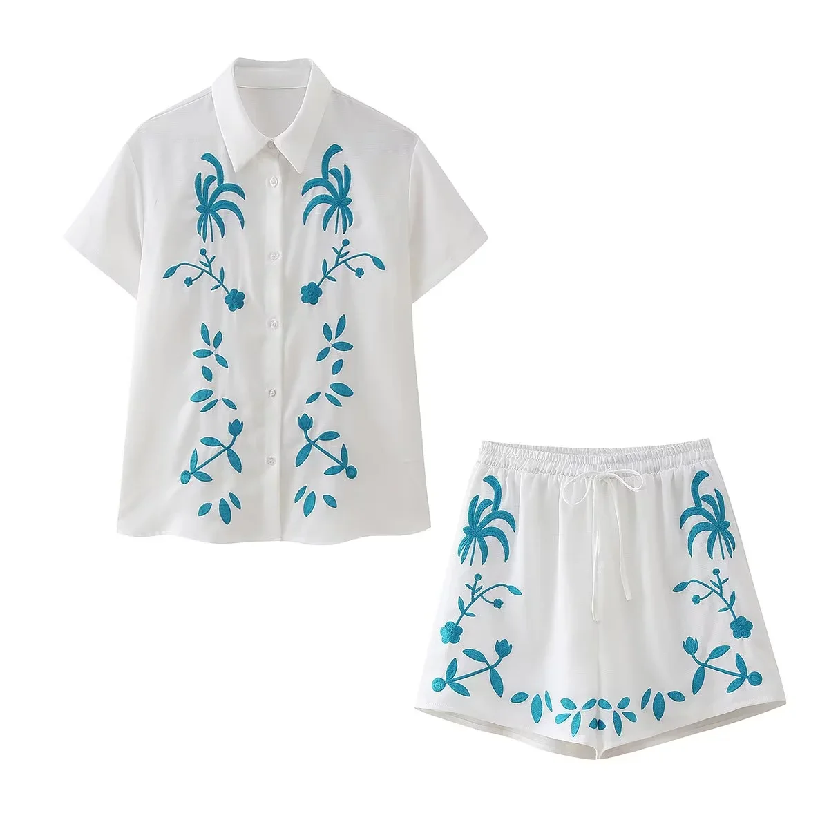 Advbridge Drawstring Embroidery Shorts Sets Women Summer Outfits Casual 2 Pcs Loose Matching Set Suit Turn Down Collar Wide Leg Shorts
